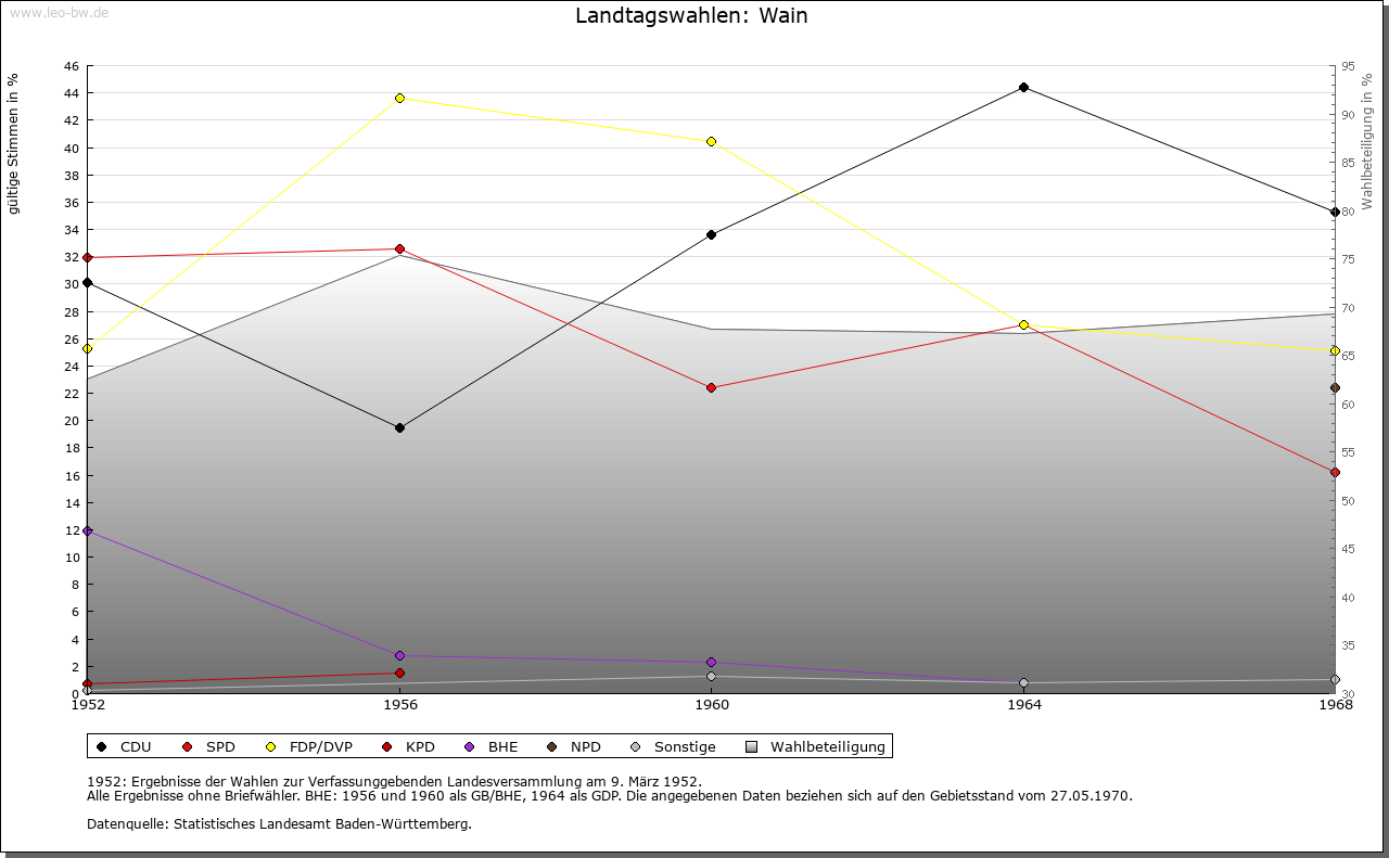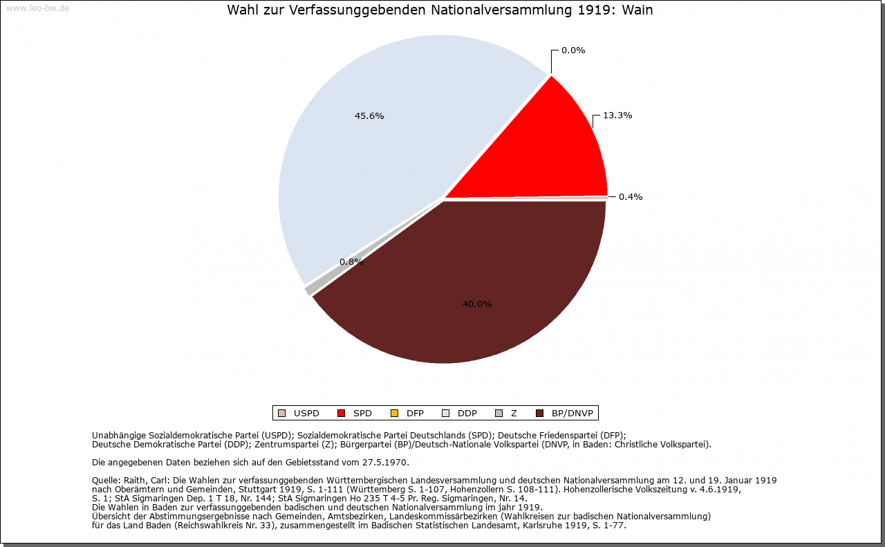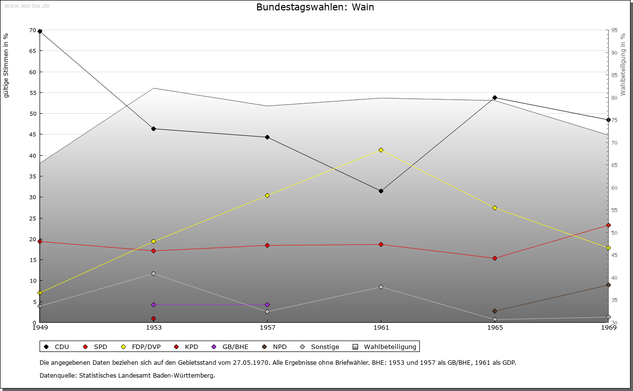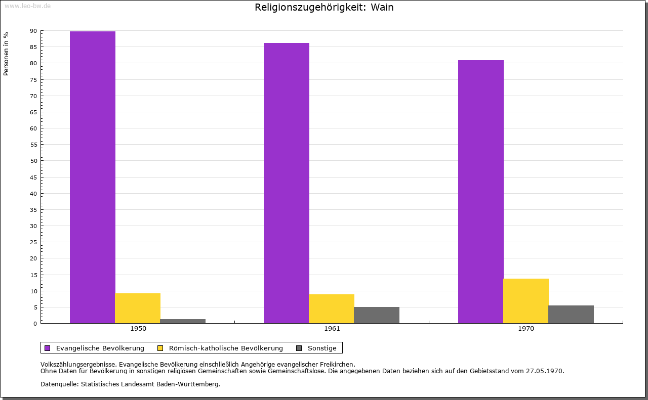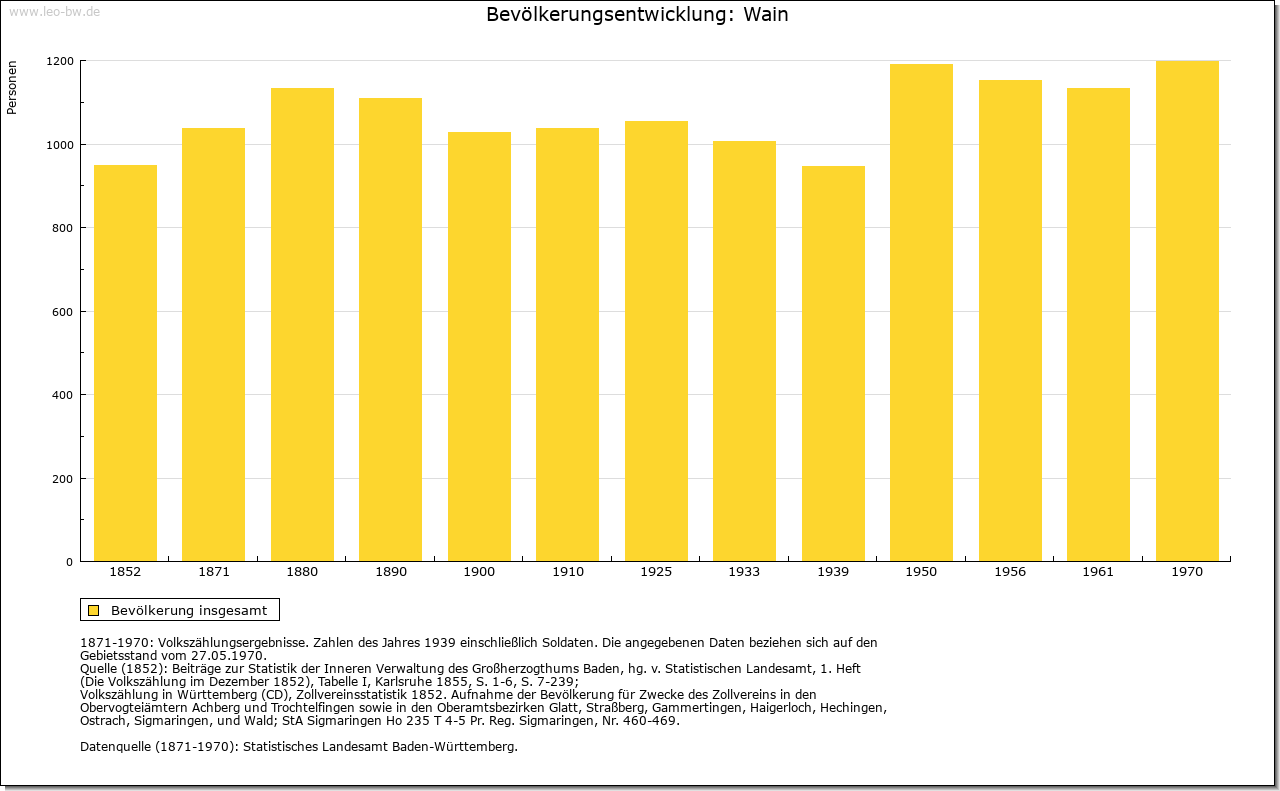 | Geschichte: | 1275 Wiene (ungedeutet), vermutlich hochmittelalterliche Rodesiedlung. Ob die niederadligen, in der 2. Hälfte des 13. Jahrhunderts auftretenden Herren von Wiun (Wiene) hierher gehören, ist unsicher, da es sonst keinen Hinweis auf ortsansässigen Adel gibt. Mitte des 14. Jahrhunderts kam ein Teil der Ortsherrschaft von den Herren von Stotzingen über Graf Heinrich von Werdenberg-Albeck an die Ulmer Bürger Ehinger (1364), die im Laufe des 15. Jahrhunderts noch weitere Güter und Rechte erwarben. 1499 verkauften sie das ganze Dorf an Graf Philipp von Kirchberg, von dessen Erben es 1510 an Kloster Ochsenhausen überging. 1570/71 an die Reichsstadt Ulm, die bis 1773 im Besitz blieb. In Wain, vor allem in dem damals entstandenen Dorfteil Bethlehem, wurden nach 1650 rund 200 bis 300 Glaubensflüchtlinge aus Österreich angesiedelt. 1773 kam das Dorf an den Bankier von Hermann, dem der Besitz zur Reichsherrschaft erhoben wurde. Schloss von 1780 in klassizistischem Stil; vorzügliches Treppenhaus. Wenig oberhalb die abgegangenen Burg, früher Amtssitz der Ulmer Vögte. An der Hauptstraße noch einige ehemalige herrschaftliche Ökonomiegebäude, 1806 kam Wain unter bayerische, 1810 unter württembergische Landeshoheit. Oberamt Wiblingen/ Laupheim, 1938 Landkreis Biberach. |