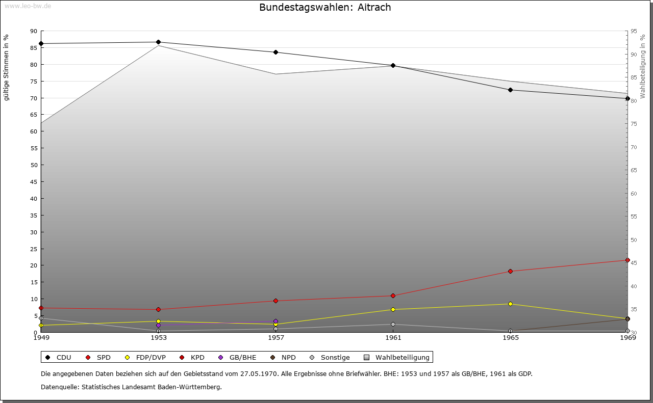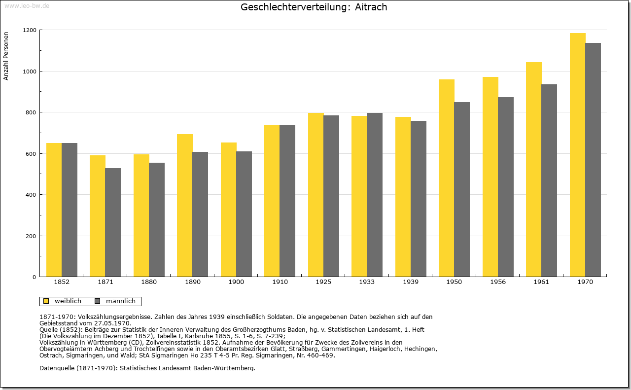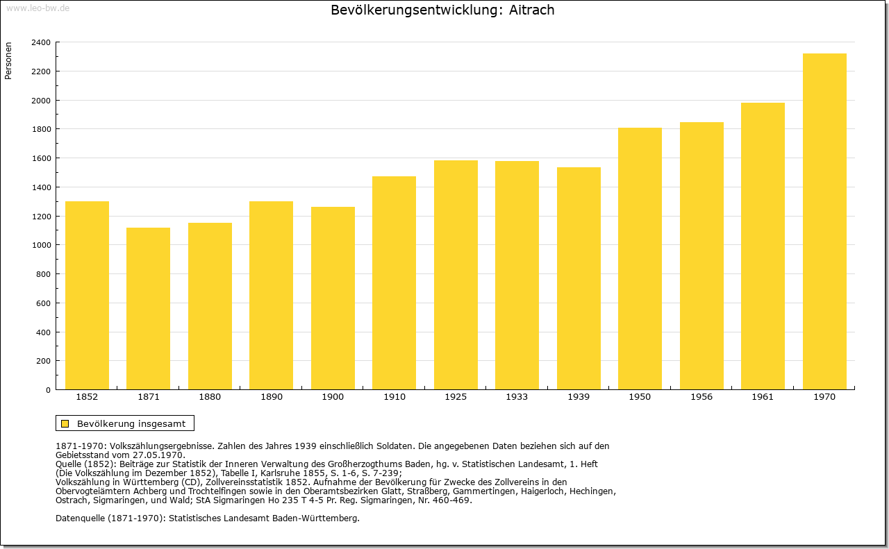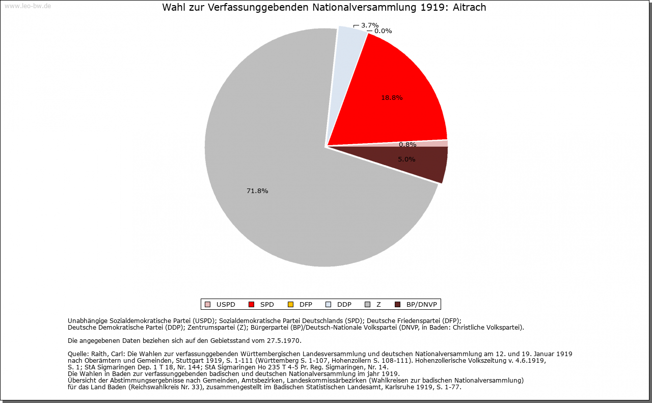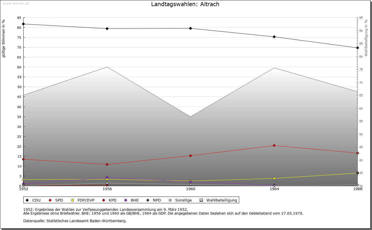 | Geschichte: | 838 (Корie 11. Jahrhundert) Eitraha. Alemannische Reihengräber im Süden. Das Gemeindegebiet umfasst die frühere Herrschaft Marstetten. Diese schenkte König Rudolf 1281 zusammen mit dem Illerzoll an das Kloster Kempten, das den Besitz 1291 bis 1351 an die Herren von Eisenburg, 1351 bis 1566 an die Freiherren von Königsegg und 1566 bis 1803 an das Haus Waldburg (seit 1675 Zeil-Wurzacher Linie) verlieh. Vereinödung 1790/99, danach entstanden die Ortsteile Obermuken, Rank, Stibi und Untermuken. Die Herrschaft kam 1806 unter bayerische und 1810 unter württembergische Oberhoheit. Oberamt Leutkirch, 1938 Landkreis Wangen. Um 1820 wurde die Gemeinde Mooshausen gebildet, 1888 in Aitrach umbenannt. Umgemeindungen 1932 von Häberlings nach Altmannshofen und 1933 von Breitenbach und Rieden nach Aichstetten. |
