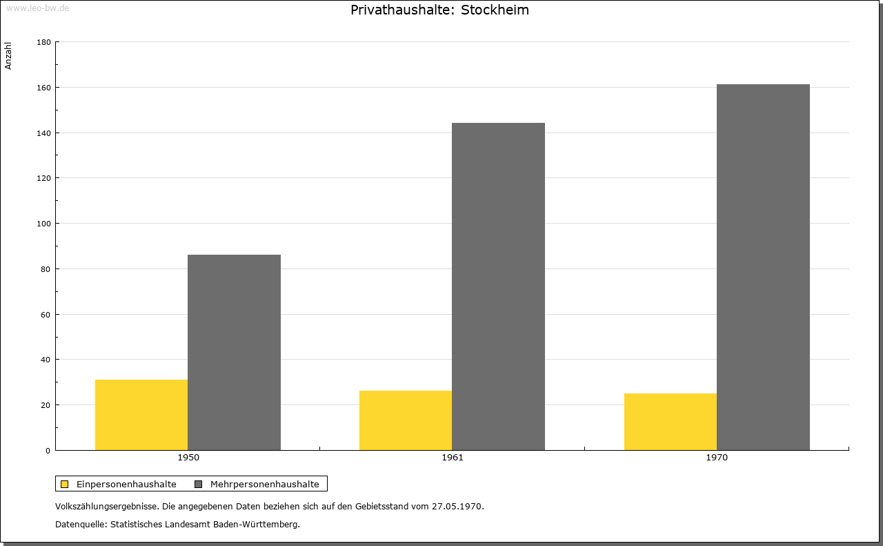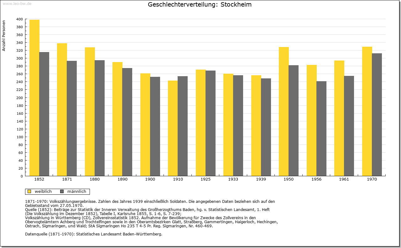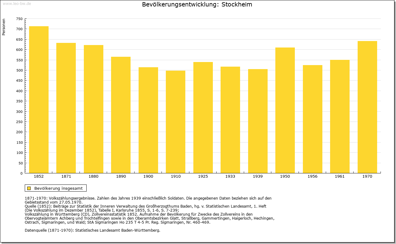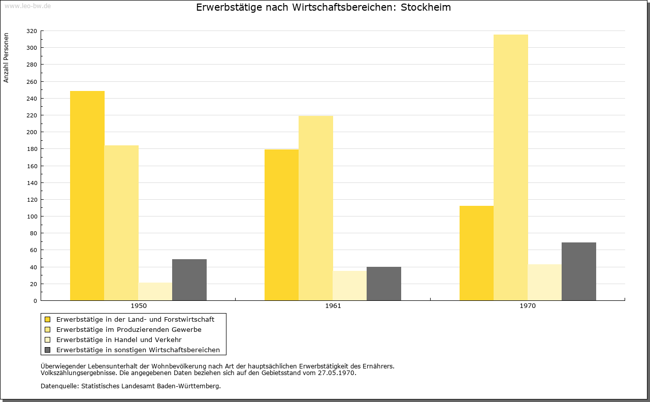 | Wirtschaft und Bevölkerung: | Um die Mitte des 16. Jahrhunderts belief sich die Zahl der Einwohner auf etwa 330. Auch hier bewirkte sodann der Dreißigjährige Krieg einen starken Rückgang der Bevölkerung, jedoch war der frühere Stand bereits um 1700 wiederhergestellt. Um 1800 dürfte die Einwohnerzahl bei etwa 450 gelegen haben. Die Stockheimer Feldflur untergliederte sich in die drei Zelgen auf der Steingrube, auf dem Kissel und gegen das Hochgericht. Neben dem Ackerbau spielte von alters her der Weinbau eine bedeutende Rolle; in der herrschaftlichen Kelter standen 1555 fünf Kelterbäume. |