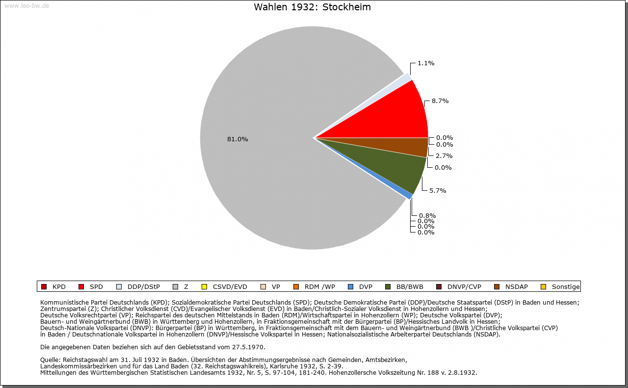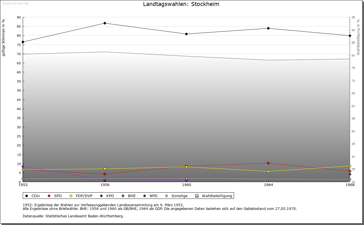 | Geschichte: | Nach Stockheim, wo um 950/76 die Wormser Kirche Gerechtsame an einen Grafen Burchard verlieh, nannte sich in salischer und staufischer Zeit eine Familie des altfreien Adels, die möglicherweise gleichen Stammes war wie die Edelherren von Magenheim. Auf sie dürfte auch die Gründung der in ihrem Kern stauferzeitlichen Burg Stocksberg zurückgehen. Im 13. Jahrhundert führten die Adligen den Namen der Burg wechselsweise neben dem des Dorfs. Ihre Herrschaftsrechte traten sie offenbar um 1300 dem Deutschen Orden ab und bald darauf scheint ihr Mannesstamm erloschen zu sein. 1295 erwarb das Deutsch-Ordens-Haus Ulm Stockheimer Güter der Neipperg, und 1307 verzichtete Württemberg gegenüber dem Orden auf seine Rechte an Schloss Stocksberg. Gleichwohl gaben die Grafen ihre letzten herrschaftlichen Ansprüche erst 1438 definitiv auf. Im zweiten Drittel des 14. Jahrhunderts hatte auf Stocksberg eine eigene Ordenskommende ihren Sitz, allerdings wurde diese schon wenig später mit der des Deutschmeisters in Gundelsheim vereinigt. Bis zum Ende des Mittelalters arrondierte das Deutschmeistertum seine Rechte in Stockheim durch Zukäufe aus dem Besitz der Herren von Magenheim, der Sturmfeder, Sachsenheim, Talheim und Göler von Ravensburg. Um die Mitte des 16. Jahrhunderts schließlich umfassten seine hiesigen Befugnisse alle hohe und niedere Obrigkeit, die Jagd, einen Eigenwirtschaftsbetrieb mit circa 270 Morgen Äckern, 33 Morgen Wiesen, 3 Morgen Weingärten, drei kleinen Weihern, 20 Morgen Ödland, 60 Morgen Wald und drei lichten Eichenwäldern sowie vielerlei Natural- und Geldrenten aus abhängigen Höfen und Gütern. Daneben kommen nur geringfügige Berechtigungen der Klöster Rechentshofen (1376), Maulbronn (vor 1418) und Frauenzimmern (vor 1443), der Herzöge von Württemberg (1530/1610) sowie der Pfarreien und anderer geistlicher Pfründen aus Haberschlacht (1567) und Brackenheim (1570) vor. Zum Neckaroberamt des Deutschen Ordens gehörig, fielen Stockheim und Schloss Stocksberg 1805 an das Königreich Württemberg. Ein Anteil am Fruchtzehnt zu Stockheim gelangte 1351 von den Enzberg an das Kloster Rechentshofen. 1555 waren am Groß- und Weinzehnt der Deutsche Orden zu einem Sechstel sowie Rechentshofen und die Pfarrei Stockheim zu je einem Drittel beteiligt. Über den ehedem Rechentshofer Anteil verfügte 1610 Württemberg. Schließlich hatte der Orden die Hälfte des Fruchtzehnten; in die andere Hälfte teilten sich die geistliche Verwaltung Brackenheim (wegen Rechentshofen, 2/3) und die Frühmesse zu Niederhofen (1/3). Den Weinzehnt hatten zu sieben Achteln der Orden und zu einem Achtel die Niederhofer Frühmesse. Der Kleinzehnt stand insgesamt dem Ortspfarrer zu (1555). Das Gericht war Mitte des 16. Jahrhunderts mit zwölf Schöffen besetzt; daneben gab es zwei besondere Fürsprecher. Bereits 1496 bildeten die Gerichtsschöffen zusammen mit sechs weiteren Personen das Gremium der Achtzehner, das als Rat fungierte. Der für Appellationen zuständige Oberhof war das Gericht in der deutschmeisterlichen Residenz Gundelsheim. 1552 treten Schultheiß, Bürgermeister und Richter des Dorfs Stockheim als Siegler einer Urkunde in Erscheinung; ihr Siegel trug die Umschrift »des Gerichts und Dorfs Stockheim« und zeigte ein mit Zinnen bewehrtes Schloss. Im Bauernkrieg zogen die Stockheimer fast ausnahmslos auf das Schloss Stocksberg, plünderten es und setzten es in Brand (16./17. April 1525); anschließend wurden sie hart bestraft und mussten den angerichteten Schaden wiedergutmachen. Stockheim gehörte bis zum 1.10.1938 zum Oberamt Brackenheim. |