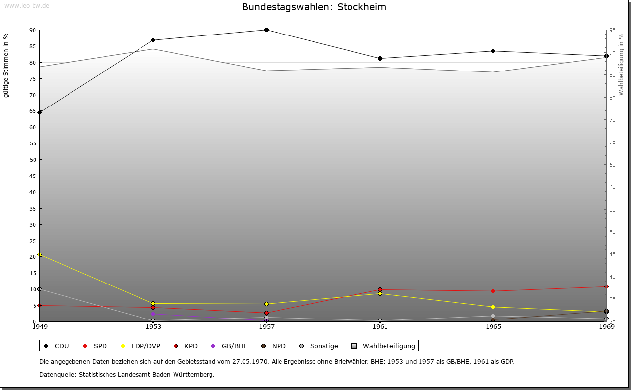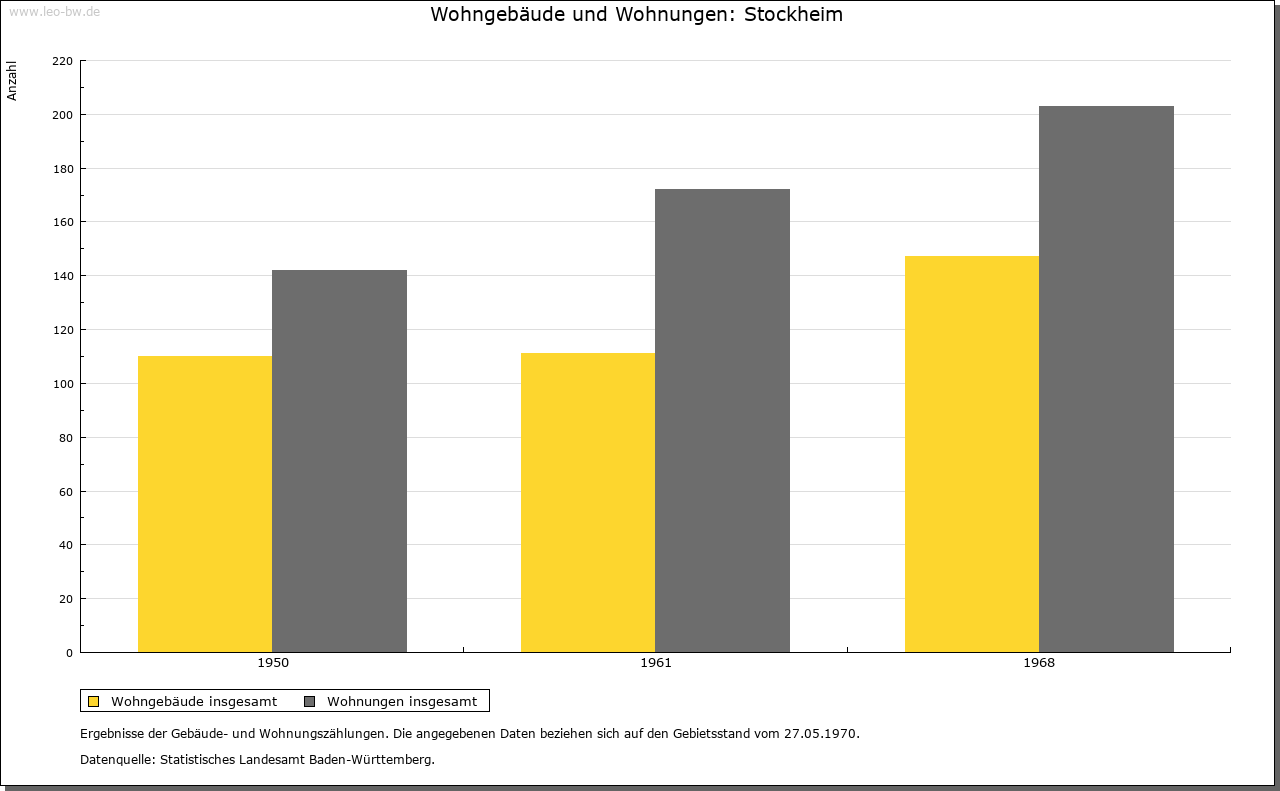 | Ortslage und Siedlung (bis 1970): | Durch seinen Namen gibt Stockheim (um 950/76 »Stochheim«, um 1140 »Stockenn«) sich als Ausbausiedlung zu erkennen. Das Bestimmungswort beschreibt die bei der Rodung stehengebliebenen Baumstümpfe (mittelhochdeutsch »stoc«); das Grundwort -heim dürfte auf einer Analogiebildung beruhen. Ob freilich der Ort schon im frühen oder erst im hohen Mittelalter entstanden ist, lässt sich kaum mehr entscheiden. Im Gewann Puhäcker, südlich des Dorfs, kamen Spuren vor- und frühgeschichtlicher Besiedlung zutage. 1555 bestand Stockheim aus 74 Häusern und drei unbebauten Hofstätten. Der Ort ist im Norden von Weinhängen umgeben und im Оsten durch ein neues Wohngebiet (1965/69) baulich größer geworden. Spätmanieristisches Deutschordens-Amtshaus von 1604 mit Treppenturm, renoviert 1960; heute Rathaus. |