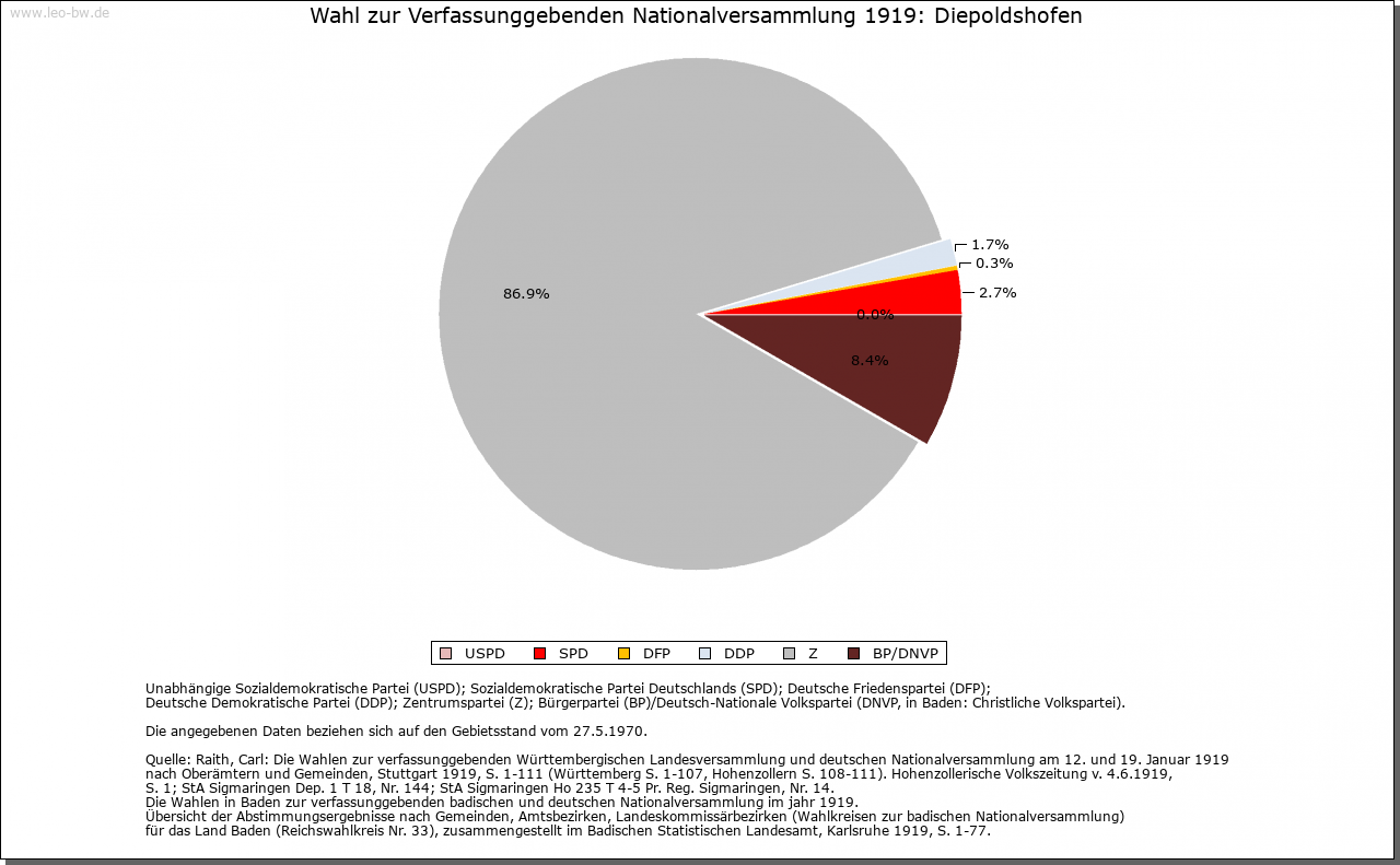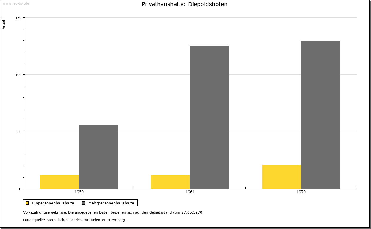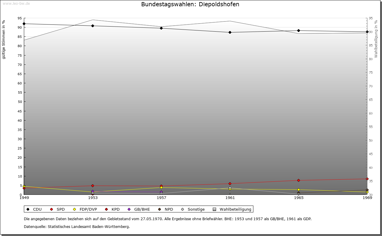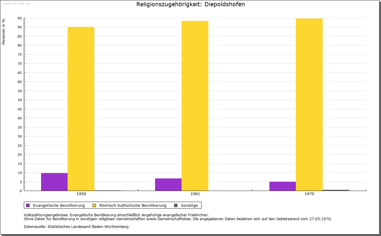 | Geschichte: | 1152 (Корie 12. Jahrhundert) Dipoldeshoven, 1247 Diepolteshoven. Herren von Diepoldshofen, Edelfreie (?). Im 13. Jahrhundert Besitz der Klöster Baindt, Isny (bis ins 16. Jahrhundert) und Rot (nur 13. Jahrhundert). Gehörte zum ehemaligen Gericht »oberes Tal« der Grafschaft Zeil, die die Landesherrschaft ausübte und zum Großteil auch Grundherr war. Von 1620 bis Ende des 17. Jahrhunderts Station der Reichspost Füssen-Ensisheim, die dann nach Leutkirch verlegt wurde. 1806 mit der Grafschaft an Württemberg. 1810 Oberamt Leutkirch, 1938 Landkreis Wangen. Zunächst (1810) der Oberschultheißerei Zeil-Zeil unterstellt, entstand um 1820 die Gemeinde. Diese war bis 1849 dem fürstlich Waldburg-Zeilschen und Trauchburgischen Amt in Zeil zugeordnet. Keine Vereinödung. Im 19. Jahrhundert entstanden von Diepoldshofen aus die Ortsteile Bergkönig und Staighaus. |