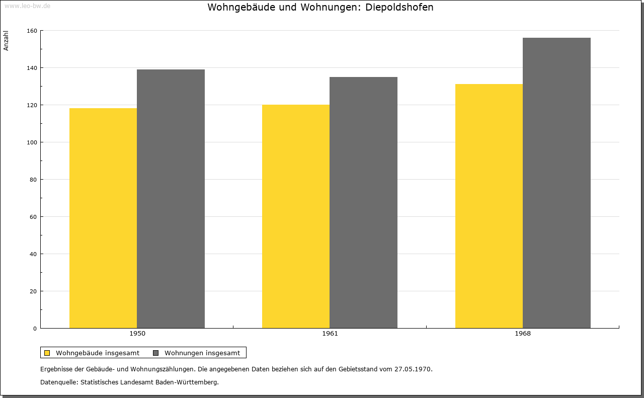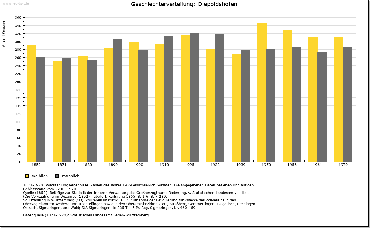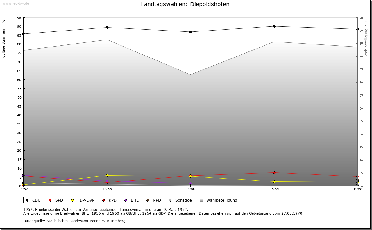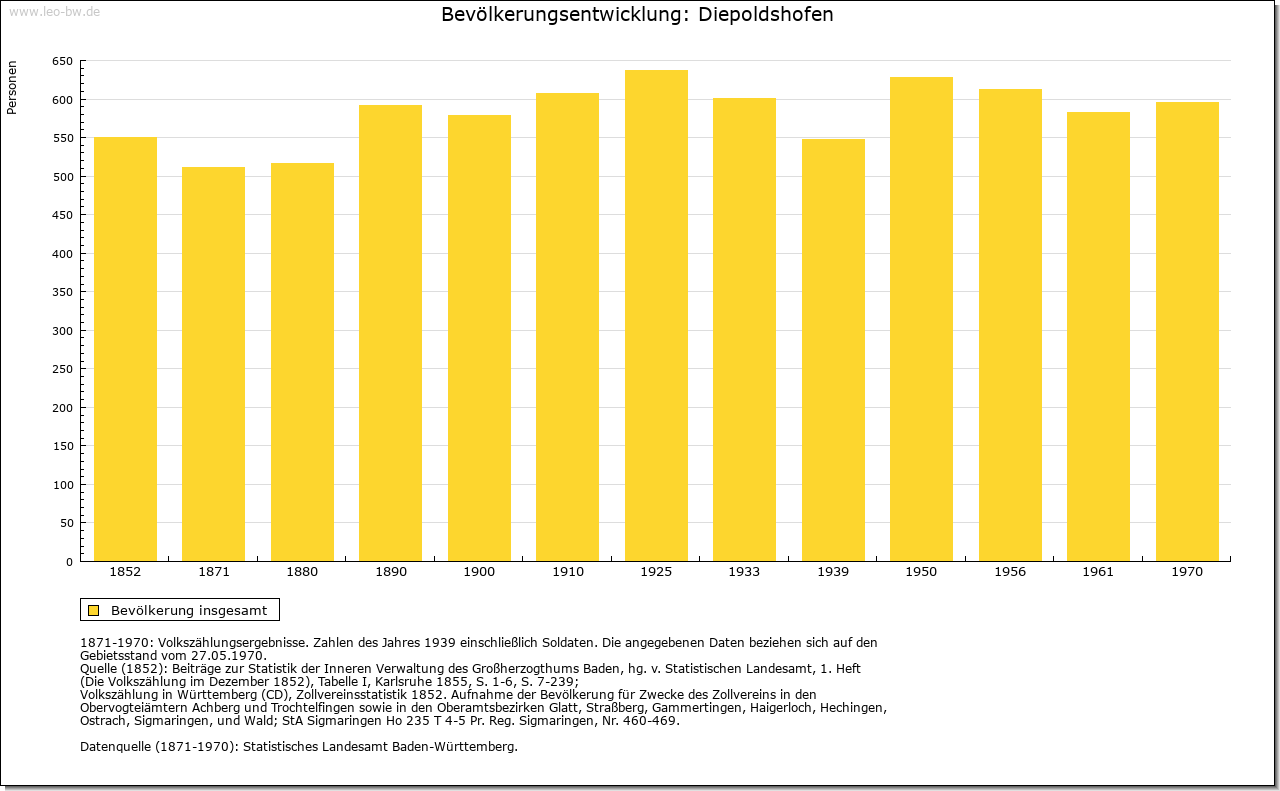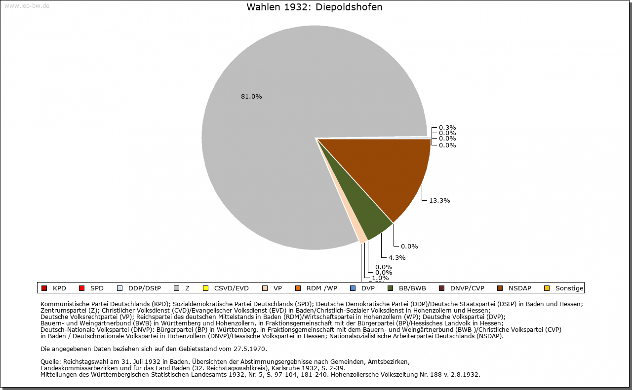 | Geschichte: | 1152 (Корie 12. Jahrhundert) Dipoldeshoven, 1247 Diepolteshoven. Herren von Diepoldshofen, Edelfreie (?). Im 13. Jahrhundert Besitz der Klöster Baindt, Isny (bis ins 16. Jahrhundert) und Rot (nur 13. Jahrhundert). Gehörte zum ehemaligen Gericht »oberes Tal« der Grafschaft Zeil, die die Landesherrschaft ausübte und zum Großteil auch Grundherr war. Von 1620 bis Ende des 17. Jahrhunderts Station der Reichspost Füssen-Ensisheim, die dann nach Leutkirch verlegt wurde. 1806 mit der Grafschaft an Württemberg. 1810 Oberamt Leutkirch, 1938 Landkreis Wangen. Zunächst (1810) der Oberschultheißerei Zeil-Zeil unterstellt, entstand um 1820 die Gemeinde. Diese war bis 1849 dem fürstlich Waldburg-Zeilschen und Trauchburgischen Amt in Zeil zugeordnet. Keine Vereinödung. Im 19. Jahrhundert entstanden von Diepoldshofen aus die Ortsteile Bergkönig und Staighaus. |