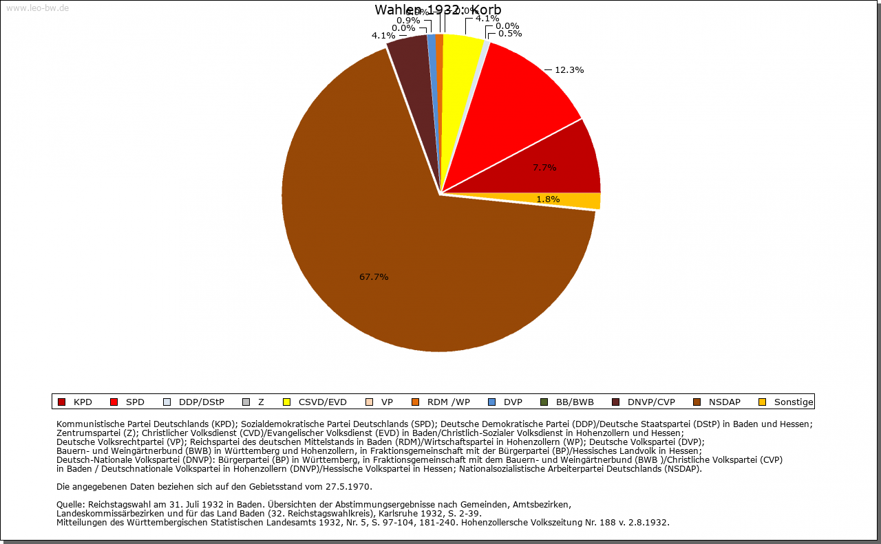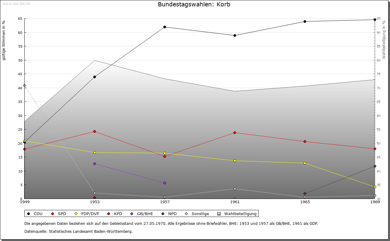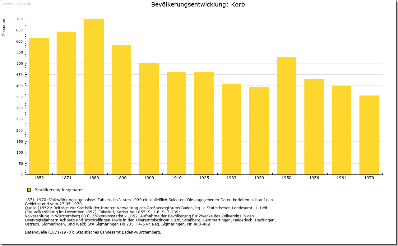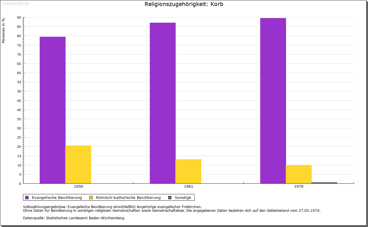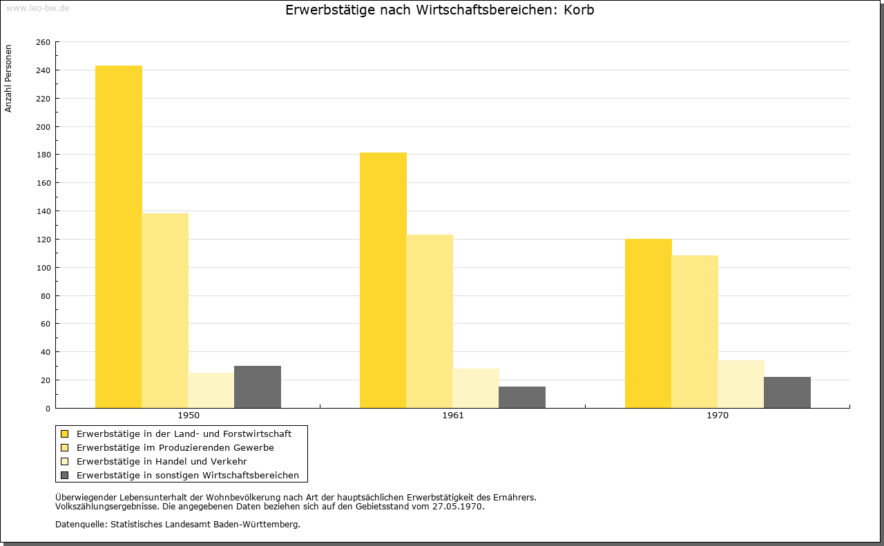 | Wirtschaft und Bevölkerung: | Die Zahl der Untertanen zu Korb wird 1706 mit dreißig angegeben, woraus auf etwa 130 Personen zu schließen ist. Ihren Lebensunterhalt fand die Bevölkerung im Ackerbau und in der Viehzucht; Weinbau spielte nur eine ganz marginale Rolle. |