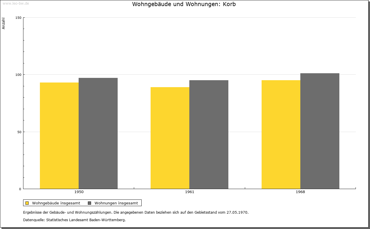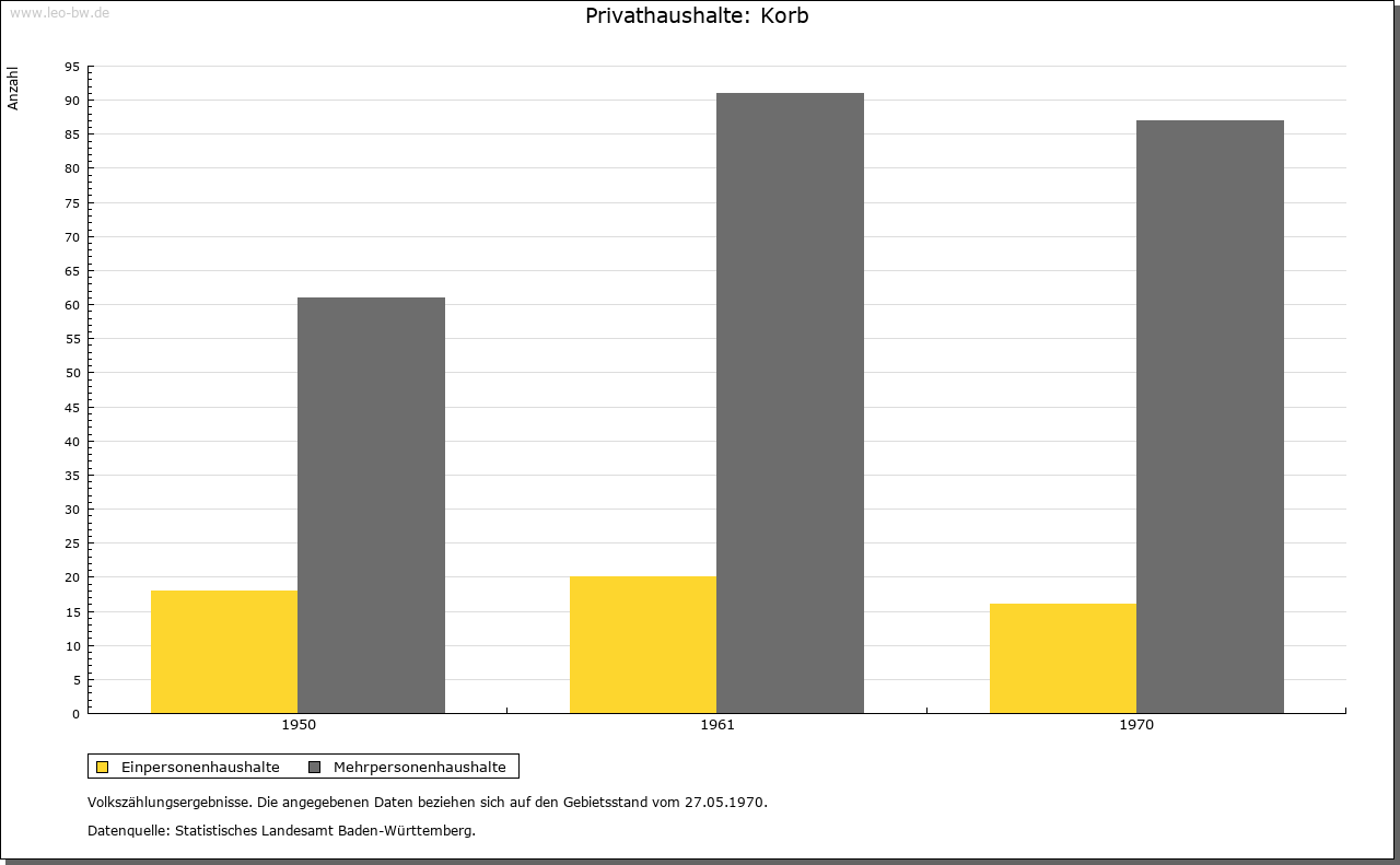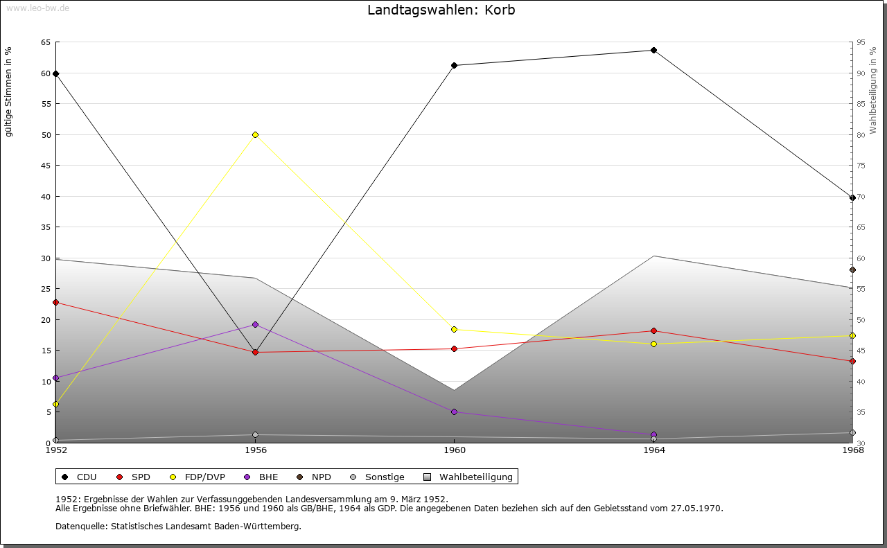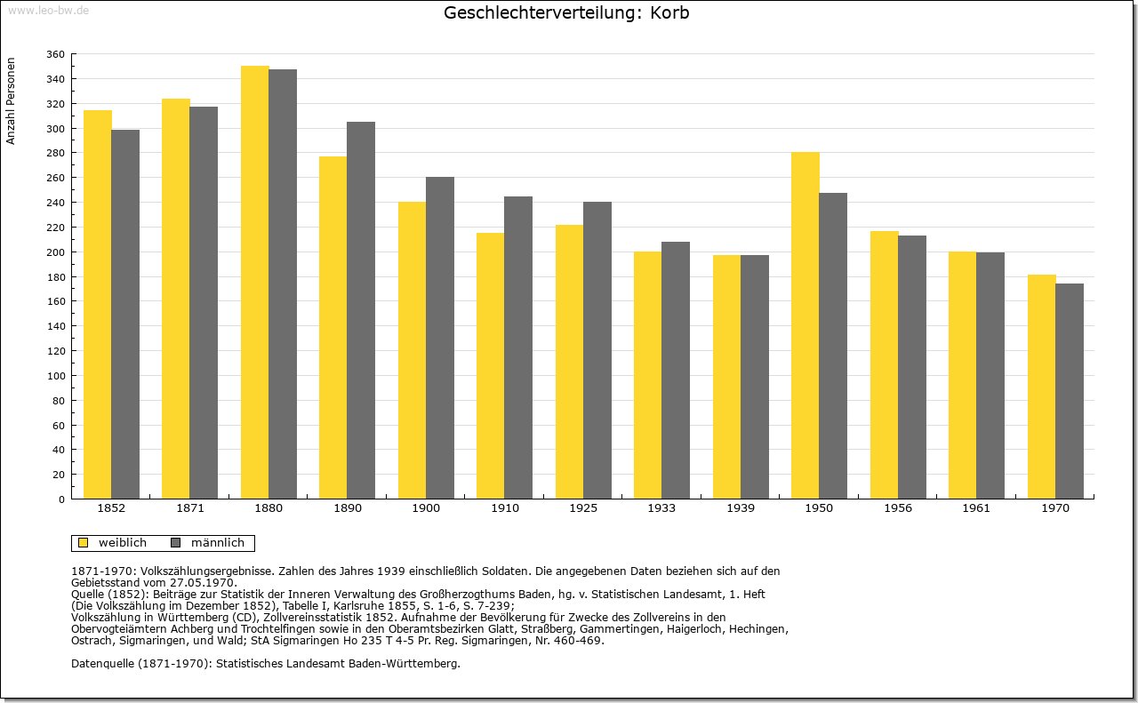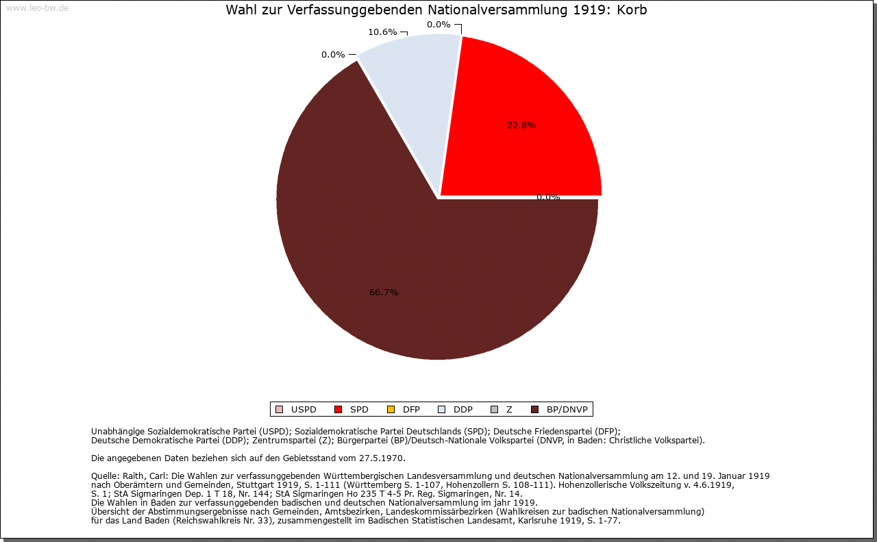 | Wirtschaft und Bevölkerung: | Die Zahl der Untertanen zu Korb wird 1706 mit dreißig angegeben, woraus auf etwa 130 Personen zu schließen ist. Ihren Lebensunterhalt fand die Bevölkerung im Ackerbau und in der Viehzucht; Weinbau spielte nur eine ganz marginale Rolle. |