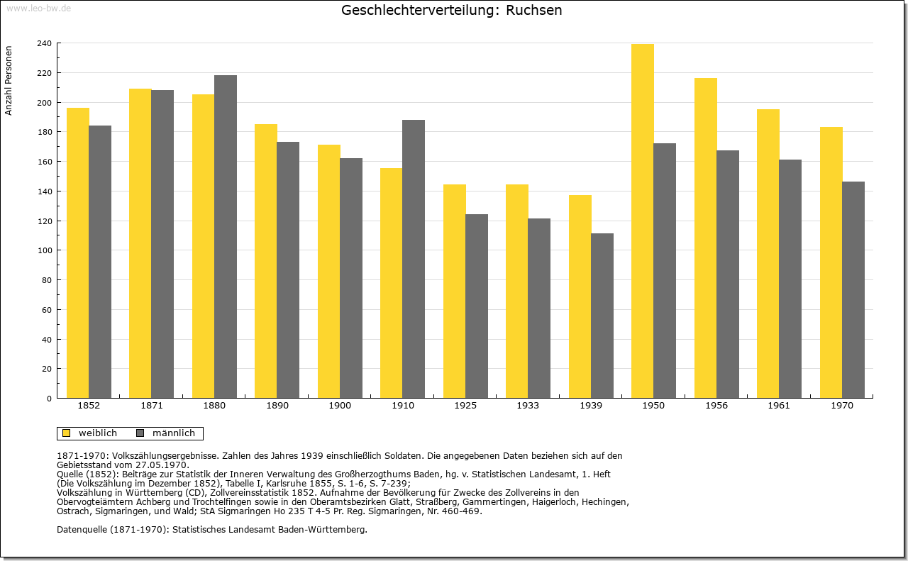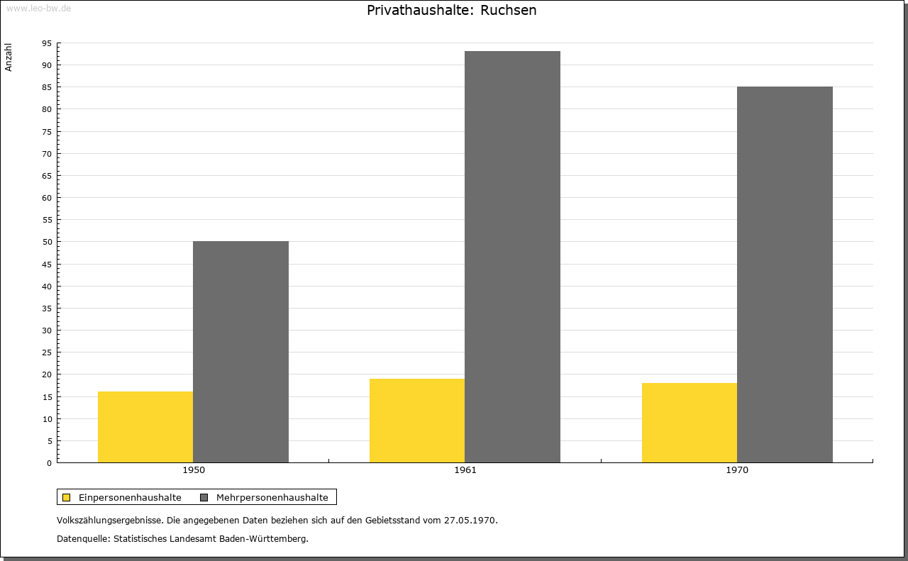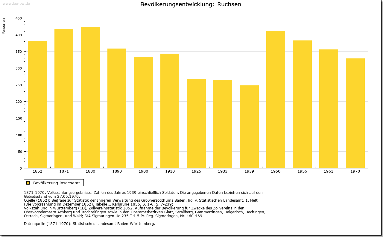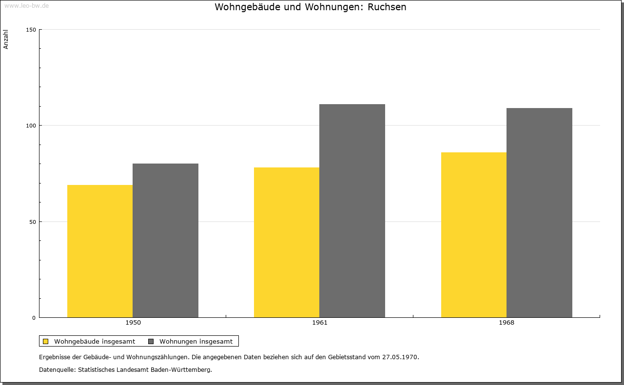 | Wirtschaft und Bevölkerung: | Mit 54 Gemeindebürgern und zwei Beisassen hatte Ruchsen 1806 etwa 250 Einwohner, darunter einige wenige Handwerker. Die wirtschaftlichen Verhältnisse werden um die gleiche Zeit als mittelmäßig beschrieben, die Erträge der Landwirtschaft gleichwohl als hinreichend. Der Viehbestand belief sich auf zwölf Pferde, 143 Rinder und 85 Schweine. Der Weinbau beschränkte sich auf 80 Morgen. Eine Kelter ist seit 1354 bezeugt, eine Mühle bereits 1274. |