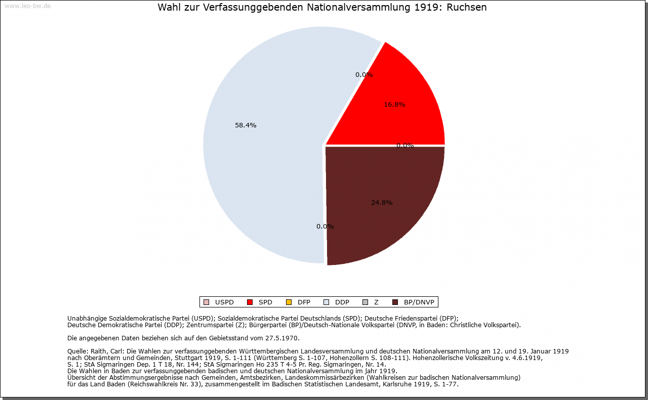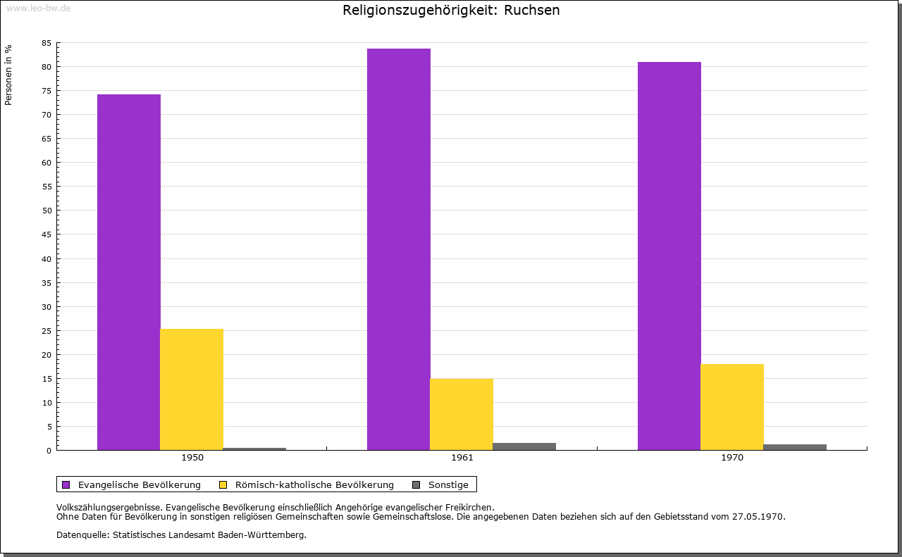 | Kirche und Schule: | Kirchlich gehörte Ruchsen zur Mosbacher Patronatspfarrei Möckmühl (1330). Spätestens seit 1367 gab es einen eigenen Pfarrer, der ebenso wie jener in Möckmühl vom Stiftspropst in Mosbach bestellt wurde. Mit der Aufhebung des Julianen-Stifts fiel das Patronatsrecht an die Kurpfalz, der es 1556/59 gelang, ungeachtet der kurmainzischen Ortsherrschaft die Reformation einzuführen. Freilich blieben die Rechte an der Kirche bis zum Ende des Alten Reiches umstritten, wodurch schließlich das auch im benachbarten württembergischen Möckmühl geltende lutherische Bekenntnis die Oberhand gewann. Die Anfänge des örtlichen Schulwesens dürften in die Zeit unmittelbar nach der Reformation zurückreichen. Evangelische Kirche von 1823, wohl unter Verwendung eines alten Chorturms. Zur Pfarrei gehören Herbolzheim, Neudenau und Stein am Kocher. Die Pfarrei seit 1.1. 1976 bei der Württemberger evangelischen Landeskirche. Katholiken zu Adelsheim (Neckar-Odenwald-Kreis). |