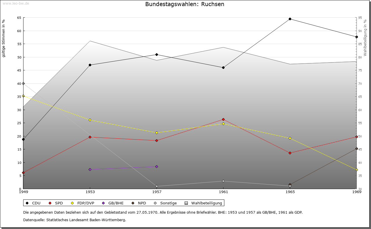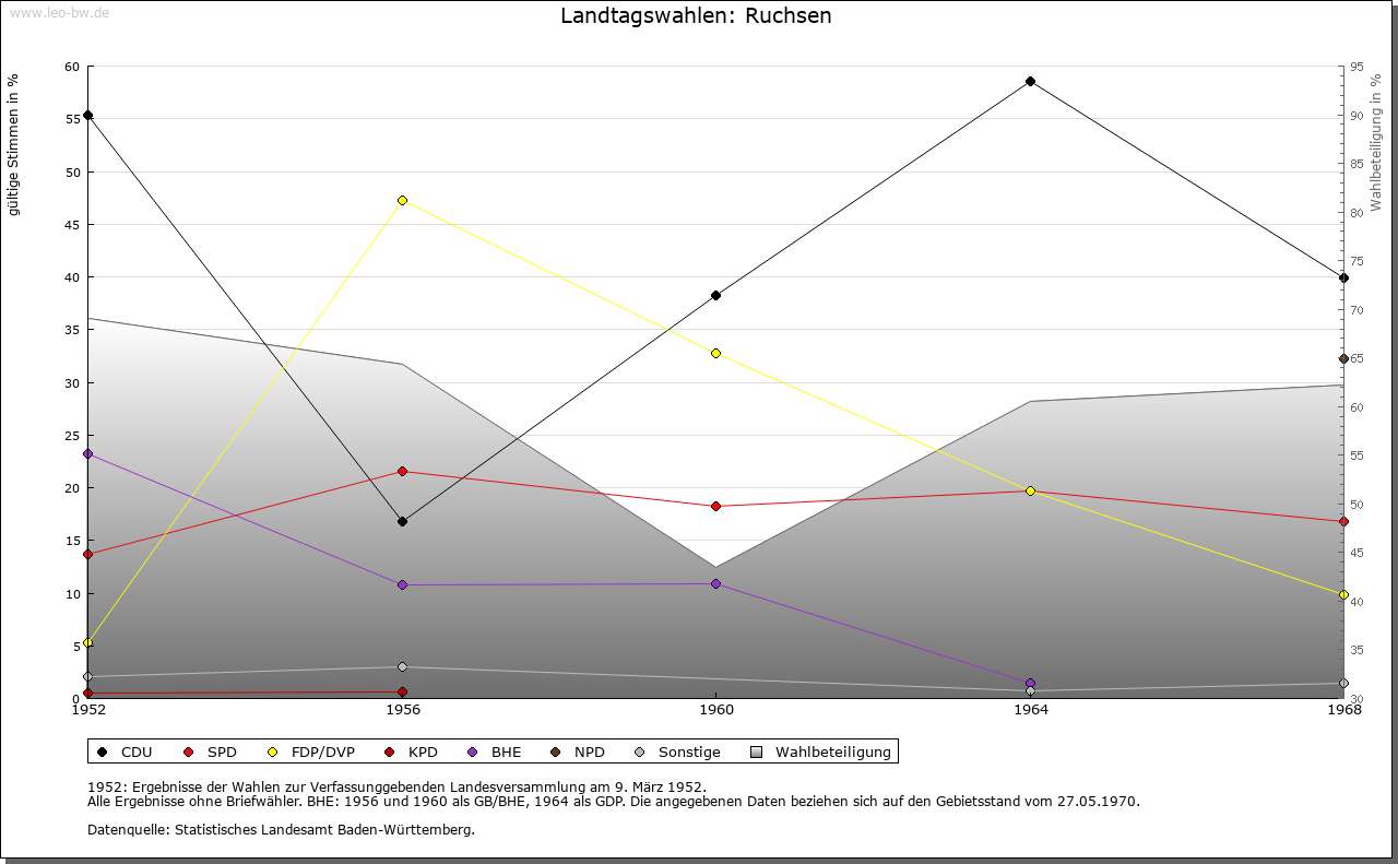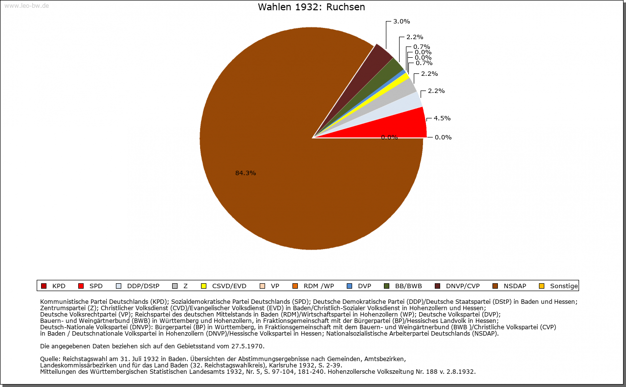 | Geschichte: | Die mittelalterliche Herrschaftsbildung in Ruchsen dürfte in dem umfangreichen Güterbesitz gewurzelt haben, über den die Klöster Lorsch (769/95) und Fulda (815/16) hier verfügten. Bereits im letzten Viertel des 11. Jahrhunderts ist eine Burg (»munitio«) bezeugt, und bei den 1085/96 vorkommenden Adligen »de Ruchesheim«, die dem Kloster Komburg verbunden waren, könnte es sich um Vögte über diesen geistlichen Besitz gehandelt haben. Vermutlich über die Grafen von Lauffen gelangte der Ort im 13. Jahrhundert an die Edelherren von Dürn und schließlich im Ergebnis zahlreicher Güterschenkungen an das Kloster Seligental, dem 1464 die Vogts- und Gerichtsherrschaft allein zustand. Mit der zentlichen Obrigkeit gehörte Ruchsen nach Möckmühl. Mit dem Ende des Klosters Seligental fiel das Dorf 1568 an das Erzstift Mainz, im Zuge der Säkularisation 1802 an das Fürstentum Leiningen und infolge der Mediatisierung 1806 an das Großherzogtum Baden. Neben dem der Zisterzienserinnen von Seligental (in der frühen Neuzeit des Erzstifts Mainz) scheint es während des späten Mittelalters in Ruchsen keinen größeren Grundbesitz gegeben zu haben. 1272/73 kauften die Nonnen einen Hof des Klosters Schöntal, den dieses seinerseits von den Berlichingen erworben hatte. 1482 beziehungsweise 1506 bezogen die Neipperg und Zylnhardt als Ganerben zu Widdern Zinse aus dem Dorf, und später sind noch Liegenschaften und Einkünfte des Stifts Möckmühl (1559), der Liebfrauen-, St. Katharinen- und St. Georgs-Pfründen in Möckmühl (1570) sowie des Klosters Amorbach (1610) bezeugt. Teile des Zehnten waren 1273 im Besitz der Dürner Ministerialen Zehe von Bödigheim. Insgesamt zwei Drittel des Frucht- und Weinzehnten erwarb das Kloster Seligental 1275/78 von den Edelherren von Dürn und 1321 von den Ritteradligen von Rosenberg. Das übrige Drittel stand dem Stift Mosbach zu (2. Hälfte 15. Jahrhundert). 1610 beanspruchten die von Rosenbach als Erben der von Hardheim ein Drittel des großen und kleinen Zehnten. Das örtliche Gericht war 1806 mit dem Schultheißen, zwei Schöffen und dem Bürgermeister besetzt. Der Gemeindebesitz umfasste zur gleichen Zeit 300 Morgen Wald, ein paar Wiesen, ein Schul-, Schaf- und Hirtenhaus mit Schafscheune sowie Einkünfte aus der Schäferei. Ab dem 15.11.1810 gehörte Ruchsen zum standesherrlichen Amt Osterburken, 1828 standesherrliches Amt Adelsheim, 1.5.1841 großherzoglich fürstlich-leiningisches Amt Mosbach, 15.11.1849 Bezirksamt Adelsheim, 1.10.1936 Bezirksamt Buchen, 25.6.1939 Landkreis Buchen. |