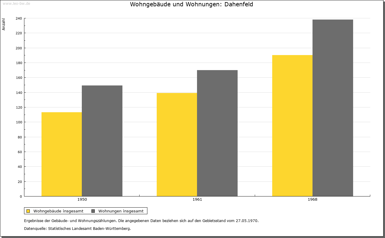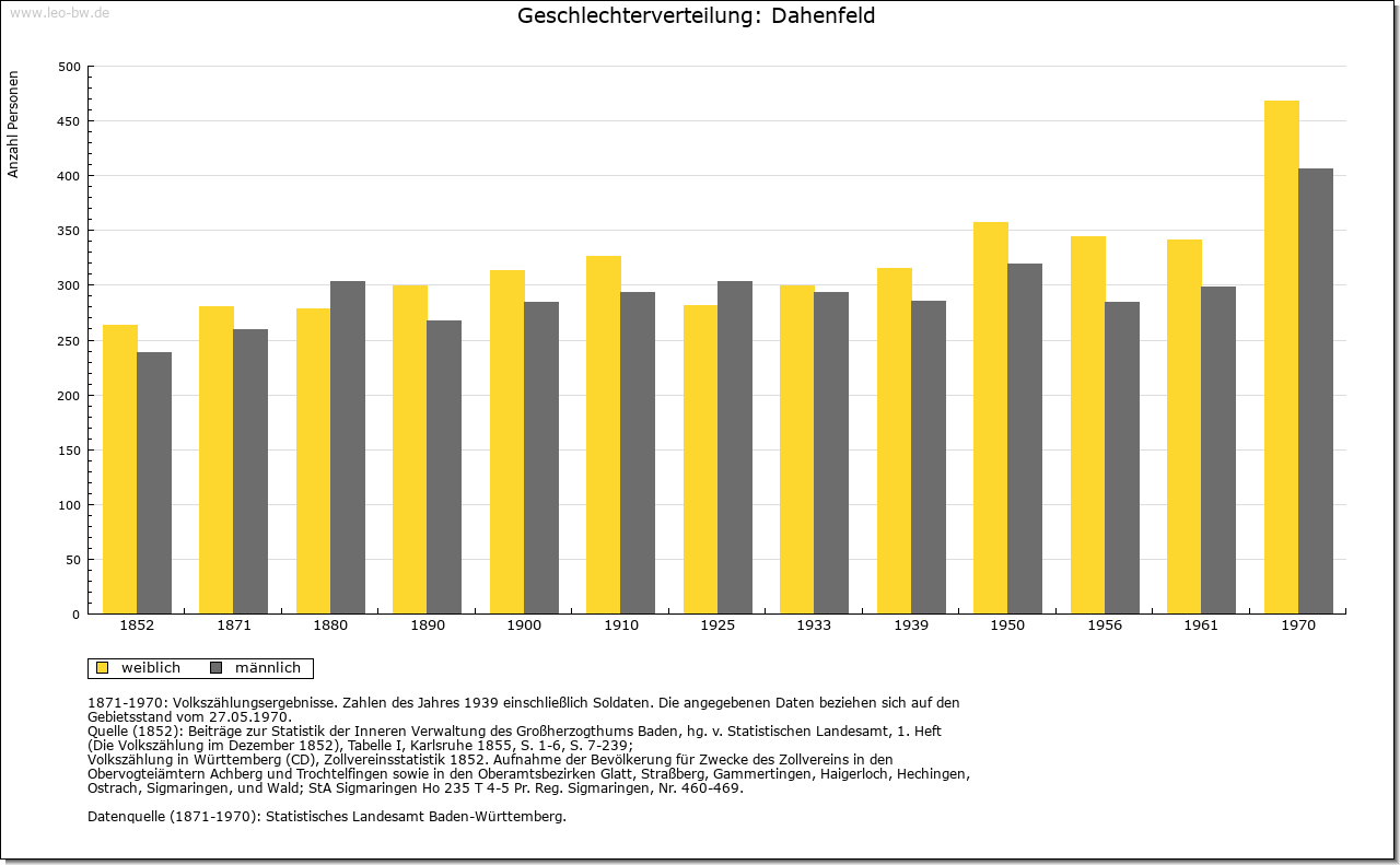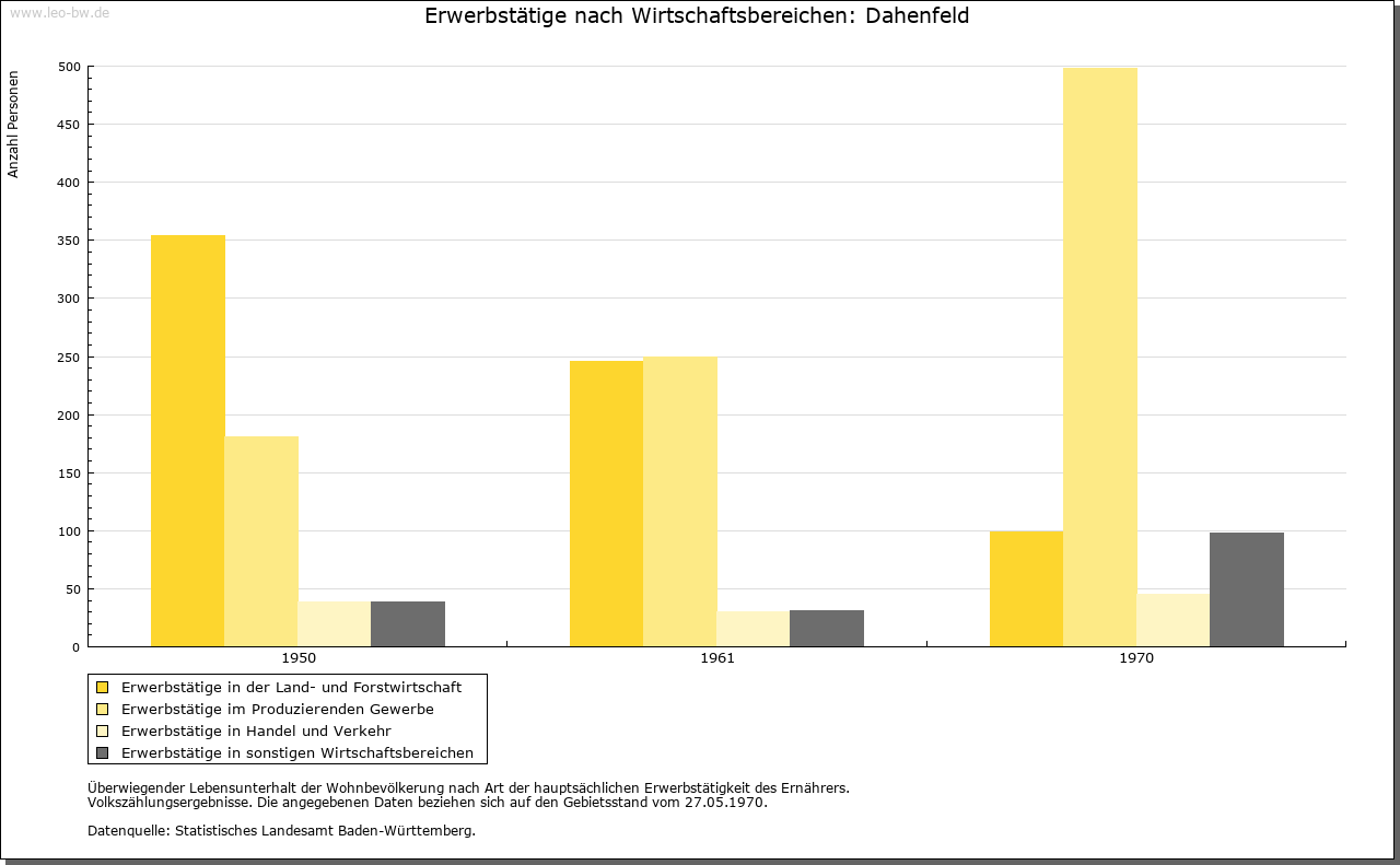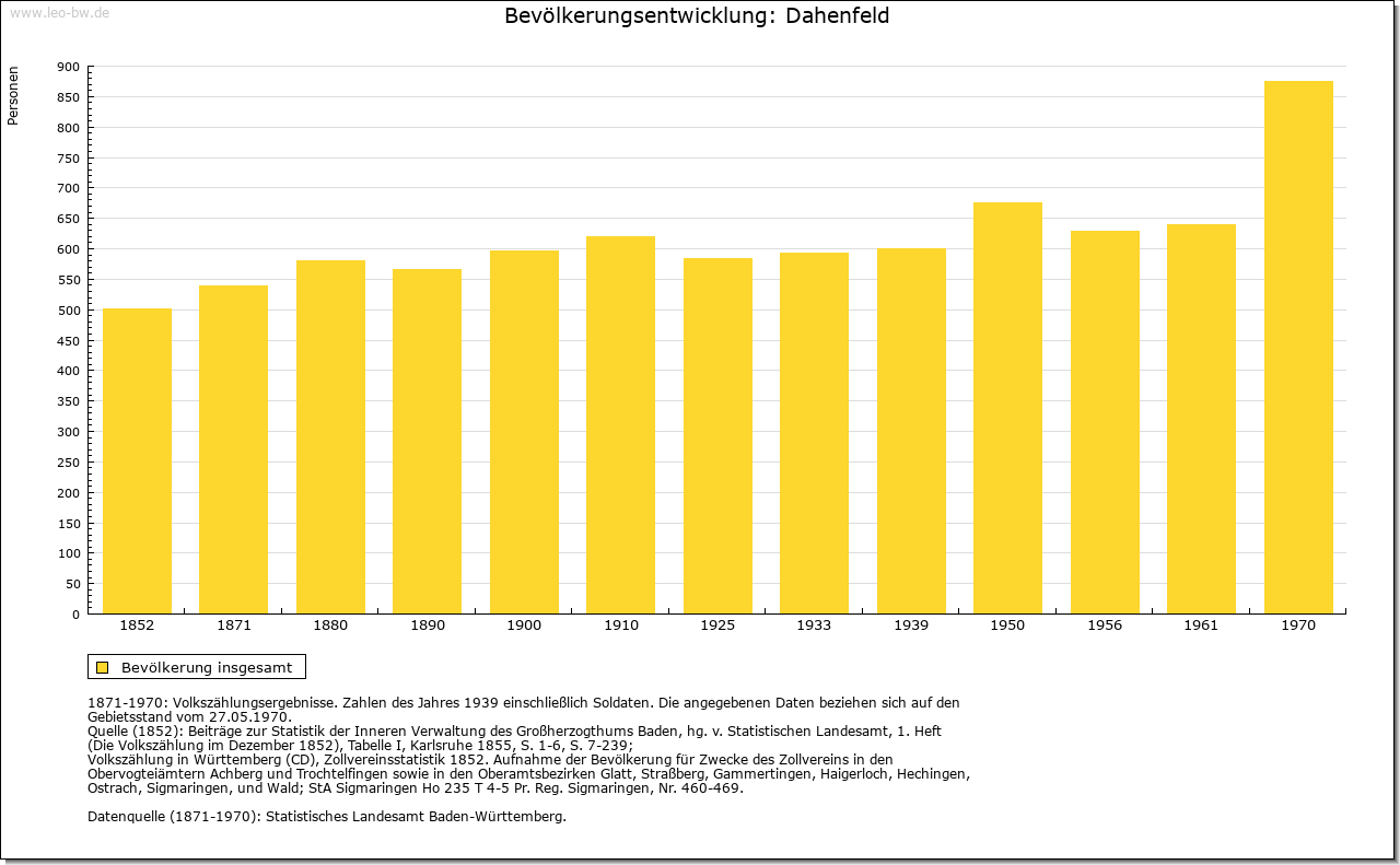 | Wirtschaft und Bevölkerung: | 1525 lebten in Dahenfeld 36 Hausgenossen beziehungsweise Familienvorstände, eine Witwe, vier Hofherren sowie dreizehn ledige Gesellen, das heißt insgesamt rund zweihundert Personen. Im Jahr 1604 zählte man 75 Männer beziehungsweise Haushaltsvorstände, woraus auf etwa dreihundert bis 350 Seelen zu schließen ist. Unmittelbar nach dem Dreißigjährigen Krieg belief sich die Gesamteinwohnerzahl nur noch auf höchstens 150. Danach nahm die Bevölkerung zunächst langsam zu; 1710 dürfte mit 46 Bürgern wieder etwa der Stand des früheren 16. Jahrhunderts erreicht gewesen sein. 1807 schließlich hatte das Dorf 377 Einwohner. Die Ackerflur untergliederte sich 1523 in die Fluren Beymersgrund, Bannholz und Kursenbach. Weinbau ist seit 1235 nachweisbar. 1667 verteilte sich die landwirtschaftlich genutzte Fläche zu 618 Morgen auf Äcker und zu 80 Morgen auf Weingärten. Zum Jahr 1710 sind einige Handwerker bezeugt: drei Küfer und zwei Maurer sowie je ein Schmied, Schuhmacher, Schneider und Leinenweber. Das älteste bekannte Gasthaus zum Kreuz wurde um 1747 eingerichtet, um den zahlreichen ins Dorf kommenden Wallfahrern Unterkunft zu geben. |