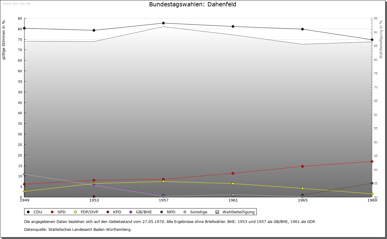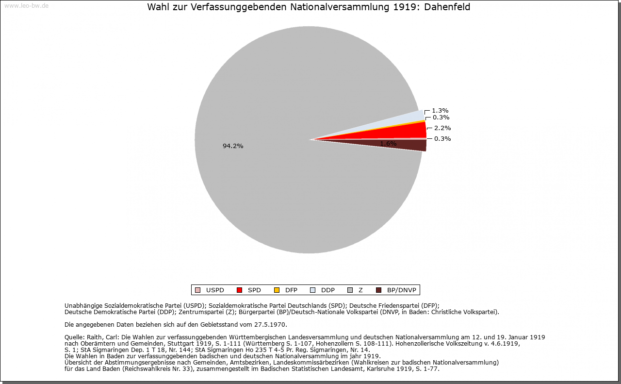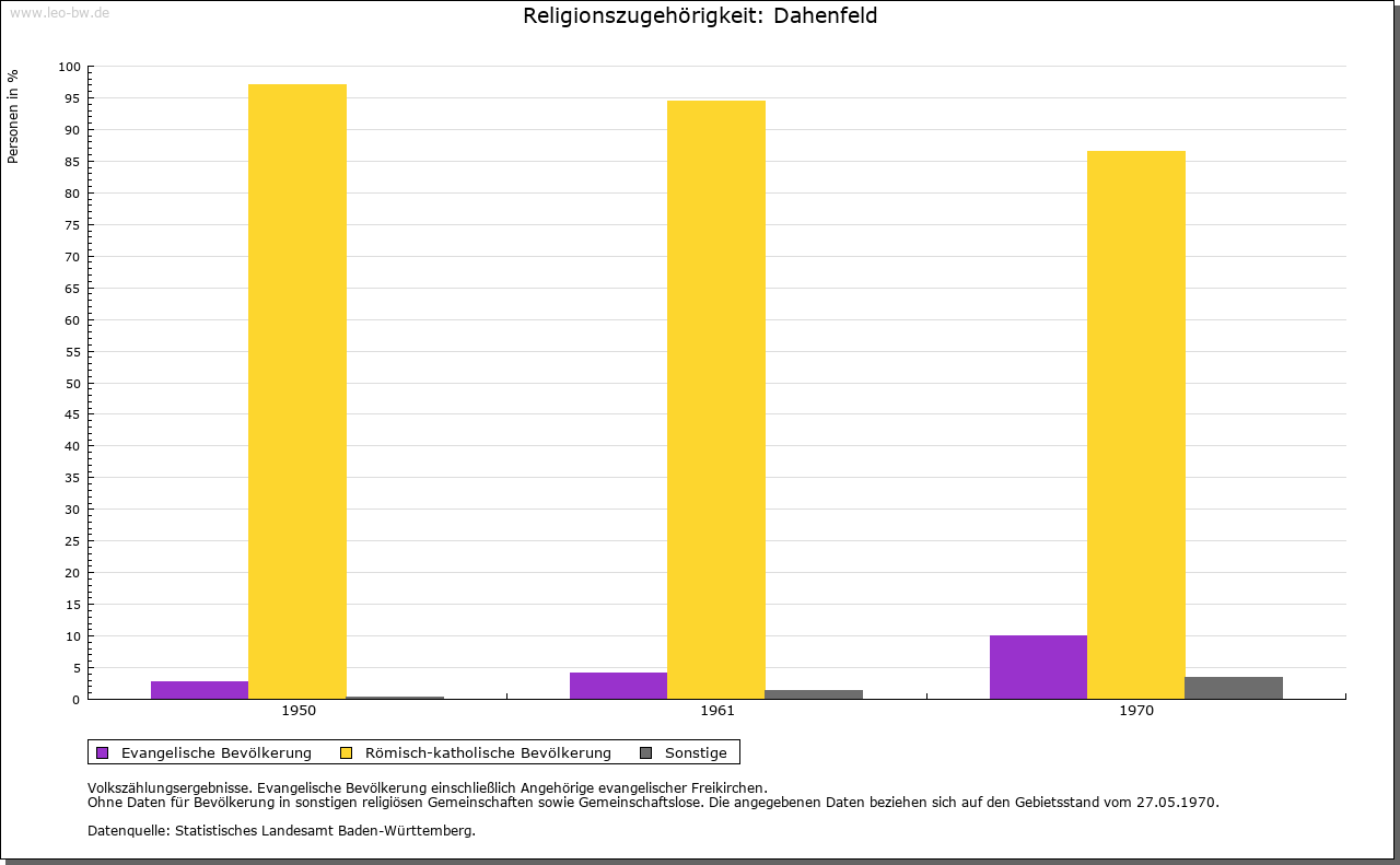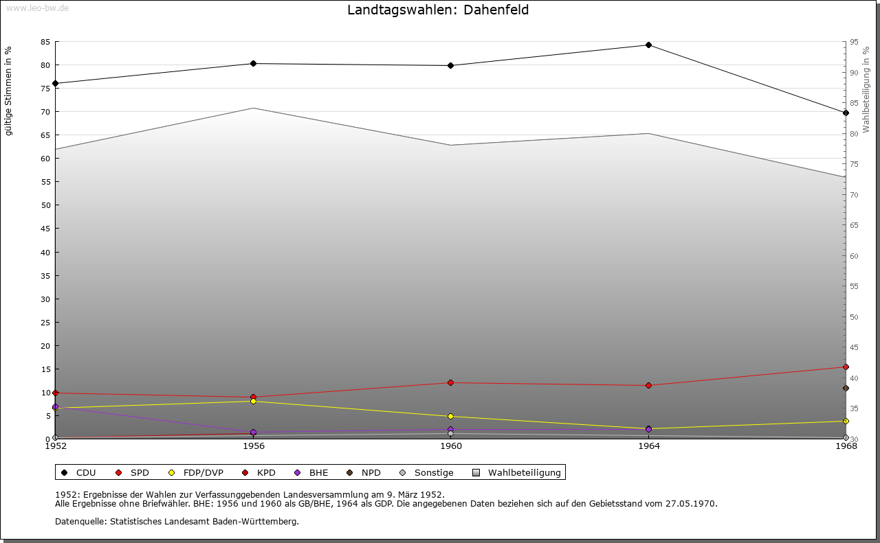 | Geschichte: | Im hohen Mittelalter zum Reichsgut gehörig, kam Dahenfeld später als Pfandschaft über die von Weinsberg (1315/48) an das Erzstift Mainz (um 1362/63) und schließlich 1484 im Tausch an den Deutschen Orden, dem hier seither alle hohe und niedere Obrigkeit zustand (Kommende Horneck, Amt Scheuerberg beziehungsweise Neckarsulm). Im Zuge der Säkularisation fiel das Dorf 1805 an Württemberg. Zwischen 1304 und 1359 nannte sich nach Dahenfeld ein ursprünglich den Weinsberg dienstbares Ritteradelsgeschlecht, zu dem auch Siegfried von Dahenfeld (1346/59), oberster Marschall des Deutschen Ordens in Preußen, gehörte. Ob 976 die Abtei Mosbach hier begütert war, bleibt ungewiss. 1177 jedenfalls hatte das Kloster Schöntal hiesigen Grundbesitz, und über die Staufer gelangten Gerechtsame auch an das Kloster Lorch im Remstal (1235). Im Jahr 1331 bestätigte Kaiser Ludwig der Bayer den Lorcher Mönchen den Besitz eines Hofs, der 1380 von den Weinsberg bevogtet wurde (Reichslehen). Größter Grundeigentümer war mutmaßlich stets die jeweilige Orts- beziehungsweise Landesherrschaft; in einem Urbar des Amts Scheuerberg sind die Befugnisse und Einkünfte des Deutschen Ordens zum Jahr 1554 zusammengestellt. Ein Teil des ehedem Weinsberger Grundbesitzes gelangte 1450 zusammen mit Neuenstadt an Kurpfalz und 1504 an Württemberg. 1344 erscheinen als Gültberechtigte darüber hinaus die von Wattenheim, bei denen es sich möglicherweise um einen Zweig der örtlichen Ritteradelsfamilie handelte. Weitere Rechte sind für die Greck von Kochendorf (vor 1404), von Böckingen (1452), von Talheim (1456), von Neudeck und von Gemmingen (1462) sowie für das Karmeliterkloster Heilbronn (1456/59), die Pfarrei und die Frühmesse zu Dahenfeld (1553) bezeugt. Der große und der kleine Zehnt gehörten spätestens seit dem 15. Jahrhundert dem Kloster Schöntal. Gericht und Gemeinde treten erstmals 1523 in Erscheinung; 1554 bestand das Gericht aus neun Schöffen und wurde bei Bedarf um drei weitere ergänzt. Die beiden Bürgermeister fungierten als Gemeinderechner. Das bereits 1583 erwähnte Rathaus wurde 1758/59 durch einen Neubau ersetzt. Ein Dorfbuch datiert von 1564. Auch ein Siechenhaus findet 1523 Erwähnung (»Sichheuslen). Vom 18.3.1806 bis 1.10.1938 gehörte Dahenfeld zum Oberamt Neckarsulm (seit 30.1.1934 Kreis), dann Landkreis Heilbronn. |