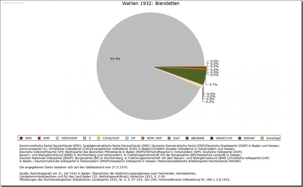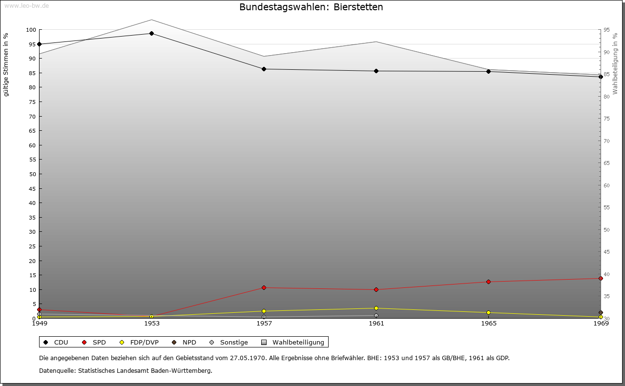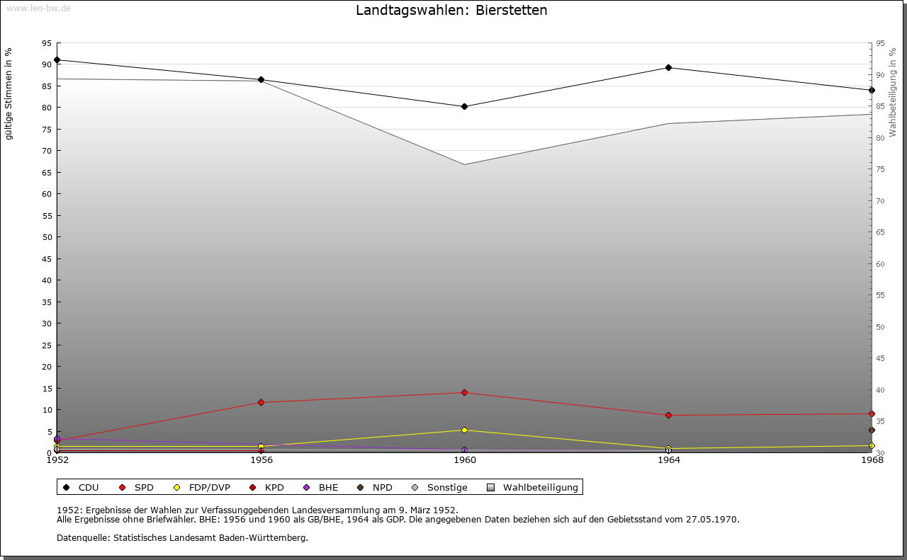 | Geschichte: | 1306 Büstetten (Personenname ?), vermutlich Siedlung der älteren Ausbauzeit. Hierher gehören wohl die 1367 genannten Herren von Bierstetten. Abgegangene Burg auf dem Schlossbühl. Oberhoheit mit der Stadt Saulgau 1299 an Habsburg. Nach wechselnder Verpfändung 1386 in den Pfandbesitz der Truchsessen von Waldburg (seit 1454 »mannserbliche Inhabung«). Bildung des der Grafschaft Friedberg zugehörigen Amts Bierstetten und 1588 Weiterverpfändung an von Zimmern und von Königsegg, die das Amt 1746 endgültig erhielten (1750 auch als österreichisches Lehen). 1788 Verkauf an das Stift Buchau. 1803 von Österreich beschlagnahmt, kam das Amt 1805 an Württemberg, Oberamt (1938 Landkreis) Saulgau. |