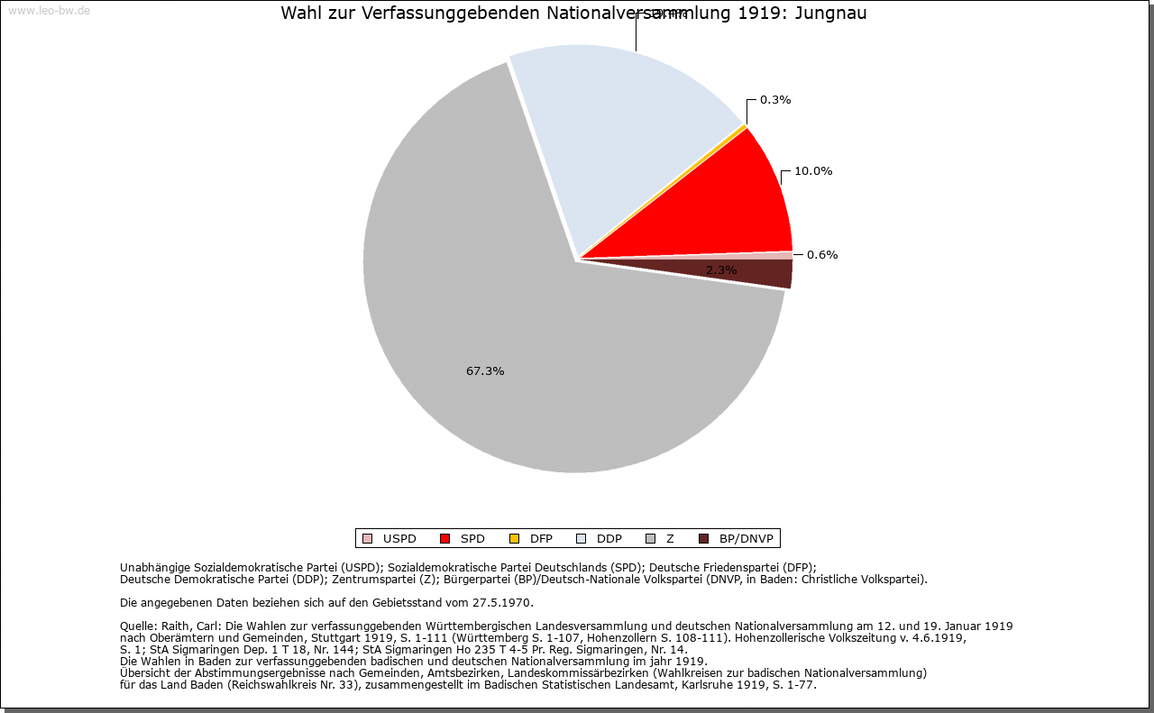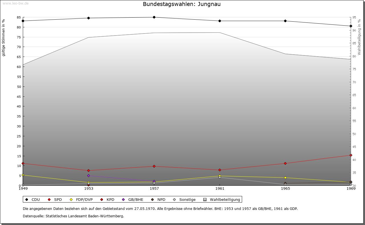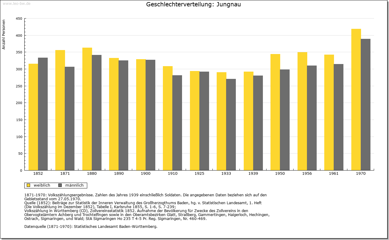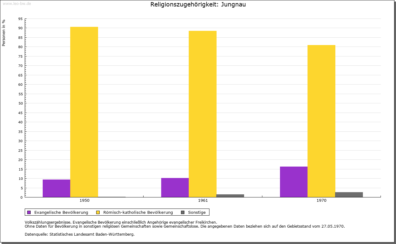 | Kirche und Schule: | Kirchlich war Jungnau früher ein Filial der Pfarrei Veringendorf. 1879 Pfarrkuratie, 1889 Pfarrei. Die heutige katholische Pfarrkirche Sankt Anna ist ein Bau von 1738. Pfarrei heute von Veringenstadt aus versorgt. Schächerkapelle aus dem 19. Jahrhundert. Evangelische nach Sigmaringen. |