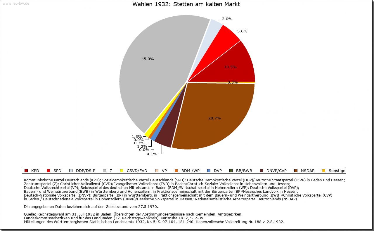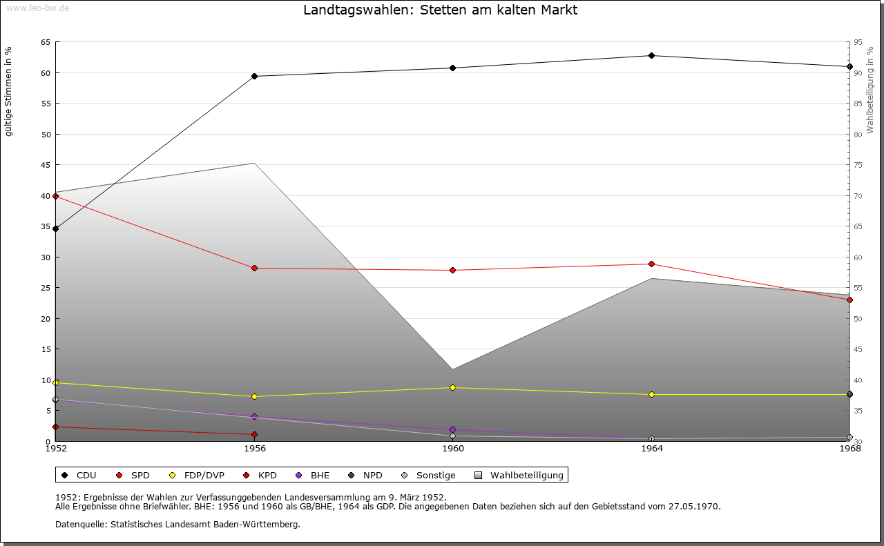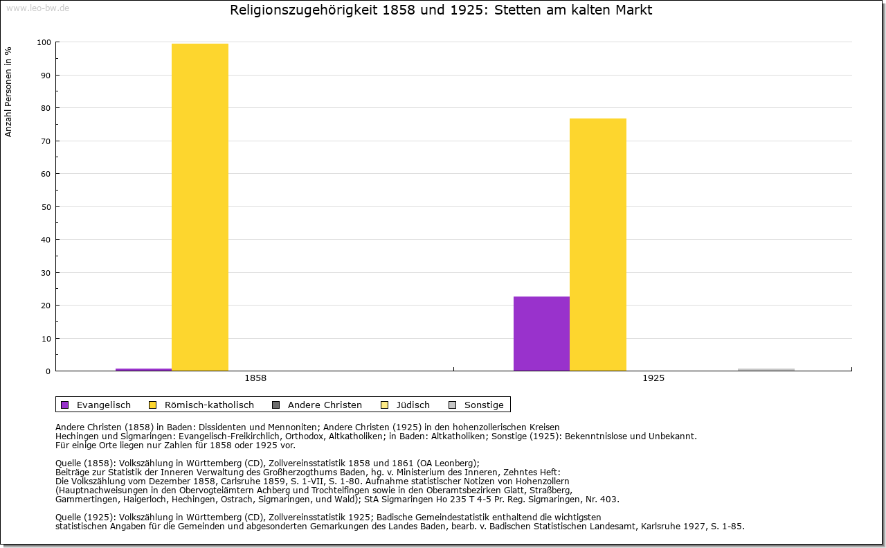 | Geschichte: | 799 (Корie 16. Jahrhundert) Stettin by Kaltenmark, 1283 Stetten super Scherra. Siedlung der ältesten Ausbauzeit. Der Ort soll 799 von Graf Gerold, dem Bruder der Königin Hildegard und Schwager Karls des Großen, an das Kloster Reichenau geschenkt worden sein. Auch Sankt Gallen erhielt 864 Güter in unmittelbarer Nähe. Im Hochmittelalter war Stetten anscheinend namengebender Sitz für ein Niederadelsgeschlecht (1261 Heinrich von Stetten). Die Dorfherrschaft gehörte 1283 den Grafen von Hohenberg. Von diesen gelangte sie 1343 an die von Jungingen, 1350 an die von Magenbuch und 1432 an die von Hausen. 1648 an die von Stein zu Klingenstein, wurde aber einige Jahre später von den Gläubigern unter Sequester gestellt und endlich vom Hauptgläubiger Österreich an sich gezogen, das sie 1682 an die Fugger abtrat. Von diesen gelangte der Ort 1735 an die Grafen Schenk von Castell, die ihn 1756 an Kloster Salem verkauften, von dem er 1803 an die Markgrafen von Baden fiel. Das im 16. Jahrhundert errichtete Schloss ist heute Rathaus. Rechteckiger, dreistöckiger Putzbau mit Giebel an den Schmalseiten. Die Landeshoheit mit der Hochgerichtsbarkeit gehörte bis 1805 als Bestandteil der oberen Grafschaft Hohenberg zu Österreich, dann württembergisch und ab 1810 badisch. 1813 Bezirksamt Meßkirch. 1824 Amt Pfullendorf, 1826 bis 1849 Amt Stetten am kalten Markt, 1849 Amt Meßkirch, 1936 Amt (1939 Landkreis) Stockach. 1912 wurde der Nordwestteil der Gemarkung zum Truppenübungsplatz gezogen. 1966 neue Kaserne (Albkaserne). Der Truppenübungsplatz umfasst insgesamt 4800 Hektar. |