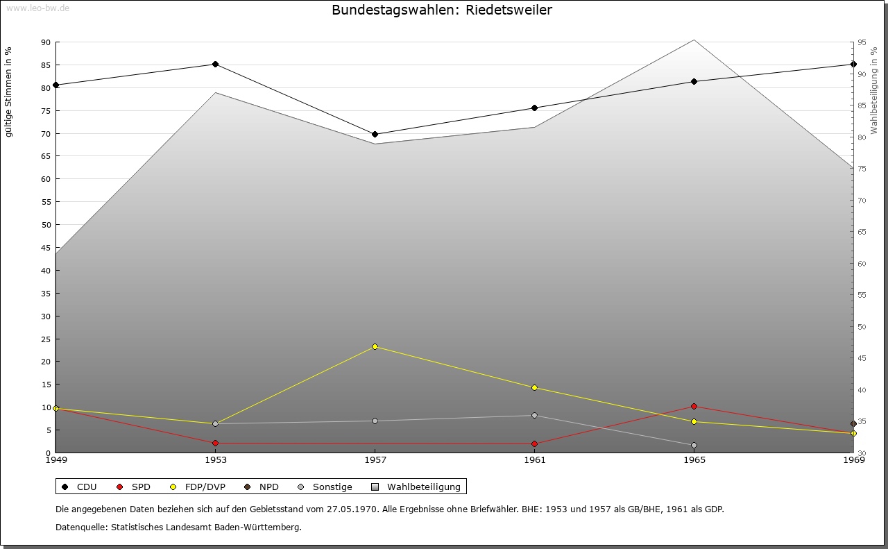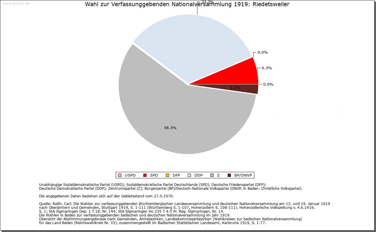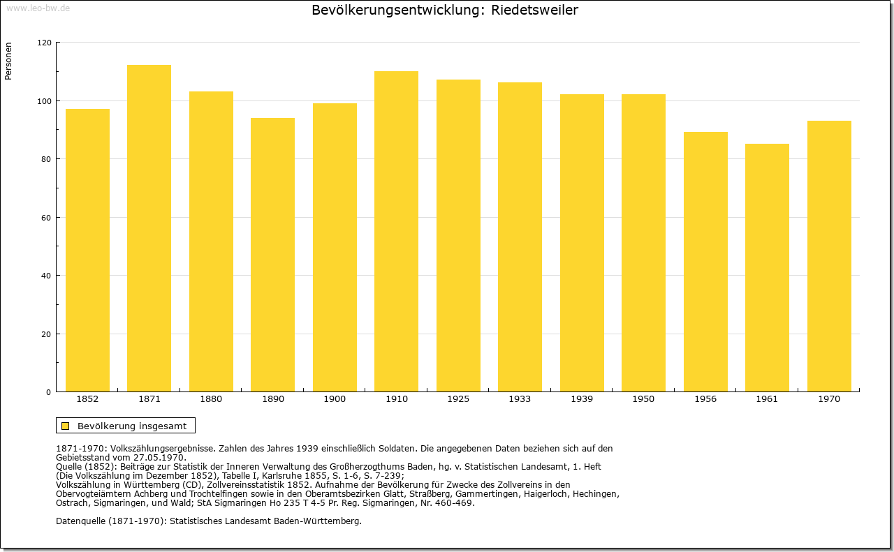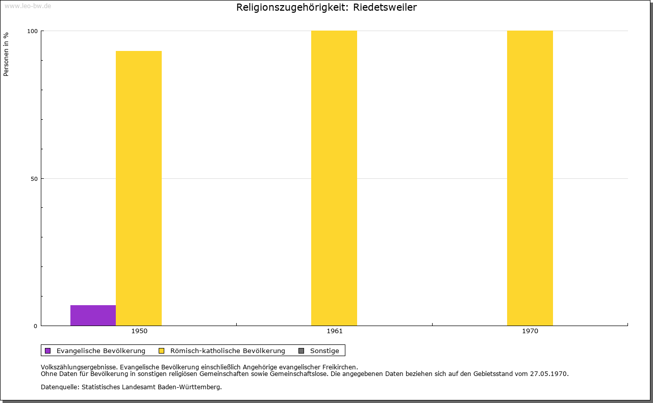| Geschichte: | 1223 Rucelinswilar (Personenname), 1225 Marquard von Riedetsweiler, 1501 Rietzerschwiller. Das Kloster Wald erwarb unter anderem von den Herren von Fronhofen (Lehenträger: von Wildenfels), den Grafen von Veringen und von Nellenburg (Lehenträger: von Reischach, von Nenzingen) und den Habsburgern (Lehenträger: von Reischach) zwischen 1270 und 1312 den größten Teil der Liegenschaften. Später war es alleiniger Grundherr. 1285 wird ein oberer und ein unterer Dorfteil genannt. 1474 befanden sich Niedergericht und Dorfherrschaft im Besitz von Kloster Wald. Seit der 1. Hälfte des 16. Jahrhunderts bildete Riedetsweiler zusammen mit Rothenlachen und Ruhestetten einen als Gemeinde bezeichneten Gerichts- und Verwaltungsbezirk, der nach der Zerstörung Ruhestettens im 30jährigen Krieg als halbe Gemeinde galt. Hohe Obrigkeit bei der Grafschaft Sigmaringen. Vor 1600 erlangte Wald die Lokalleibherrschaft. Mit der Klosterherrschaft 1806 an Hohenzollern-Sigmaringen. Oberamt Wald (seit 1850 preußisch), 1862 Oberamt (1925 Landkreis) Sigmaringen. |