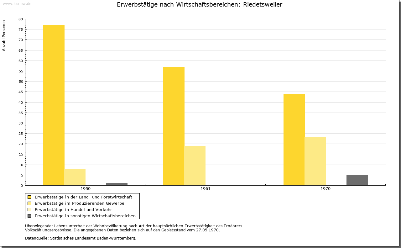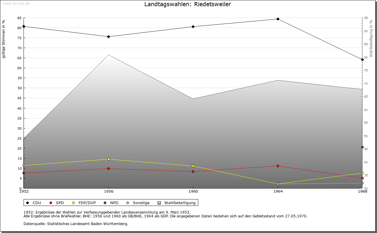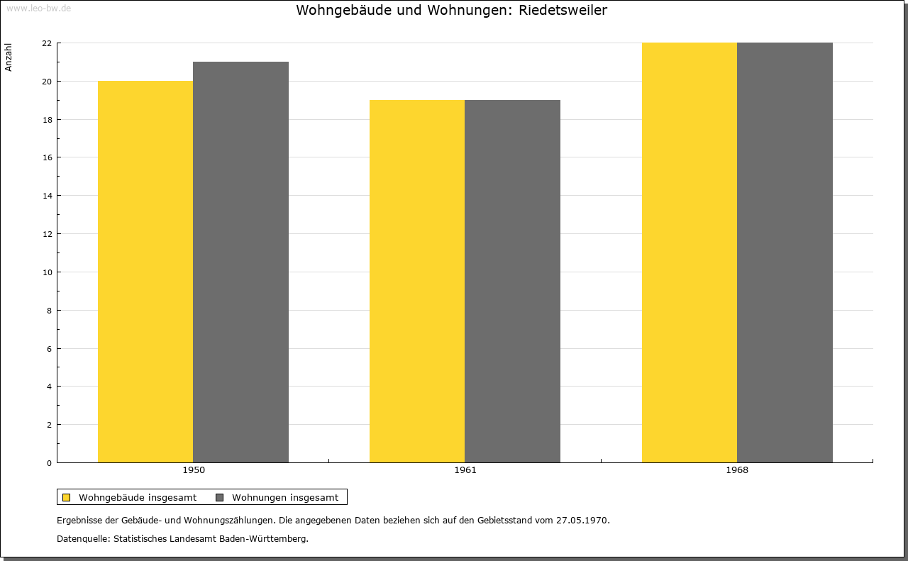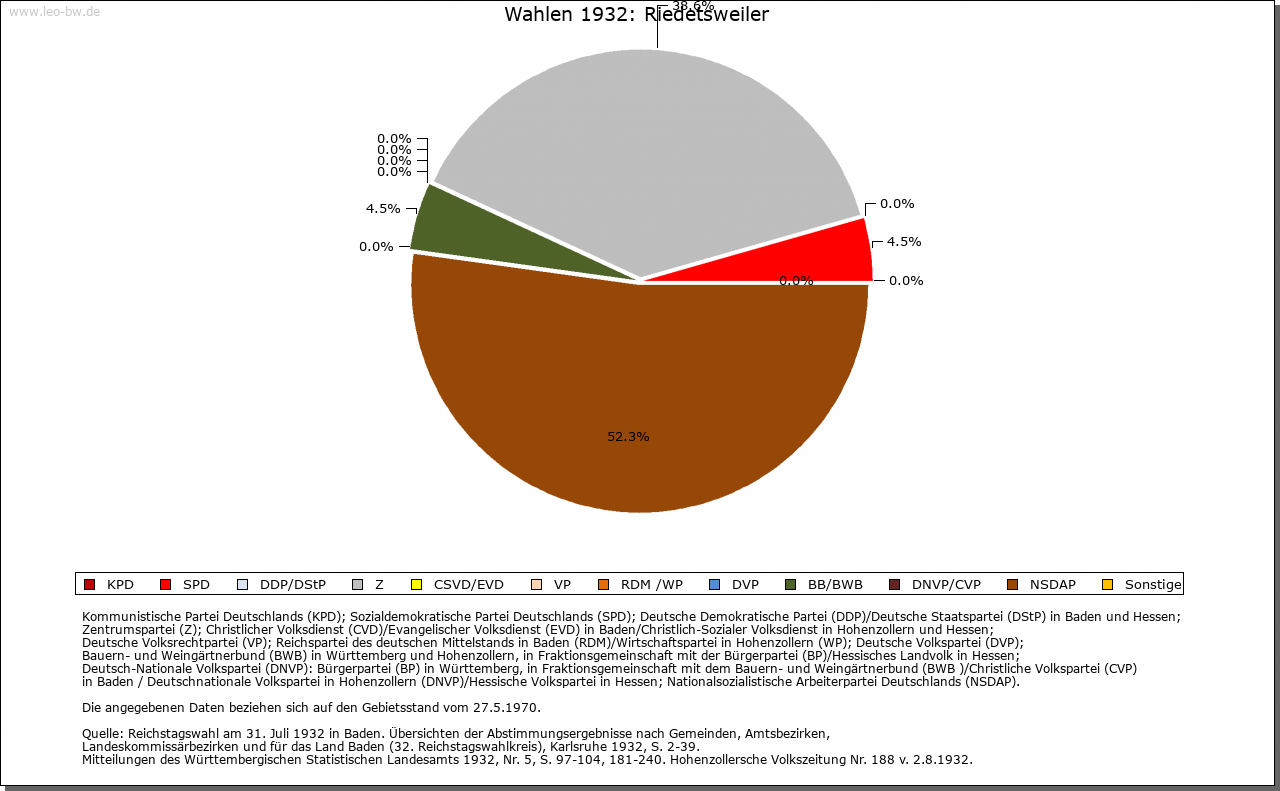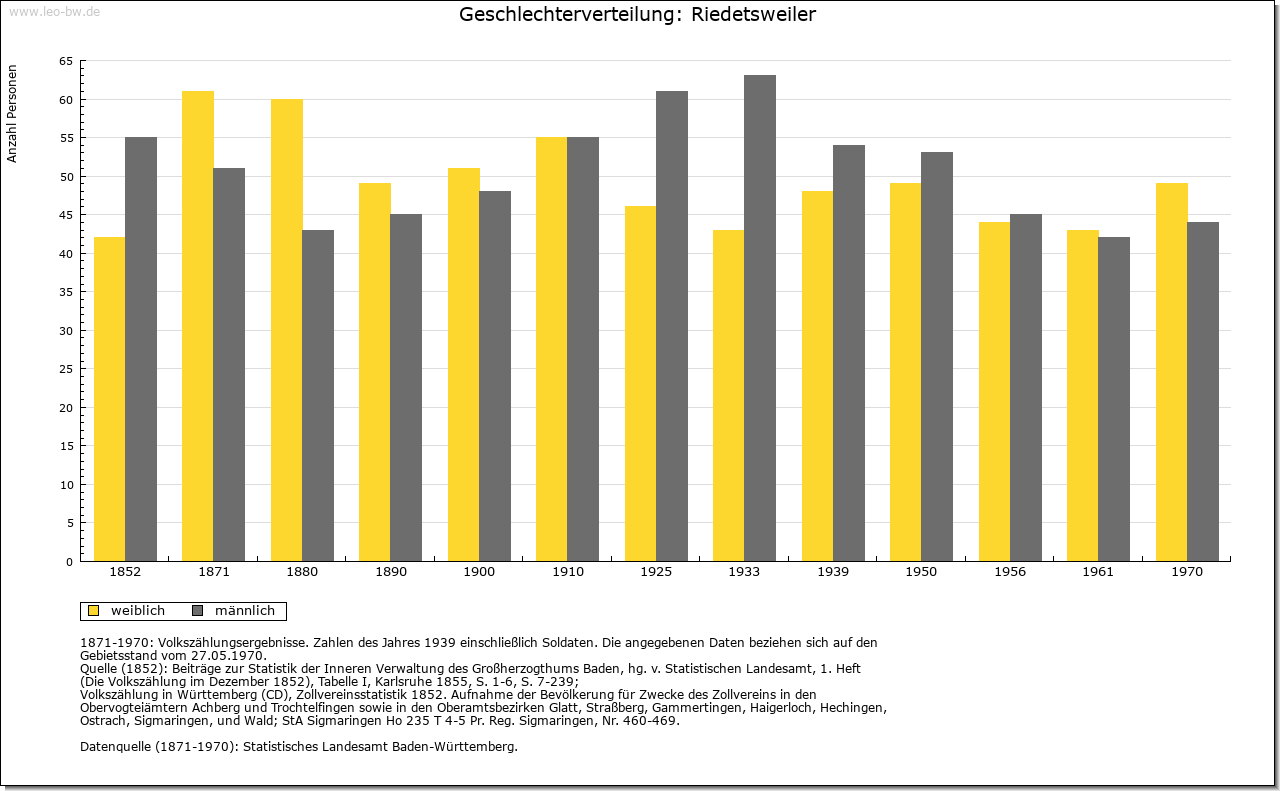 | Geschichte: | 1223 Rucelinswilar (Personenname), 1225 Marquard von Riedetsweiler, 1501 Rietzerschwiller. Das Kloster Wald erwarb unter anderem von den Herren von Fronhofen (Lehenträger: von Wildenfels), den Grafen von Veringen und von Nellenburg (Lehenträger: von Reischach, von Nenzingen) und den Habsburgern (Lehenträger: von Reischach) zwischen 1270 und 1312 den größten Teil der Liegenschaften. Später war es alleiniger Grundherr. 1285 wird ein oberer und ein unterer Dorfteil genannt. 1474 befanden sich Niedergericht und Dorfherrschaft im Besitz von Kloster Wald. Seit der 1. Hälfte des 16. Jahrhunderts bildete Riedetsweiler zusammen mit Rothenlachen und Ruhestetten einen als Gemeinde bezeichneten Gerichts- und Verwaltungsbezirk, der nach der Zerstörung Ruhestettens im 30jährigen Krieg als halbe Gemeinde galt. Hohe Obrigkeit bei der Grafschaft Sigmaringen. Vor 1600 erlangte Wald die Lokalleibherrschaft. Mit der Klosterherrschaft 1806 an Hohenzollern-Sigmaringen. Oberamt Wald (seit 1850 preußisch), 1862 Oberamt (1925 Landkreis) Sigmaringen. |