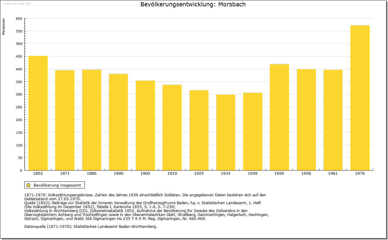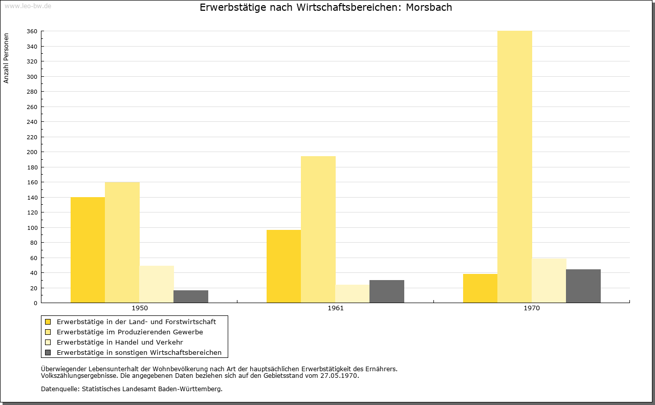 | Wirtschaft und Bevölkerung: | Die Bevölkerungszahl von Morsbach belief sich 1687 auf etwa 240, 1796 auf rund 370. Am Ende des Alten Reiches nährten sich die Einwohner hauptsächlich vom Weinbau (Herrenberg), daneben aber auch von gewöhnlichem Ackerbau und Viehzucht; viele Morsbacher mussten ihren Lebensunterhalt als Tagelöhner in Künzelsau verdienen. Die landwirtschaftlich genutzte Fläche bestand zu fast 40 Prozent aus Weinbergen, zu 50 Prozent aus Ackerland und zu rund 10 Prozent aus Wiesen. Zu Beginn des 19. Jahrhunderts wurde im Dorf nur ein Pferd gehalten, dafür aber 98 Rinder, 63 Schweine, 124 Schafe und zwei Ziegen. Die bereits 1254 erwähnte Mühle am Kocher gehörte noch 1322 zur Hälfte dem Kloster Lichtenstern. Eine Kelter ist seit 1430 bezeugt; spätestens seit Mitte des 16. Jahrhunderts gab es deren zwei, eine vordere und eine hintere. 1685 wurde vereinbart, im Dorf zwei Erbschenken zu unterhalten, um Familienfeste und kommunale Anlässe nicht mehr in Künzelsau begehen zu müssen. Im 18. Jahrhundert bestand in Morsbach eine Glockengießerei der Familie Lösch. |