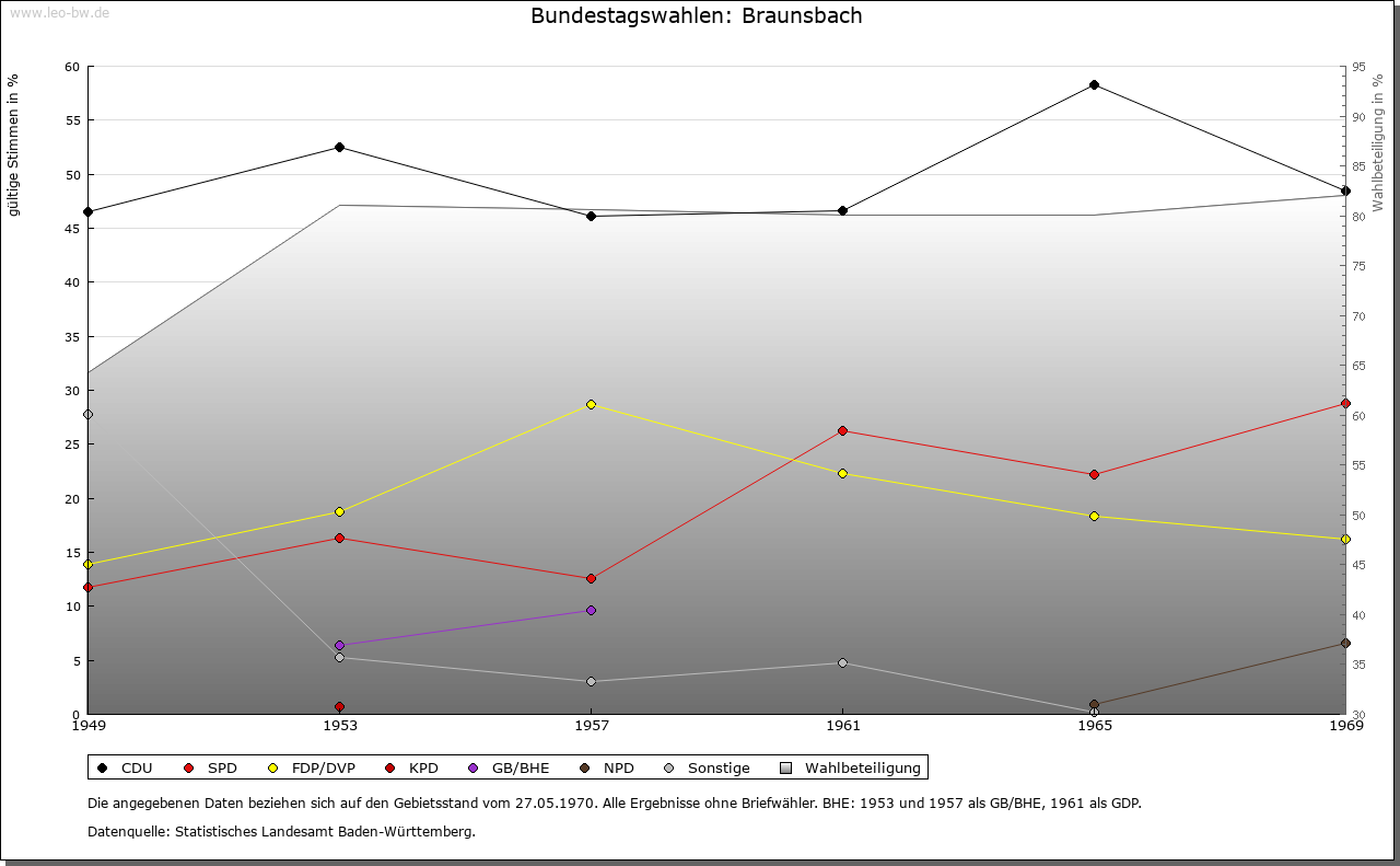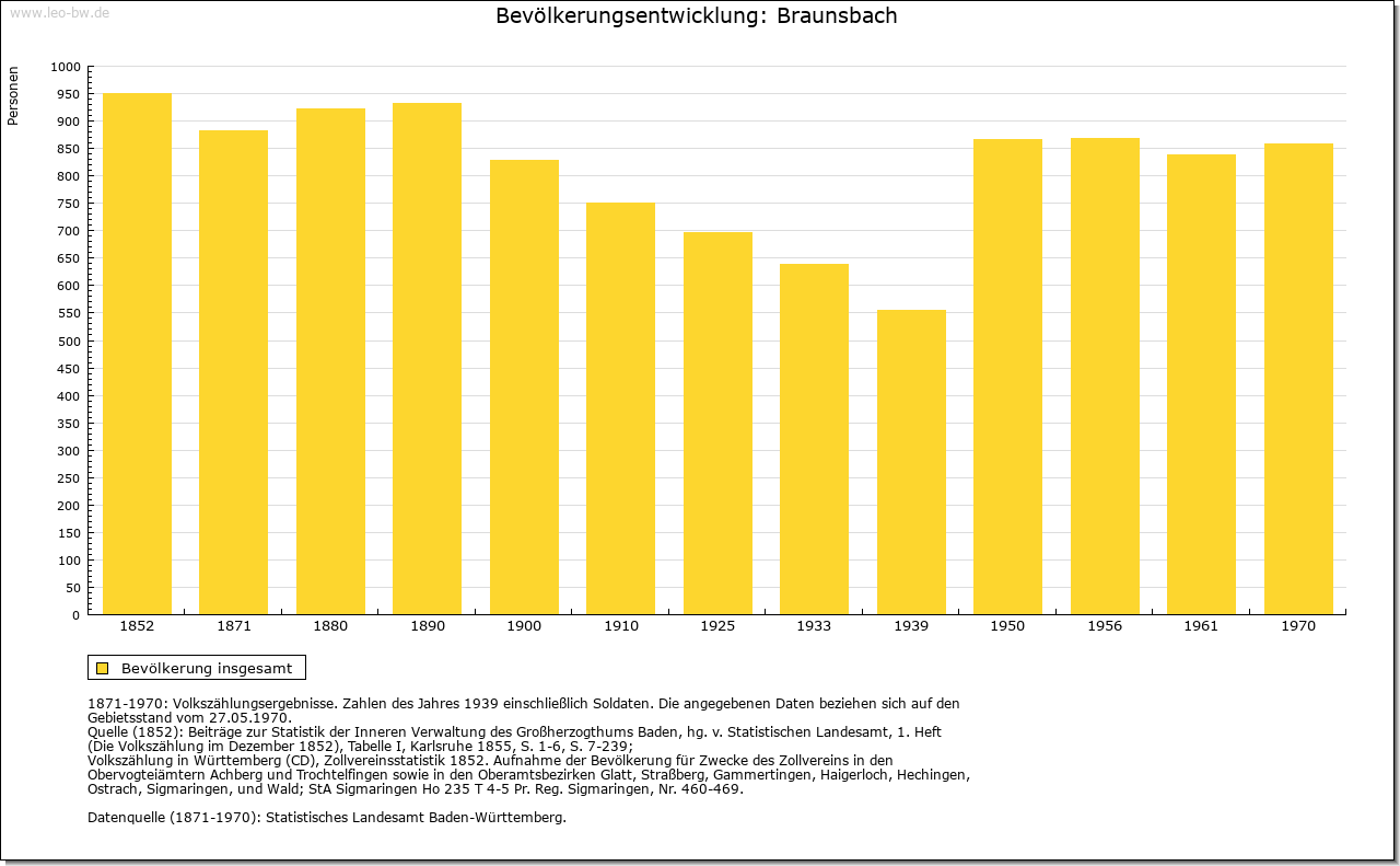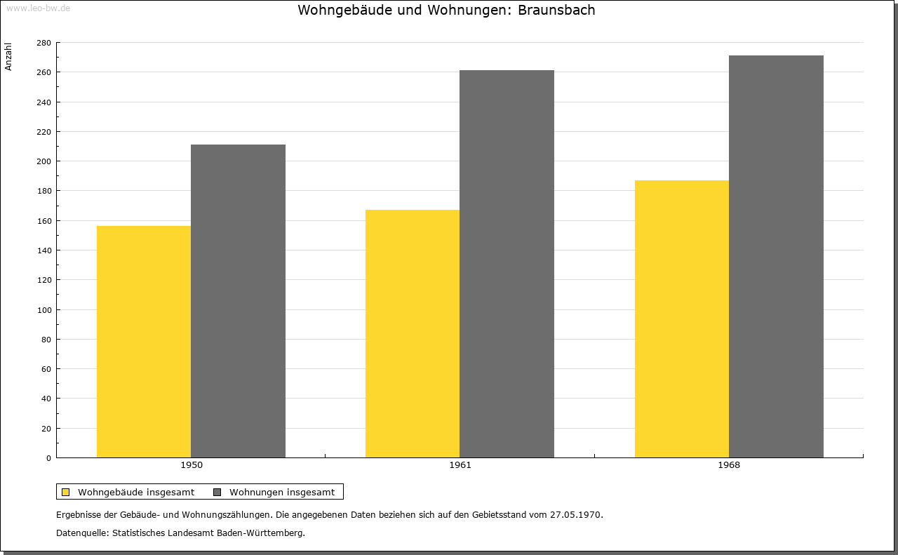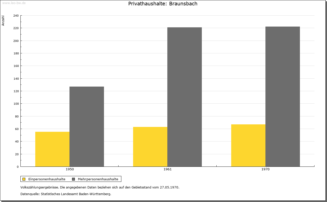 Ortslage und Siedlung (bis 1970): | Der Ort liegt eingebettet in das an dieser Stelle enge Kochertal bei der Mündung des Orlachbaches, das Ortsbild wird von Schloss und Kirche beherrscht. Die Siedlung verläuft aufgrund der bergigen Lage des Dorfes unregelmäßig, die Hauptstraße zieht sich entlang der Kocherschleife. Möglicherweise bildete ein Flügel der Haller Landheg eine interne Abgrenzung der von der äußeren Hege umschlossenen Braunsbacher Markung vom hällischen Territorium. So hatte man auf der Haller Straße von Geislingen nach Braunsbach eine Sperranlage mit Riegel eingerichtet. Ursprünglich war Braunsbach wohl von einem Zaun umgeben und besaß vier Tortürme (bei den drei Ortsausgängen im Norden, Süden und Osten sowie beim Schloss). Nur der nördliche »Döttinger Turm« (1717) mit seiner Tordurchfahrt ist noch erhalten, die anderen wurden im 19. Jahrhundert abgebrochen. Im 18. Jahrhundert erfuhr der Ort durch den Zuzug von jüdischen und katholischen Bewohnern deutliche Erweiterungen, laut der Oberamtsbeschreibung »viele kleine unansehnliche Gebäude«, da die Zugezogenen meist unteren sozialen Schichten entstammten. Der Güterbesitz der Untertanen war sehr zersplittert, es gab nur wenige Inhaber größerer Grundstücke. Der auf der Höhe des Schaalbergs gelegene Schaalhof gehörte mit seinem großen Grundbesitz der jeweiligen Ortsherrschaft, der Heuzehnt ging allerdings noch bis 1578 an Hohenlohe. Auch besaßen die Hohenlohe-Langenburg die Hochgerichtsbarkeit über den Hof. Ab 1731 durch Verkauf in Erbbestand, wurde er 1826 in zwei Güter geteilt. Auch die herrschaftliche Mühle ging 1731 durch Verkauf in Erbbesitz über. Neben verschiedenen Rechten in anderen Orten, beispielsweise Rechte und Einkünfte aus Obersteinach, Sandelsbronn, Groß- und Kleinforst, Dünsbach, Söllbot und Brachbach, sowie einigen Waldungen zählte auch die Mühle zu Elpershofen zum Besitz des Ritterguts, sie wurde jeweils durch die Braunsbacher Ortsherrschaft mit einem Bestandsmüller besetzt. Viele dieser Rechte entstanden vermutlich erst durch die Verbindung des Ortes mit der Herrschaft Crailsheim-Morstein im 16. Jahrhundert. Insgesamt veränderten sich durch die Herrschaftswechsel die Gesamtbesitzrechte des Ritterguts mehrfach. Abgegangen ist der um 1100 erwähnte Wohnplatz Gruonden. Nach dem zweiten Weltkrieg wuchs Braunsbach durch neue Wohngebiete am »Schaalhofberg« (ab 1960) im Norden und an der Raingasse-Geislinger Straße (ab 1966) im Süden. |