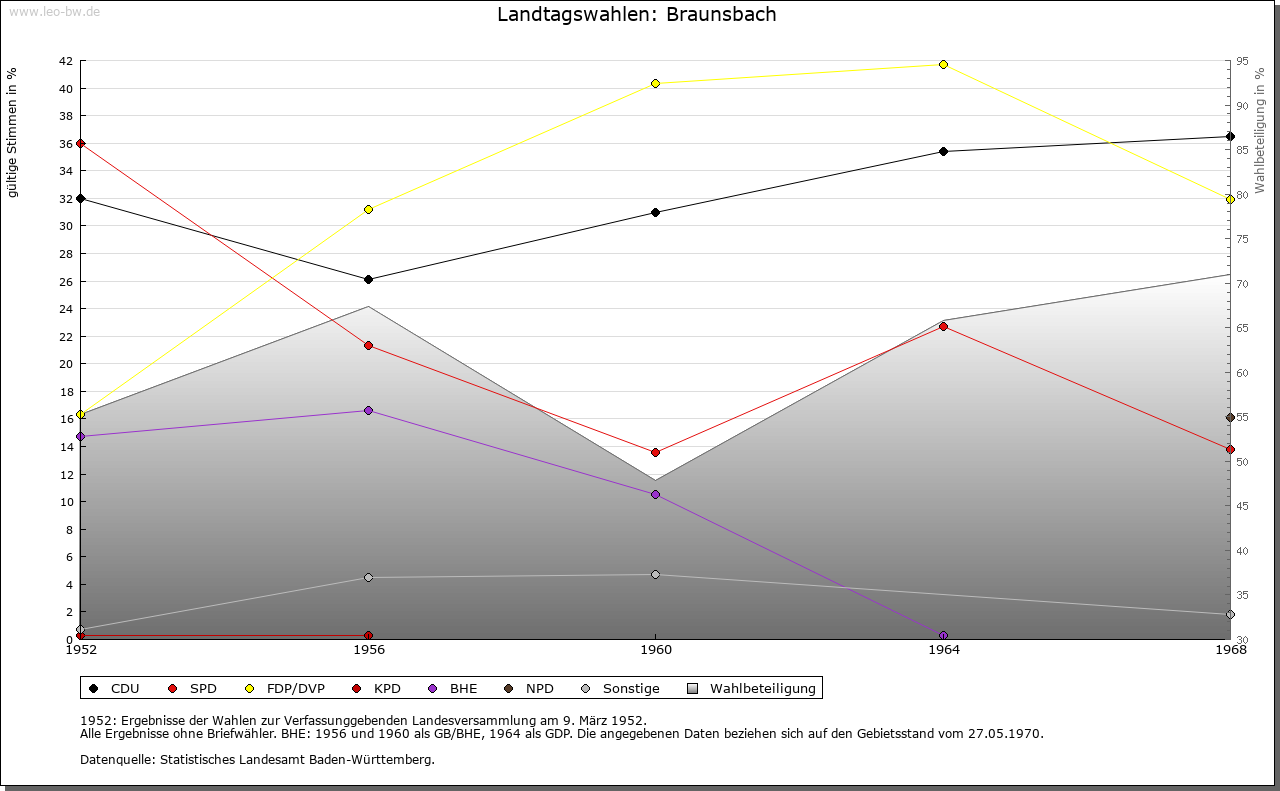 | Geschichte: | Die schriftliche Ersterwähnung Braunsbachs fällt im Jahr 1255 mit einem Gesuch zur Aufnahme in den Deutschen Orden durch Marquard von »Brunsbach«. Die zweite Nennung des Ortes erfolgt 1263 mit dem Ritter Berthold von »Brunsbach«, einem Lehensmann der Schenken von Limpurg. In dieser ortsadeligen Familie, die später auch mit Beinamen Eisenhut auftritt, kann man die Erbauer der örtlichen Burg vermuten. Die Herrschaft über das Dorf war im 14. und 15. Jahrhundert jedoch auf mehrere Besitzer verteilt: auf den Ortsadel, aber auch auf andere Adelsgeschlechter wie die von Gochsheim, von Gabelstein oder von Schrozberg, weiter auf die Schenken von Limpurg und wechselnde Haller Patriziergeschlechter. Von diesen konnte sich die Familie der Spieß am stärksten behaupten, 1471 kauften sie den Großteil des Ortes von der Familie der Schweicker Göler, schon 1423 hatte Heinrich Spieß von Kaiser Sigismund das Gericht zu Braunsbach erhalten. Sein gleichnamiger Nachkomme, der letzte Vertreter seines Hauses, verließ Schwäbisch Hall aufgrund der Einführung der Reformation 1534 und ließ sich bis zu seinem Tod 1549 im Braunsbacher Schloss nieder. Durch seine Erbtochter Anna gelangte der Ort an Albrecht I. von Crailsheim zu Morstein, der sich den gesamten Familienbesitz allerdings zunächst mit seinen drei Brüdern teilen musste. Bereits zu Zeiten der Spieß war es zu Auseinandersetzungen mit Schwäbisch Hall gekommen: Obwohl nicht hällisch, lag Braunsbach innerhalb der Haller Landheg, weshalb die Reichsstadt dort Rechte beanspruchte. Diese suchte sie teilweise mit Gewalt durchzusetzen, wie 1539 mit einem bewaffneten Überfall auf die Braunsbacher Kelter, andererseits prozessierten die Haller mit den dortigen Ortsherren mehrfach vor dem Reichskammergericht. Hall forderte dabei unter anderem die hohe Obrigkeit, den Kirchweihschutz, den Einzug von Freveln, die Malefizgerichtsbarkeit sowie die Maß- und Gewichtskontrolle. Dagegen verwiesen die Crailsheimer auf ihre reichsunmittelbare Stellung und die damit verbundenen Rechte, außerdem befand sich ihren Angaben nach ein großer Teil der Dorfmarkung außerhalb der Heg. Ansprüche aus dem ehemaligen Haller Bürgerrecht der Spieß wurden gleichfalls zurückgewiesen, da Heinrich Spieß das seinige bei seinem Auszug aus der Stadt aufgekündigt hatte. Unter Vermittlung der Grafen von Hohenlohe kam 1567 ein Vergleich zustande, in welchem Hall gegen die Abtretung einiger Crailsheimer Güter in der Landheg auf seine Besitzrechte und den erst 1564 von den Hohenlohe erworbenen Kirchensatz zu Braunsbach verzichtete. 1568 teilten die Crailsheim-Morsteiner ihren Besitz auf: Während seine Brüder Morstein bekamen, erhielt Albrecht von Crailsheim Braunsbach mit allen zugehörigen Gütern und Rechten zugesprochen, im gleichen Jahr verlieh ihm Kaiser Maximilian II. den Blutbann und die Erlaubnis für vier Jahrmärkte im Jahr. Bereits 1565 hatte er ehemals hohenlohischen Lehenbesitz der Familie Schletz erworben. Damit waren die Voraussetzungen für die Bildung und Konsolidierung einer reichsunmittelbaren Adelsherrschaft gegeben, die Albrecht auch durch eine umfangreiche Erweiterung der Schlossanlage zu repräsentieren suchte. Nach dem Tod seines Sohnes Albrecht II. 1593 kam es innerhalb der Familie Crailsheim zu Streitigkeiten um den Besitz des Ortes vor dem Reichskammergericht. Dabei wurden auch ausführliche Inventare des Schlosses angelegt. Letztendlich fiel Braunsbach 1599 an Albrechts Neffen Wolf von Crailsheim, der den Ausbau des Schlosses mit der Errichtung des Westflügels fortführte und mit dem 1613 erhaltenen Privileg der Befreiung von fremden Gerichten einen weiteren Baustein zur rechtlichen Abrundung seiner Herrschaft erlangen konnte. Mit seinem Tod (1637) starb jedoch die Linie Crailsheim-Morstein aus. In seinem Testament hatte er seine Nichte Barbara von Gemmingen (gestorben 1640) und deren Tochter Helene Marie von Stetten als Erben eingesetzt. Helene Maries Ehemänner kamen jeweils in den Besitz Braunsbachs, 1640–42 Johann Kaspar von Layen und 1644–63 Hans Georg von Lichtenstein. Nach langwierigen Rechtsstreitigkeiten gelangte Braunsbach 1666 durch ein Urteil des Hofgerichts Rottweil an die Herren von Wolfskehl, die ihre Ansprüche durch die Verwandtschaft mit Wolf von Crailsheims Gattin Salome von Wolfskeel begründeten. Doch die Wolfskeel verkauften den neuen Besitz bereits wieder 1673 an ihren Schwager, den würzburgischen Hof- und Regierungsrat Franz Johann Wolfgang zu Vorburg. Zur rechtlichen Absicherung seiner Herrschaft trug dieser Braunsbach dem Würzburger Bischof als Rittermannlehen auf. Mit dem Tod seines 1690 belehnten Sohnes Johann Franz von Vorburg und dem damit verbundenen Aussterben dieser vorburgischen Linie gelangte das Dorf 1712 an Würzburg. 1715 überließ das dortige Domkapitel Braunsbach zusammen mit Großeislingen (heute Eislingen an der Fils, Landkreis Göppingen) Bischof Johann Phillip von Greifenklau, der die Orte seinem Neffen Lothar Gottfried Heinrich von Greifenklau übertrug. Aus Geldnot verpfändete dieser 1738 wiederum beide Orte an das Würzburger Domkapitel. Das nicht mehr eingelöste Pfand wurde in der Folgezeit von einem würzburgischen Amtmann verwaltet. 1802/03 kam es mit den fürstbischöflich-würzburgischen Ämtern Jagstberg und Haldenbergstetten als Ersatz für linksrheinische Besitzungen an die Fürsten von Hohenlohe-Bartenstein. 1806 wurde diese Herrschaft dann in das neue Königreich Württemberg integriert. Die vielfachen Herrschaftswechsel und das durch die Lage innerhalb der Haller Landwehr bis 1567 vorhandene Konfliktpotenzial mit der Reichsstadt wirkten sich auch auf die Untertanen aus. Der Bauernaufstand im Raum Schwäbisch Hall begann nach einer Versammlung in der Braunsbacher Mühle am Abend des 2. April 1525, wo vor allem Bauern aus den benachbarten Orten zusammengetroffen waren. Im weiteren Verlauf des 16. Jahrhunderts kam es immer wieder zu Reibereien mit Schwäbisch Hall, da