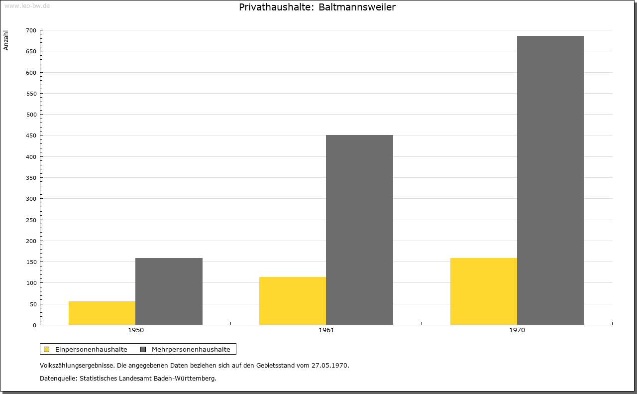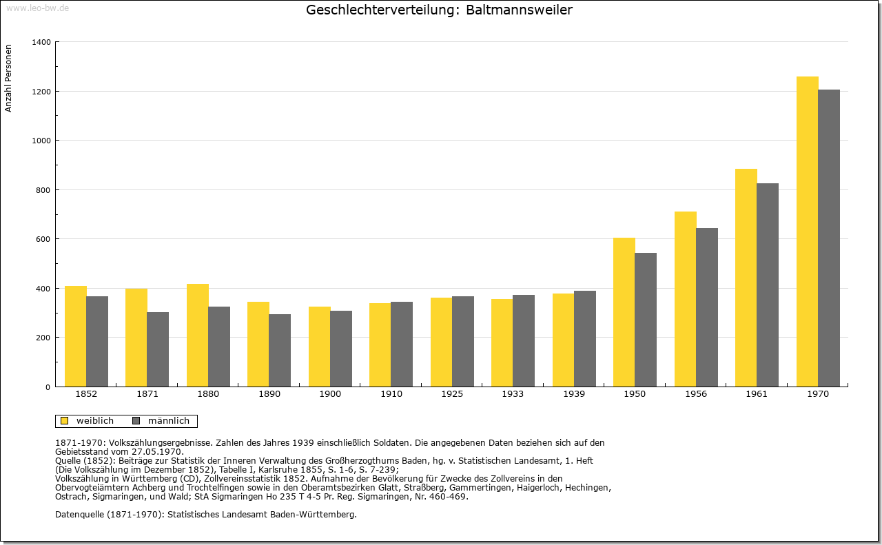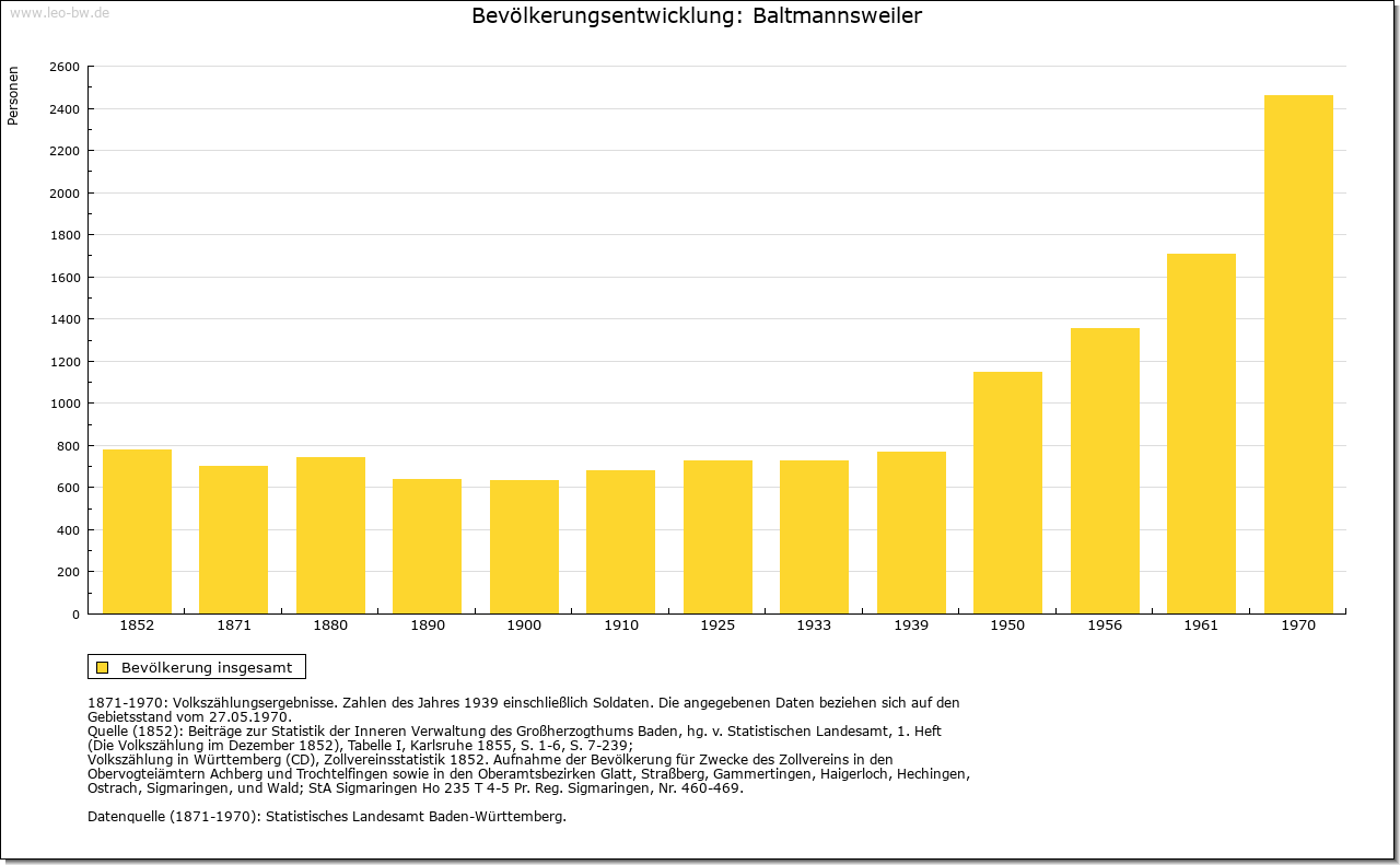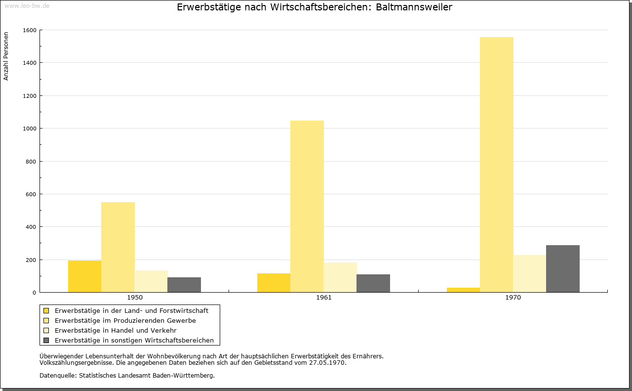 | Wirtschaft und Bevölkerung: | Schon früh hatte Baltmannsweiler eine vergleichsweise große Einwohnerzahl, die 1605 über 300 Menschen betrug. Zwar brachten die Notzeiten des 30-jährigen Krieges einen Rückgang auf 111 Einwohner (1654), doch schon 1730 lebten wieder knapp über 300 Seelen im Dorf. Bis 1806 verdoppelte sich dann die Einwohnerzahl auf 617, die damit weit vor allen andern Orten des mittleren Schurwalds lag. Diese relativ hohe Bevölkerungszahl brachte erhebliche ökonomische Schwierigkeiten mit sich. Denn außer in der durch die Erbteilung in Klein- und Kleinstgüter zersplitterten Landwirtschaft und den üblichen, diversen dörflichen Handwerksberufen bestanden keine Erwerbsmöglichkeiten. Der Abbau von Gagat, den 1447 Graf Ulrich an drei Bergknechte verliehen hatte, blieb Episode. Zu gering waren die Erträge bei diesem Schmuckstein und anderen Erdschätzen. Regelmäßig suchten daher Einwohner der Gemeinde bei der Getreideernte und bei der Weinlese in Esslingen im Taglohn einen Zuverdienst. Im Winter stellten Holzeinschlag und -aufarbeitung eine wichtige, aber nicht ungefährliche Einnahme dar. |