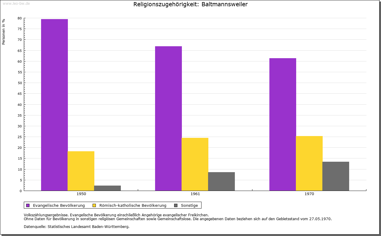 | Kirche und Schule: | Bis 1440 bestand in Baltmannsweiler keine eigene Pfarrei, der Ort wird 1360 als Filiale des in teckischem Einflussbereich gelegenen Hochdorf (bei Kirchheim/Teck) genannt. Die genauen Hintergründe dieser kirchenrechtlichen Verbindung mit der nicht direkt benachbarten Mutterpfarrei sind ungeklärt. Sicher ist, dass mit Zustimmung des Bischofs von Konstanz der Ort auf Drängen der Einwohner 1440 zur eigenständigen Pfarrei erhoben wurde, zumal ein Sakralbau, dessen Patrozinium Sankt Ägidius schon 1436 genannt wird, und ein Begräbnisplatz bereits vorhanden waren. Dieser Neuordnung der kirchlichen Verhältnisse stimmten die Grafen von Württemberg zu, die zudem das Patronat übernahmen. 1534 wurde im Ort konsequent die Reformation eingeführt. Die Kirche wurde 1648 von Turenne’schen Reitern niedergebrannt, die Pfarrei blieb bis 1680 unbesetzt. Schulunterricht wurde nachweislich schon seit 1605 erteilt, in den ersten Jahren besuchten ihn auch Schüler der Nachbarorte. Für einen Schulhausbau fehlten lange Zeit die Mittel; der Lehrbetrieb fand stattdessen im Rathaus statt, von dem es aber 1763 hieß, es sei ganz baufällig. Dennoch bekamen die Schüler erst am Ende des Jahrhunderts in Nachbarschaft zum Rathaus ein eigenständiges Schulgebäude. Die evangelische Pfarrkirche, 1486 erbaut, angeblich als Stiftung eines Junkers Schwelher, mit Vieleckchor und Seitenturm, nach Zerstörung (1648) durch die Franzosen 1681 wieder aufgebaut. Katholische Pfarrei Mariä Himmelfahrt und Kirche seit 1965. |
