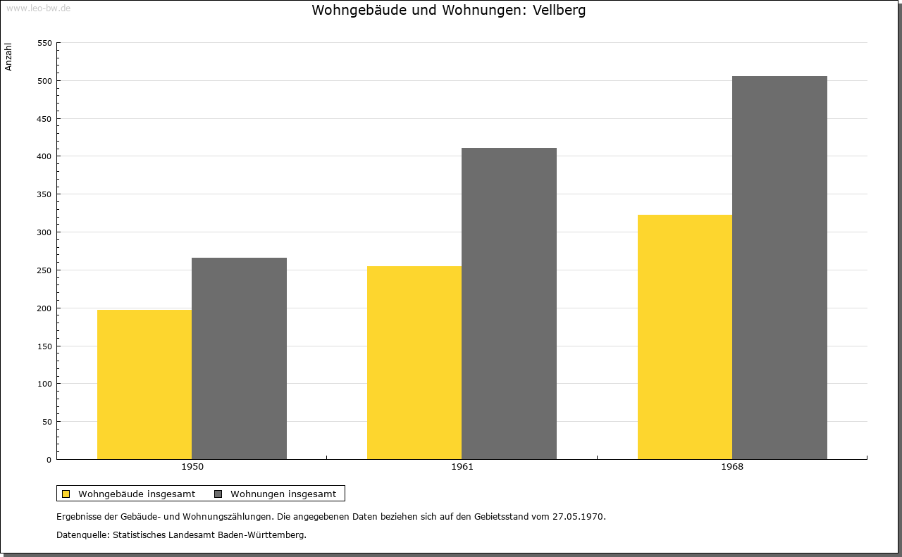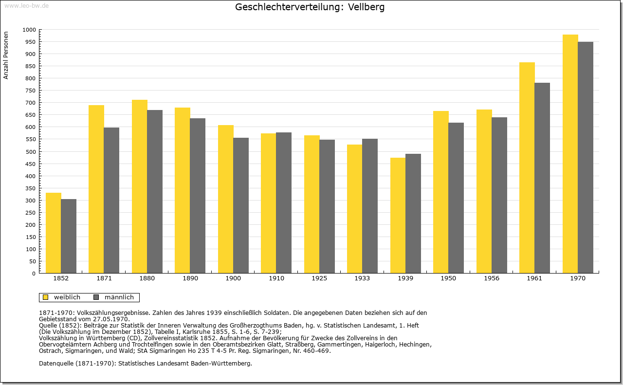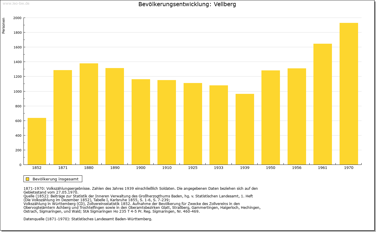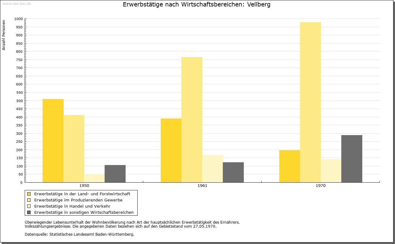 Wirtschaft und Bevölkerung: Angaben über die Einwohnerzahl von Vellberg liegen für die Frühneuzeit nicht vor. Unter den 297 Toten, die im Herbst 1634 in wenigen Wochen an der Pest starben, befanden sich auch zahlreiche Menschen, die sich aus den umliegenden Dörfern in die ummauerte Stadt geflüchtet hatten. 1805 lebten im Ort 435 Einwohner. Die Landwirtschaft wurde in der üblichen Dreifelderwirtschaft betrieben. Die Wirtschaftsflächen waren, wie für einen ehemaligen Burgweiler typisch, mit rund 250 Morgen klein. Es gab in der Frühneuzeit fünf Höfe mit mehr als 20 Morgen Ackerland, zudem noch zehn Güter (zwischen 5 Morgen und 20 Morgen Ackerland) sowie sieben kleinere Gütlein und zwei Feldlehen. Mit dem Privileg von König Maximilian I. aus dem Jahr 1500 bekam Vellberg das Recht, jährlich vier Jahrmärkte abzuhalten. Die herrschaftliche Zollstation ist erstmals 1595 genannt. Im Ort gab es in der Frühneuzeit zwei Wirtschaften, die erstmals 1408 genannte herrschaftliche »Erbschenkstatt« (mit Braurecht, ab 1665 in Privatbesitz, heute Gasthof Ochsen) und der vor der Stadtmauer 1619 errichtete »Schwarze Adler« (so im 18. Jahrhundert der Name der Schildwirtschaft). An der Bühler stand die Badstube. Daneben finden sich die üblichen Handwerker eines kleinen Marktorts; vor der Stadt befand sich auch die Schmiede. Die Mühle an der Bühler ist erstmals 1367 genannt (Mühle unter der Burg, Bühlsmühle). Sie war der Herrschaft zinspflichtig und in der Neuzeit mit zwei Mahlgängen und einem Gerbgang ausgestattet. Die Konzession zur Errichtung einer Sägemühle wurde 1804 erteilt.