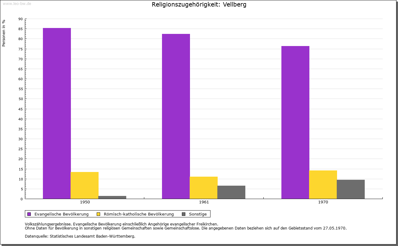 Kirche und Schule: Vellberg war traditionell Filial der Martinskirche auf der Stöckenburg. Die mittelalterliche, kreuzgratgewölbte Schlosskapelle Sankt Georg wurde 1546 in den Neubau des Schlosses mit einbezogen und um 1550 mit einem protestantischen Passionszyklus ausgemalt (Wappen der Stifterfamilien). Bereits 1419 hatten die Herren von Vellberg eine Kaplaneipfründe, die Neue Kaplanei, gestiftet, deren Inhaber verpflichtet waren, an den Werktagen am Unseren-Lieben-Frauen- und Georgsaltar in der Kapelle eine Messe zu lesen. Das Nominationsrecht der Pfründe lag bei der Stifterfamilie, das Präsentationsrecht beim Patronatsherrn der Stöckenburg. Die Pfründe war mit einem Haus und einer Hofstatt ›unterm Berg zu Vellberg‹ ausgestattet. Nach dem Erwerb des Patronatsrechts über die Stöckenburg 1545 durch die Herren von Vellberg wurde die Pfarrei Anhausen, zeitweise Filial der Stöckenburg, mit der Neuen Kaplanei verbunden, der Pfarrer hatte seinen Sitz im Bühlerpfarrhaus, dem alten Pfründhaus des Schlosskaplans. Zeitweise waren Bühlerpfarrei und Stöckenburg in Personalunion verbunden; in Phasen konfessioneller Auseinandersetzungen mit Würzburg und dem Stift Comburg war der evangelische Pfarrer für die Betreuung Vellbergs zuständig. 1569 wird erstmals ein Schulmeister genannt. Ein Schulgebäude wurde 1573 auf der Stöckenburg eingerichtet, 1603 wurde das Haus von Grund auf erneuert. Erst 1806/07 wurde die Schule nach Vellberg verlegt. Katholiken zu Schwäbisch Hall-Hessental.