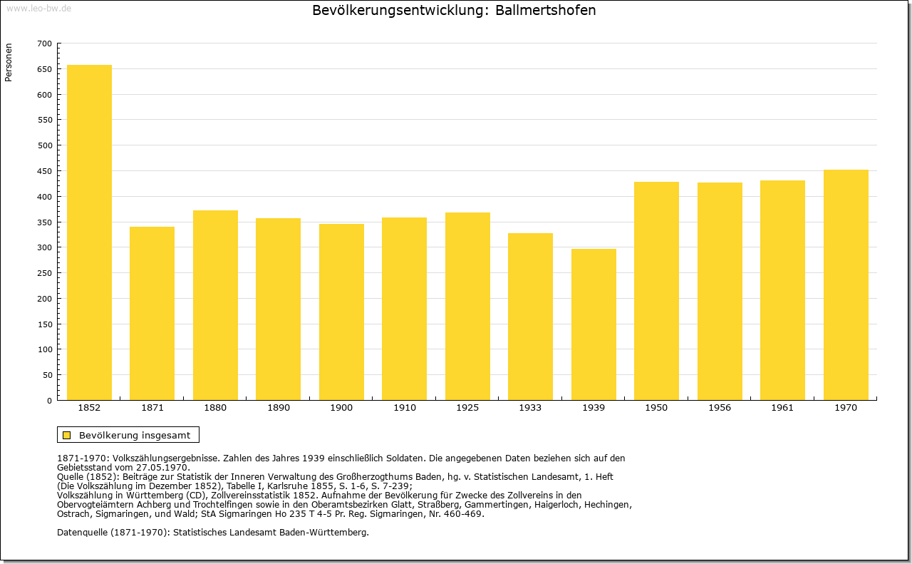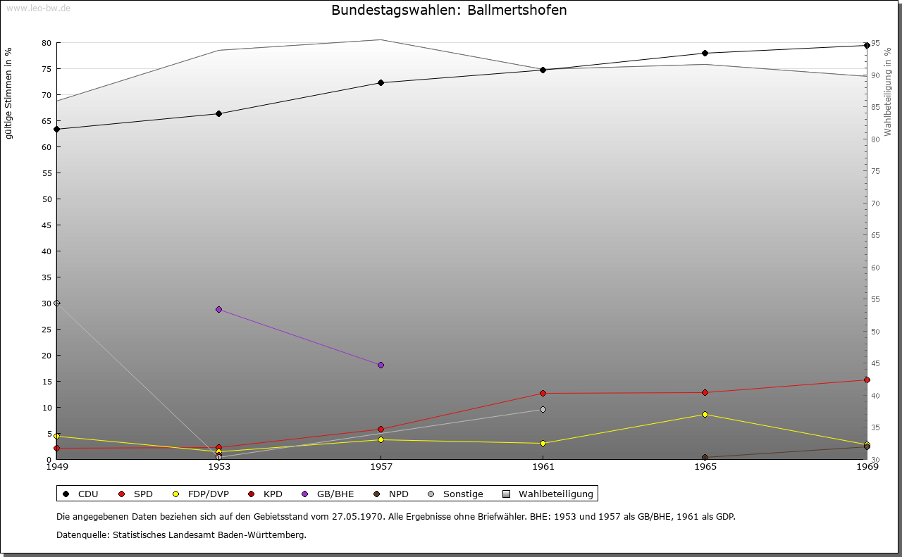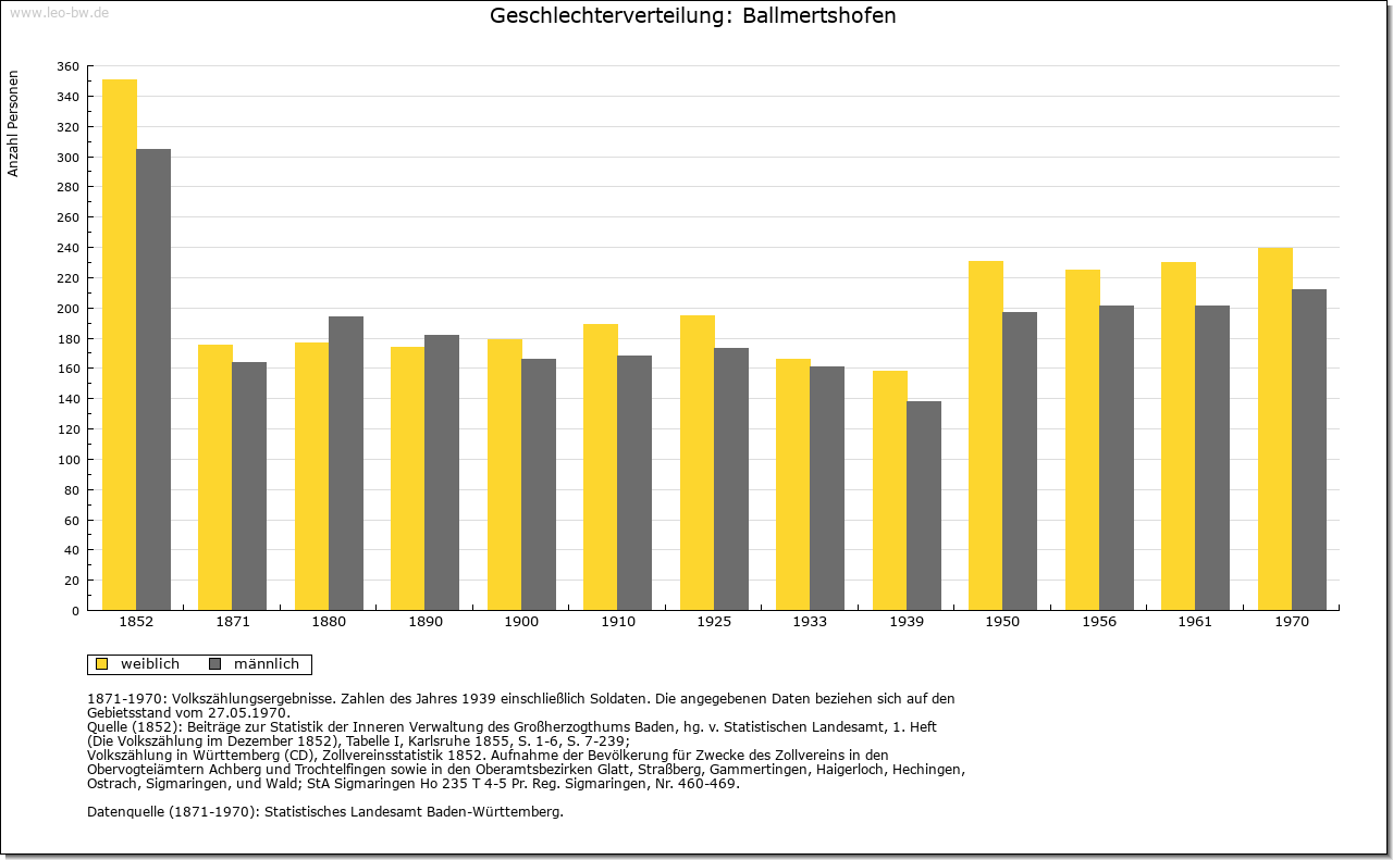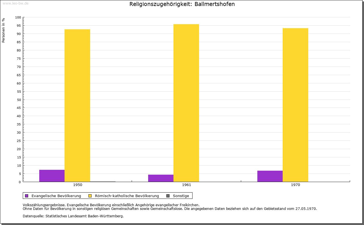 | Geschichte: | 1139 (Кор. 18. Jahrhundert) Baltrameshoven (unsicher, ob hierher), um 1140 (Кор. 12. Jahrhundert) Baltrammeshoven, 1236 Balmershoven, 1368 Baltmarßhofen (Personenname), Siedlung der älteren Ausbauzeit. Gehörte zum Teil den Grafen von Dillingen, die ihren Besitz 1236 an Kloster Neresheim schenkten, dem der Ort 1298 ganz gehörte. Die Burg samt dem Hauptteil des Ortes einschließlich des Besitzes der nur 1140 mit Rehewin von Ballmertshofen vorkommenden Adelsfamilie kam an die von Westerstetten zu Altenberg (Landkreis Dillingen). Durch Weiterverkauf gelangte die Hälfte des Anteils der von Westerstetten 1442 an Ulm, das noch weitere Güter erwarb, aber 1512 wegen obrigkeitsrechtlicher Streitigkeiten mit Pfalz-Neuburg das ganze Rittergut an die von Westernach zu Trugenhofen weiterveräußerte. Durch Erbschaft kam der Besitz 1535 an die von Leonrod und von St. Vincent, die wegen der ständigen Unstimmigkeiten mit Pfalz-Neuburg, das die Landeshoheit beanspruchte, das Rittergut trotz Widerspruchs des Ritterkantons Kocher 1749 an Thurn und Taxis veräußerten. 1806 Anfall an Bayern, 1810 an Württemberg, bis 1938 Oberamt Neresheim, seitdem Landkreis Heidenheim. |