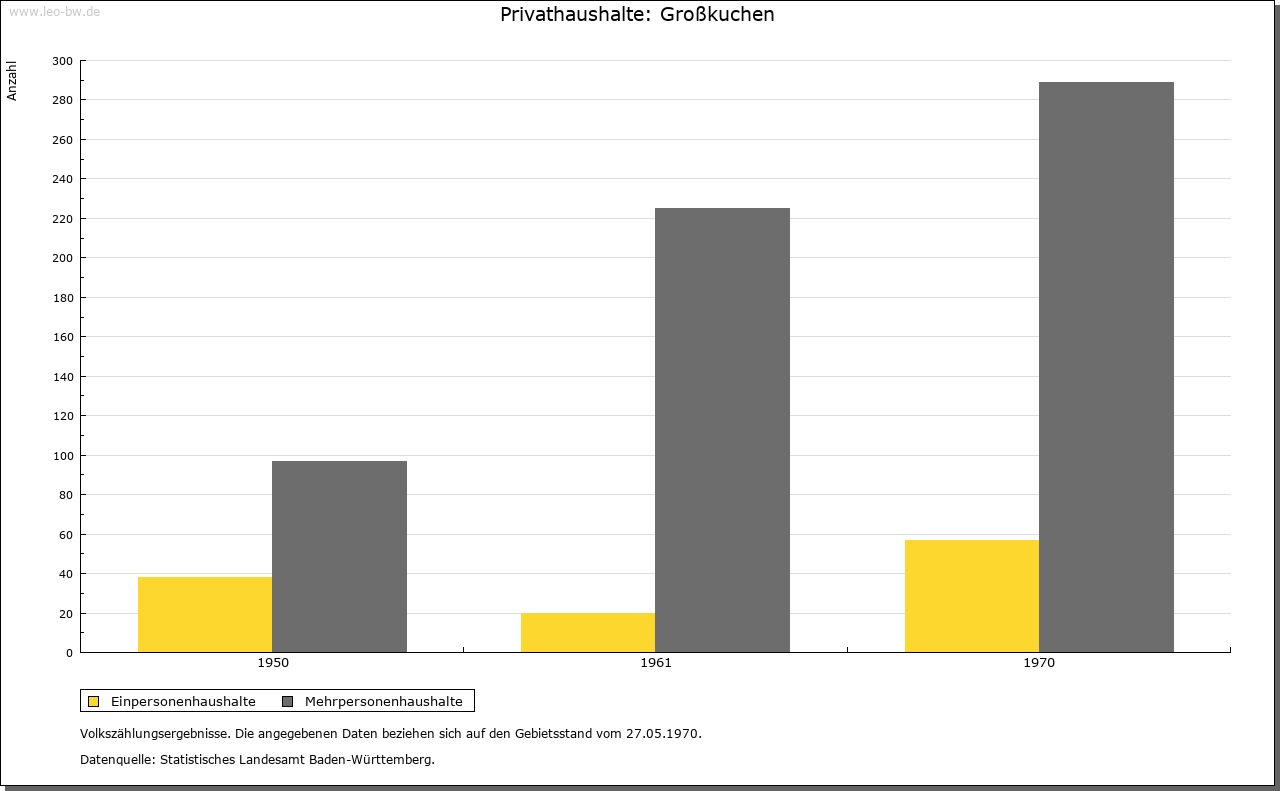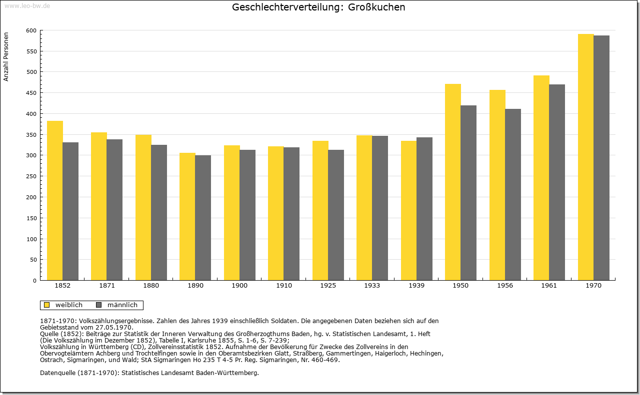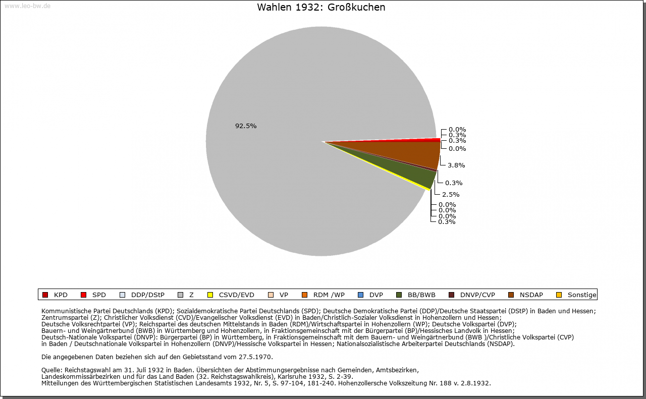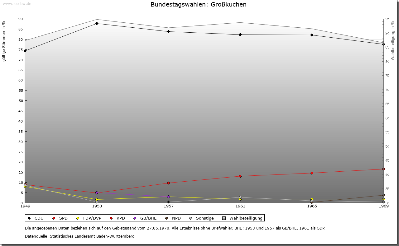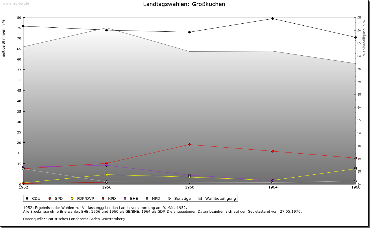 | Geschichte: | In älteren Nennungen werden Groß- und Kleinkuchen nicht immer unterschieden; 1298 erstmals Chuechen maior und Chuechen minor. Im 8. Jahrhundert erhielt Kloster Fulda Besitz in Chuocheim (Кор. 12. Jahrhundert; Name ungedeutet), das zum Brenzgau gerechnet wurde. Großkuchen ist auf Grund von zwei Reihengräberfriedhöfen der ältesten Siedlungsschicht zuzurechnen. Waren in älterer Zeit vor allem Kloster Ellwangen und die Grafen von Öttingen in Großkuchen begütert, so kam gegen Ende des 13. Jahrhunderts das meiste an Kloster Neresheim, nämlich 1297 der Besitz der Öttinger, 1299 und 1300 Lehengüter von Ellwangen. Daneben war nur noch Kloster Lorch (wohl von den Staufern her) begütert, das aber seinen Besitz 1471 an die Kapfenburg abtrat. Aufgrund der Vogtei über Neresheim waren Obrigkeit und Dorfherrschaft seit 1258 in Händen der Öttingen; 1764 traten diese ihre Rechte an das Kloster ab. Mit ihm fiel Großkuchen 1802 an die Thurn und Taxis und zählte zum Oberamt Dischingen. Nach bayerischer Landeshoheit 1806 — 1810 kam das Dorf an Württemberg, Oberamt Neresheim, seit 1938 Landkreis Heidenheim. — 1796 war die Gegend um Großkuchen zwei Tage Kampfgebiet zwischen Österreichern und Franzosen. |