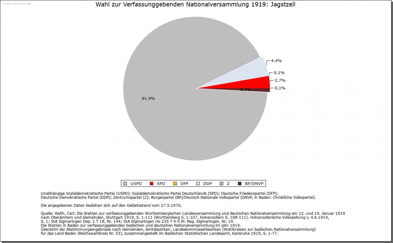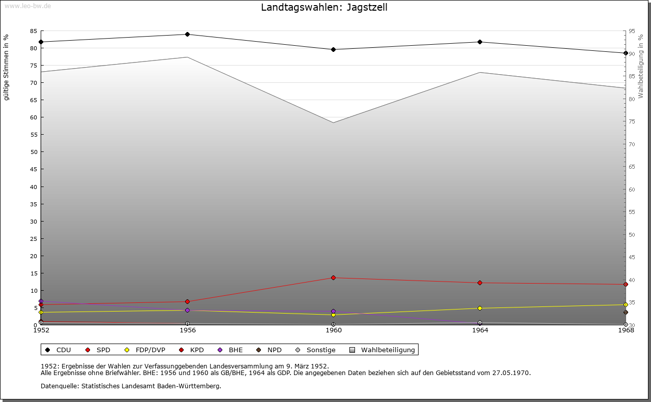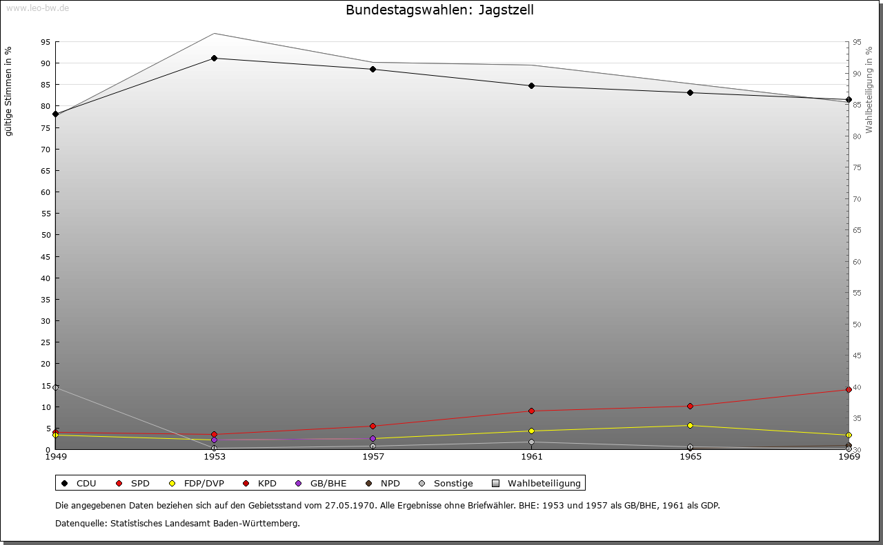 | Geschichte: | 1170 cella sancti Viti. Ein Abt von Ellwangen gründete hier vor 1000 ein Frauenklösterlein, die Zelle St. Veit, dessen Propst Inhaber der Pfarrei Stimpfach war. Wie lange das Klösterlein bestand, ist unbekannt; später ist nur eine ellwangische Propstei hier, die gegen Ende 14. Jahrhundert dem ellwangischen Keller Kraft von Killingen zur Nutznießung überlassen und 1399 dem Kelleramt einverleibt wurde. Die Bezeichnung Propstei erscheint nach dem 15. Jahrhundert nicht mehr. Der Ort entstand im Anschluß an die Zelle. 1460—1802 war Jagstzell Sitz eines kapitularischen Schultheißen. Seit 1796 übte Preußen als Rechtsnachfolger von Brandenburg-Ansbach die Landeshoheit über ein Drittel des Orts, das 1806 an Bayern und 1810 an Württemberg kam, aus; der Ellwanger Teil fiel 1802 an Württemberg. Bis 1938 Oberamt Ellwangen, dann Landkreis Aalen. |