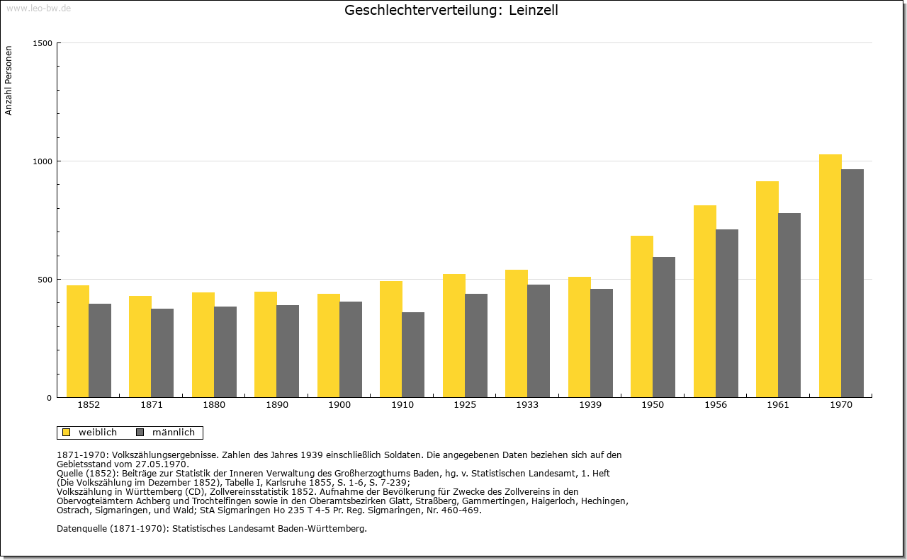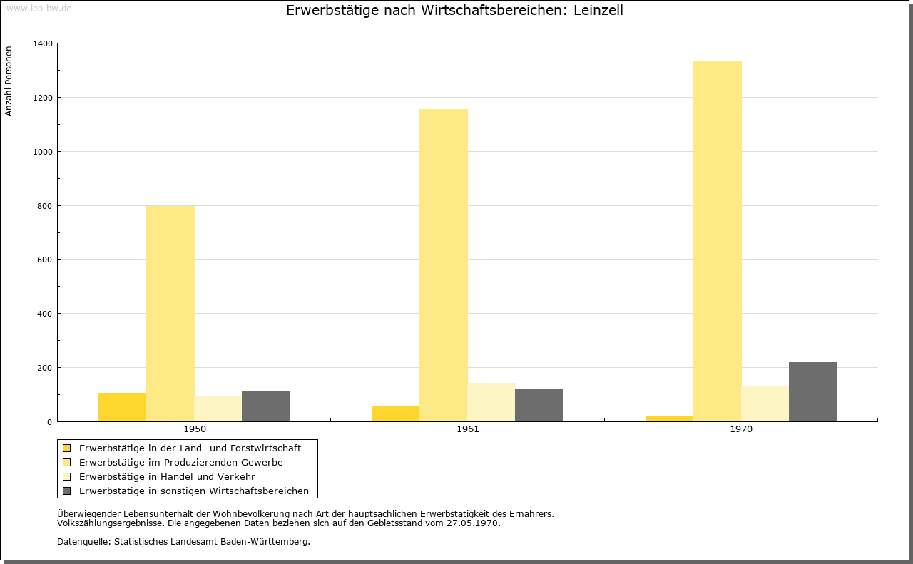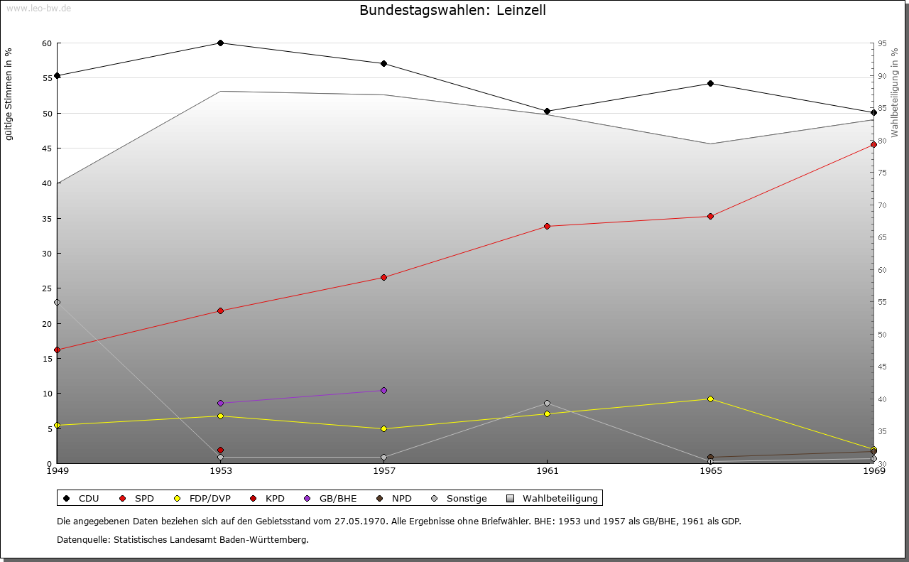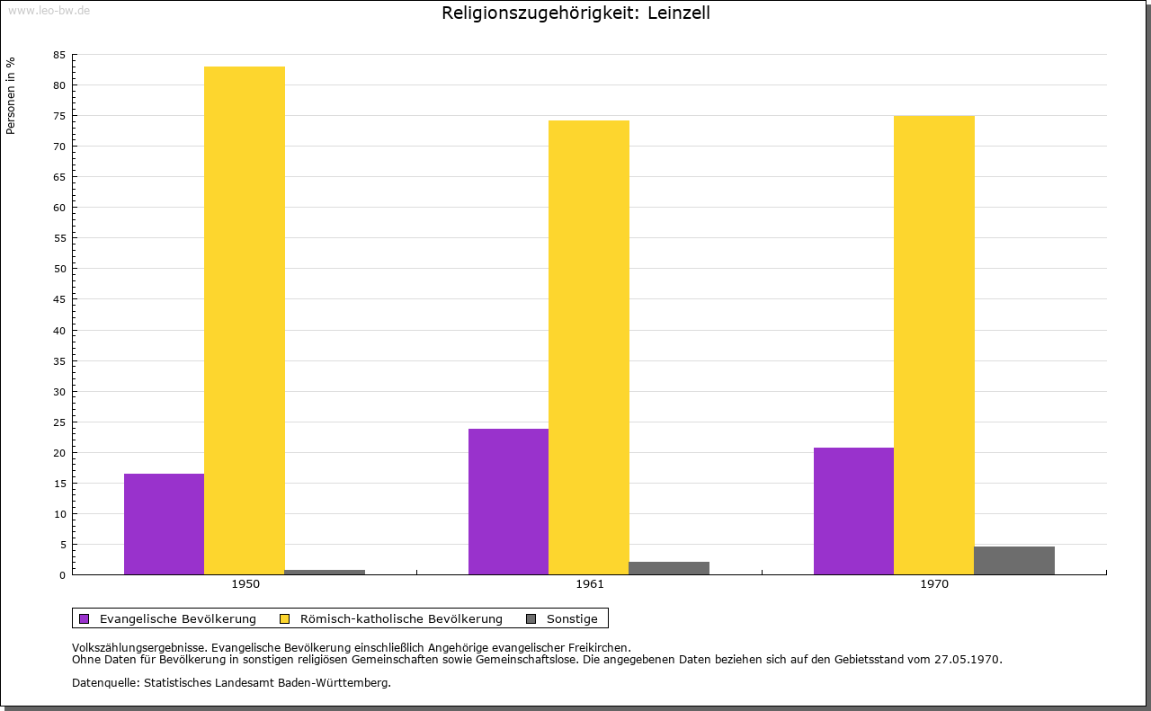 | Geschichte: | 1259 Cella, 1409 Zell an der Lin, 1456 Lynzell. Der Ortsname weist auf eine frühe klösterliche Niederlassung an der Lein, die wohl von Ellwangen ausging, aber keine Spuren hinterlassen hat. Eine Mühle eignete Kloster Ellwangen 1356 dem Albrecht Hack. Die Feste mit Zubehör trugen 1360 — 1483 die Gmünder Taler genannt Burger von Kloster Ellwangen zu Lehen, seit 1484 die von Westerstetten, seit 1530 die von Horkheim, seit 1612 die Faber von Randeck. Nach Aussterben der von Randeck im Mannesstamm gab Ellwangen das heimgefallene Lehen 1636 an den wallensteinischen Kriegskommissar Valentin Lang, der 1634 in den Reichsfreiherrenstand erhoben worden war und als Oberamtmann in ellwangische Dienste trat. Zum Rittergut Leinzell, das dem Kanton am Kocher immatrikuliert war, gehörten außer Schloß und Dorf sowie dem Weiler Ölhäuser auch einige Untertanen in Göggingen. Das Schloßgut ist noch heute im Besitz der Familie. 1806 kam Leinzell unter württembergische Landeshoheit; seither Oberamt, seit 1938 Landkreis Schwäbisch Gmünd. — Der um 1790 eingeführte Weinbau ging bald wieder ab. Die wirtschaftliche Lage der Einwohner war lange Zeit sehr ungünstig. Im 18. Jahrhundert, namentlich nach einer 1776 erfolgten Teilung der Herrschaft, siedelten die von Lang zur Steigerung ihrer Einkünfte zahlreiche besitzlose Fremde an, die auf der kleinen Gemarkung, die zur Hälfte zum Schloß gehörte, keine Erwerbsmöglichkeiten fanden und sich durch Wandergewerbe (als Kesselflicker, Scherenschleifer und dergleichen) und Hausierhandel mit selbstgefertigten Korb-, Bürsten-, Besen- und anderen Waren sowie durch Bettel zu ernähren suchten. Im 19. Jahrhunderft versuchte der württembergische Staat durch Gründung einer Industrieschule, die Verdienstmöglichkeiten durch Heimarbeit für auswärtige Fabriken schaffen sollte, der Notlage abzuhelfen. Allein im Jahr 1852 wanderten 28 Familien mit staatlicher Beihilfe nach Amerika aus. 1855 — 1877 stand die Gemeinde unter Staatsaufsicht. — Im 30 Jährigen Krieg wurde fast der ganze Ort einschließlich des Schlosses verbrannt. |