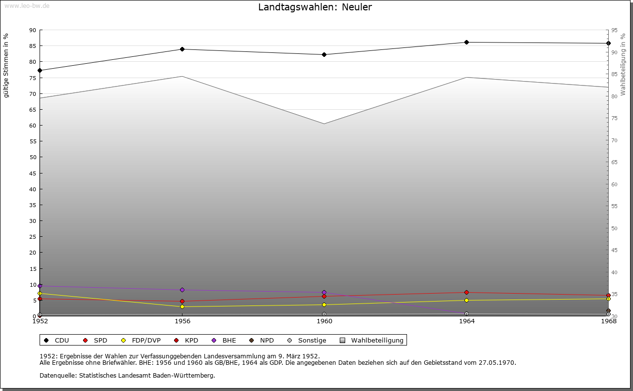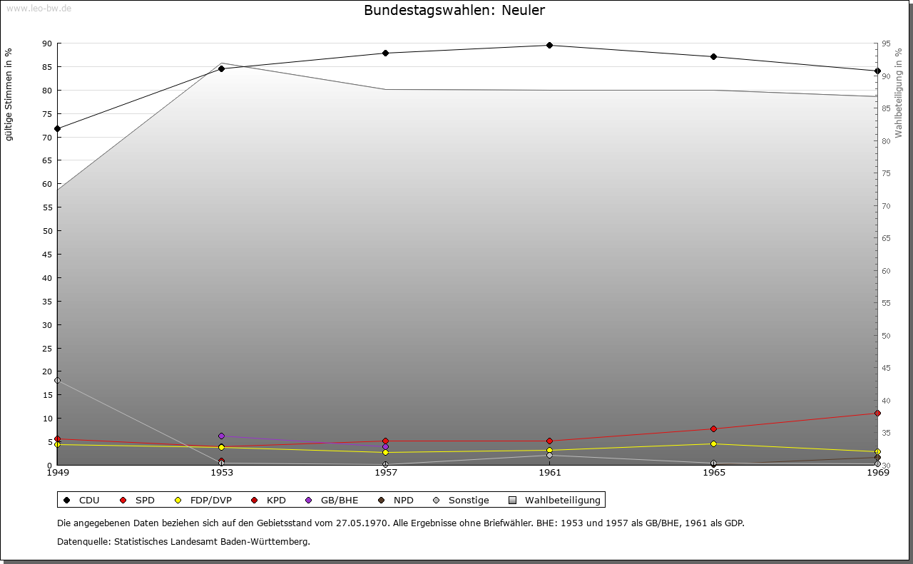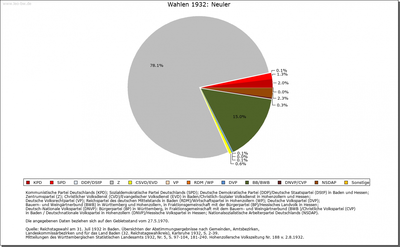 | Geschichte: | Um 1113 Nueler (= neu und lari?). Der Ort kam allmählich fast ganz an das Kapitel des Stifts Ellwangen, das einige von den von Rinderbach im 14. Jahrhundert erkaufte Güter von den Schenken zu Limpurg und dann von Ansbach beziehungsweise von Preußen zu Lehen trug. Einige Güter gehörten zur Herrschaft Adelmannsfelden. Der Ort fiel 1802 an Württemberg. Bis 1938 Oberamt Ellwangen, dann Landkreis Aalen. |