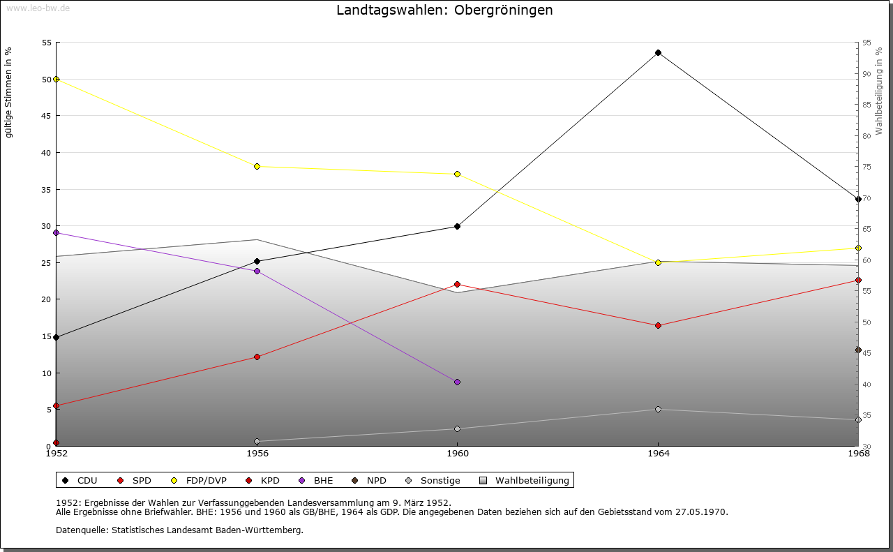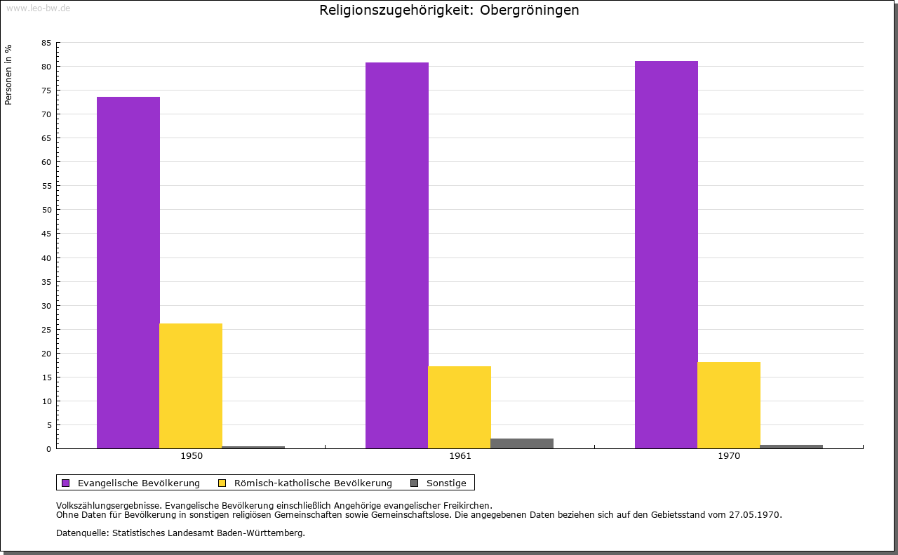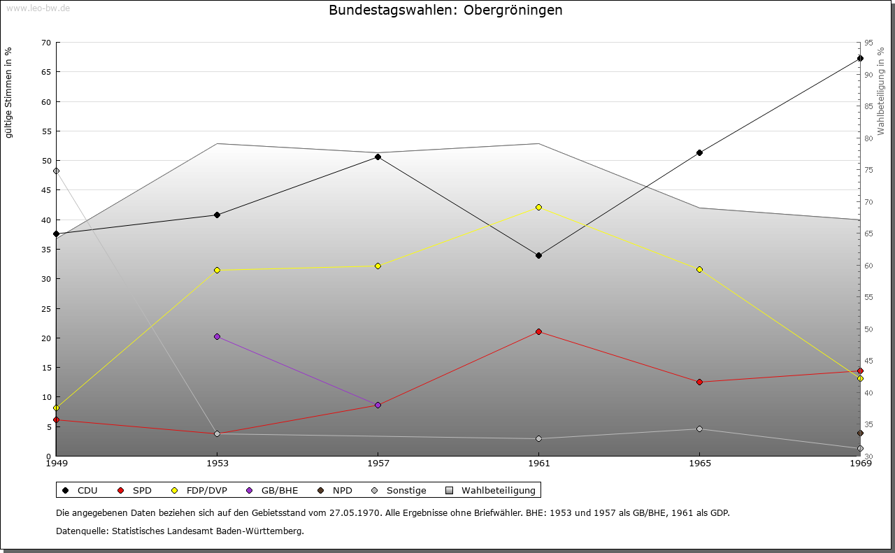 | Geschichte: | 1248 Gruningen (Personenname), Ort der ältesten Siedlungsschicht. Ob mit Gruningen, in dem 1248 Kloster Comburg begütert war, Ober- oder Untergröningen gemeint ist, steht nicht fest. Jedenfalls gilt Obergröningen als der ältere der beiden Gröningen-Orte. Der Ort kam von den von Rechberg 1436 zusammen mit Untergröningen an die Schenken von Limpurg. Das Dorf zählte damals neun Höfe und Lehen. Es gehörte nach der limpurgischen Erbteilung ins Amt Untergröningen des Landesteils Limpurg-Gröningen, der 1774 an Hohenlohe-Bartenstein fiel. Kam 1804 durch Tausch an die Fürsten von Colloredo-Mansfeld, 1806 an Württemberg. Oberamt Gaildorf, seit 1938 Landkreis Schwäbisch Gmünd. Im 30 Jährigen Krieg starb das Dorf nahezu aus. In neuerer Zeit stieß man auf ein Massengrab mit Pesttoten. Allein 1635 starben 100 Personen an Seuchen. |