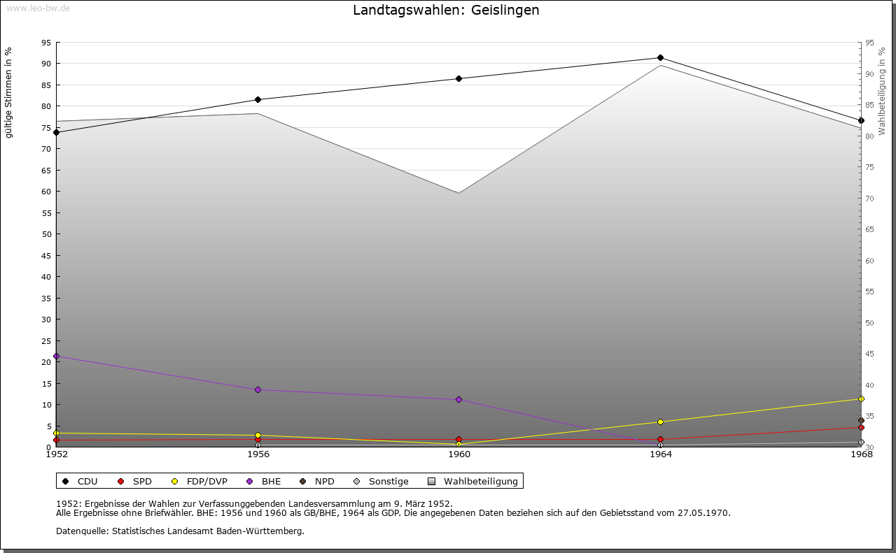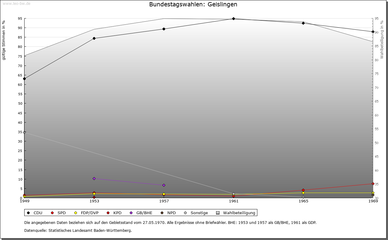 | Geschichte: | 1153 Giselingen (Personenname Gisilo). Ortsadel 1153 — 1501, öttingische Ministerialen (Wappen: ein Stiefel). Der Ort kam, wohl durch eine Hürnheimer Erbtochter, im 15. Jahrhundert an die Herren von Königsegg, die ihn 1485 an den Deutschen Orden verkauften; dieser veräußerte ihn 1509 an die seit dem 14. Jahrhundert hier begüterten Grafen von Öttingen. Das Frauenkloster Lindau erhielt schon im 12. Jahrhundert von einem Graf Uzzo Besitz, den es 1346 an Heinrich von Schwenningen verkaufte. Außerdem waren 1363 Kloster Zimmern, seit 1364 Kloster Kaisheim und 1366 das Hochstift Augsburg begütert. Geislingen gehörte seit den Öttinger Teilungen der Linie Wallerstein; es kam 1806 an Bayern, 1810 an Württemberg. Bis 1938 Oberamt Ellwangen, dann Landkreis Aalen. |