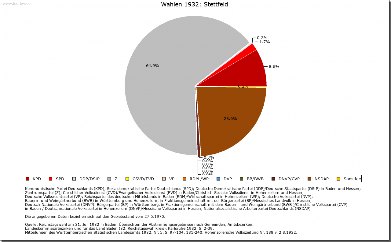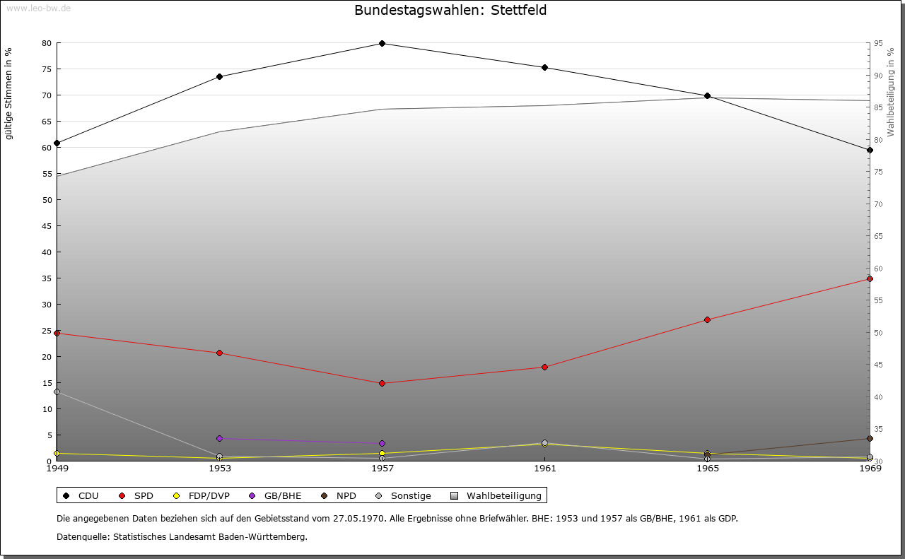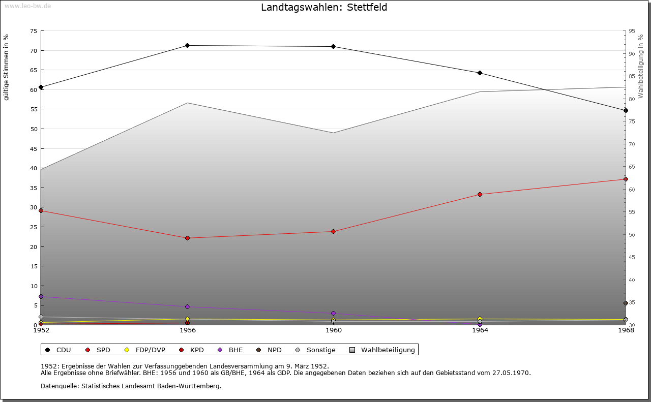 | Geschichte: | Um 1100 (Корialüberlieferung 16. Jahrhundert) Stettueld, um 1250 Stetveld. Der Name kennzeichnet wohl die Trümmerstätten des römischen Vicus an der Straße Speyer-Cannstatt, über dessen Namen nur Vermutungen möglich sind (vgl. Zeutern). Wiederbesiedlung wohl noch zur Merowingerzeit. Im frühen 12. Jahrhundert eine edelfreie Familie von Stettfeld, wahrscheinlich die Vorläufer der Herren von Kislau (vgl. Gemeinde Bad Schönborn). Mit der Herrschaft Kislau kam Stettfeld vor 1250 an den Bischof von Speyer und verblieb beim Amt Kislau. 1803 badisch, seit 1807 zum Amt Bruchsal. Die Gemarkung 1931 durch Zuteilung eines Lußhardtanteils nach Westen erweitert. |