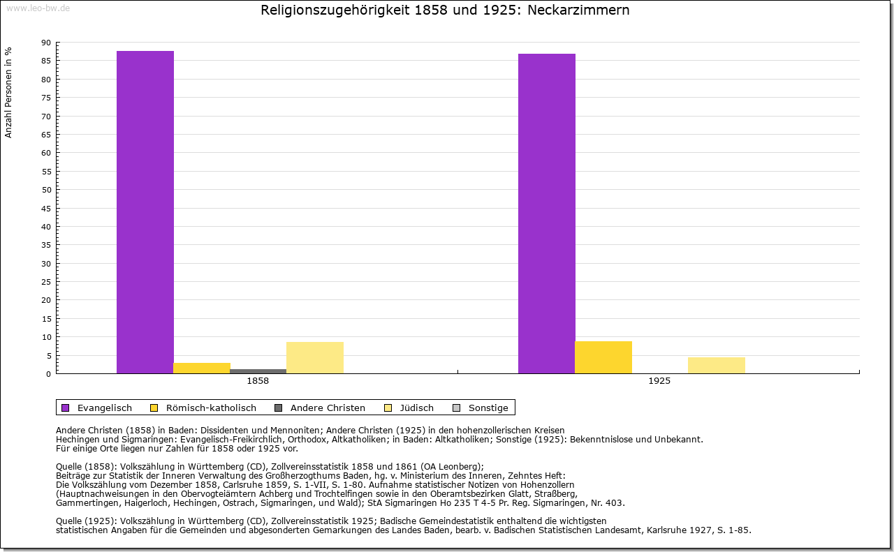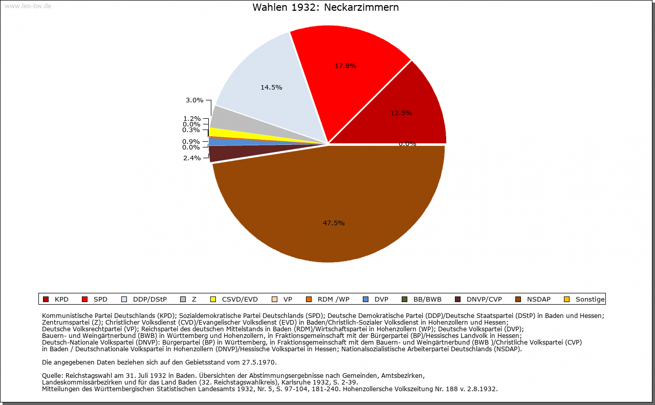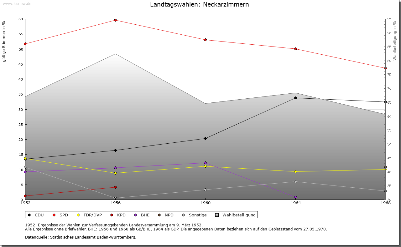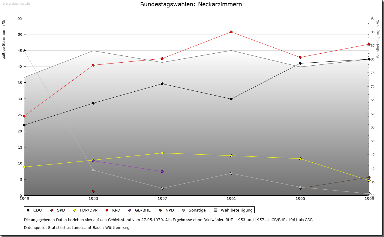 | Geschichte: | 788 (Kopialüberlieferung 12. Jahrhundert) Cimbren, zu den Holzbauten. Fränkischer Ausbauort. Lorscher und Kloster Mosbacher Besitz. Über dem Dorf die Burg Hornberg, 1192 erstmals mit zugehöriger edelfreier Familie genannt, diese vielleicht Lehnsleute der Grafen von Lauffen. Ab Mitte 13. Jahrhundert verschiedene Ministerialenfamilien, die Pfau und die Horneck von Hornberg, letztere bald nach Hochhausen übergewechselt. Die Burg und damit auch die Herrschaft über Zimmern kamen 1250 erstmals, dann endgültig 1336 ans Bistum Speyer. 1341 erhielt Bischof Gerhard für den unmittelbar unterhalb der Burg liegenden Weiler Steinbach ein nicht ausgewertetes Stadtrechtsprivileg. Ab 1430 wieder als Lehen an die von Helmstatt, die von Horneck, die von Sickingen und die von Flehingen ausgegeben. Teile der Burg auch mit lehnsherrlichem Konsens im 15. Jahrhundert von Pfalz wohl als Pfand erworben und wieder an den Adel (von Balzhofen) verliehen. Von 1467 an die Schott als Inhaber von Teilen genannt. 1517 die Burg durch Konrad Schott an Götz von Berlichingen verkauft, dieser musste auf ihr nach dem Bauernkrieg 16 Jahre lang stillsitzen und ist hier 1562 gestorben. 1594/1602 Burg und Herrschaft an die von Heusenstamm verkauft, 1612 an einen Zweig der von Gemmingen, der sich bis heute nach Hornberg nennt. Die Burg auf einem durch Halsgraben gesicherten Sporn ist eine Anlage des 13. Jahrhunderts mit rundem, gegen das Burginnere abgeflachtem Bergfried. Südlich davon eine zweite, vielleicht anfangs selbständige Befestigung mit Mantelmauer, eventuell ebenfalls 13. Jahrhundert. Im 14. Jahrhundert werden 2 Burgen bezeugt, später alles mit einer langgestreckten Ringmauer umgeben. Im Ort errichteten die von Gemmingen 1612/35 ein kleines, im 19. Jahrhundert umgestaltetes Schloss, das noch gut erhaltene Rentamt. Neckarzimmern steuerte zum Ritterkanton Kraichgau, gehörte aber, was die Blutgerichtsbarkeit betraf, zur pfälzischen Zent Mosbach. 1806 badisch, seit 1813 Amt Mosbach. |
