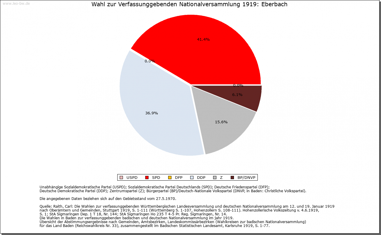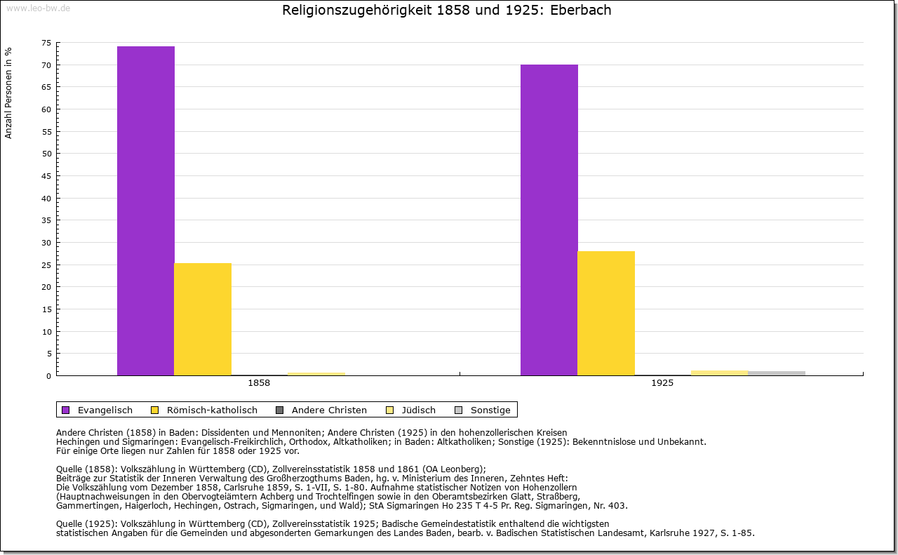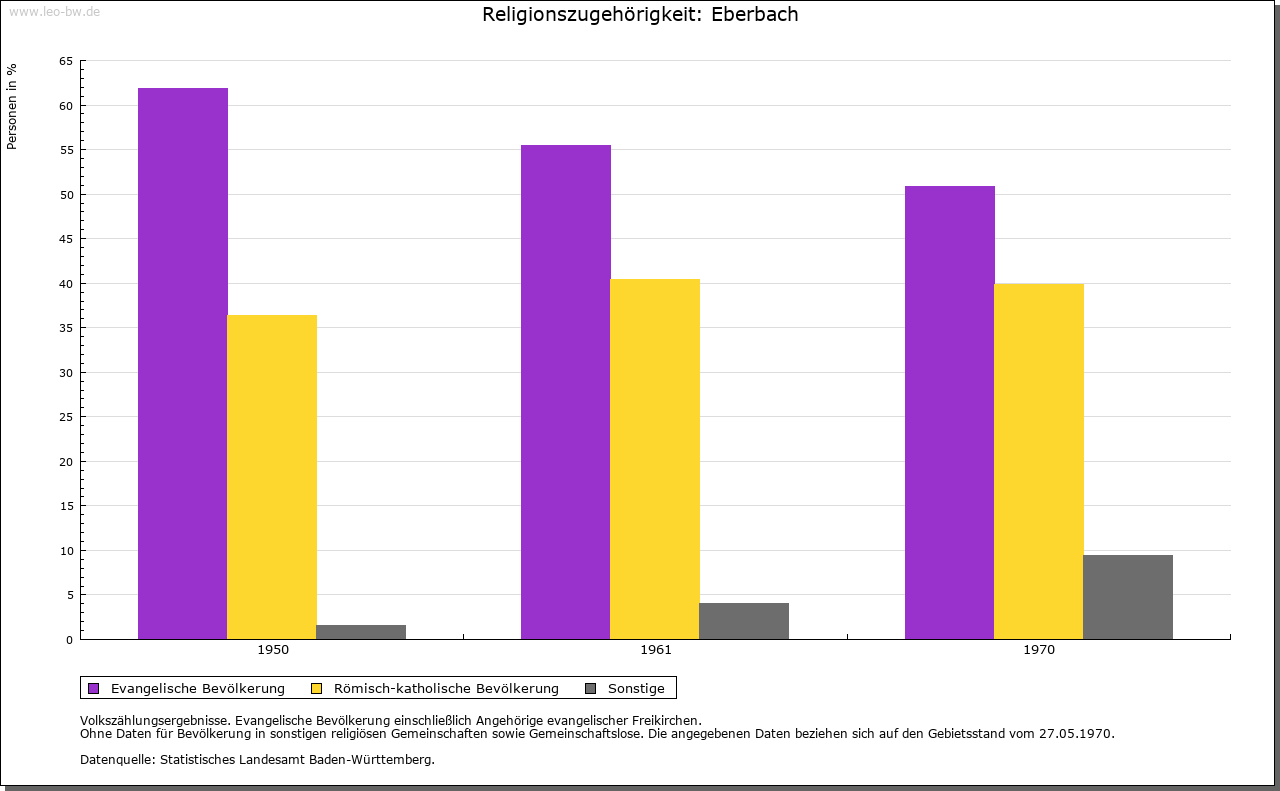 | Kirche und Schule: | Die Pfarrei Eberbach, unbekannten Patroziniums, gehörte zur Diözese Würzburg, umfasste außer den vier Weilern noch Hebstahl und ursprünglich auch Rothenberg (heute beide in Hessen). Das Patronatsrecht kam 1361 als Reichslehen an die Kurpfalz. 1426-1429 beim Oberen Tor neue Kirche für die Stadt gebaut, die alte blieb Friedhofskapelle. Ab 1556 erlebte Eberbach das Schicksal der pfälzischen Reformationsgeschichte, die Stadtkirche wurde 1707 definitiv refomiert, die Friedhofskirche den Katholiken überlassen. Evangelische Pfarrkirche 1840 in nachklassizistischen Formen. Katholische Pfarrei seit 1688, neue Kirche St. Johann Nepomuk 1887 im Neubarock, 1961 Pfarrkuratie St. Joseph. 1845 Höhere Bürgerschule, diese 1874 zur Realschule; 1930 Realgymnasium, seit 1963 Hohenstaufengymnasium. |