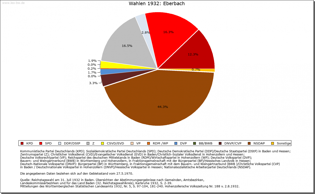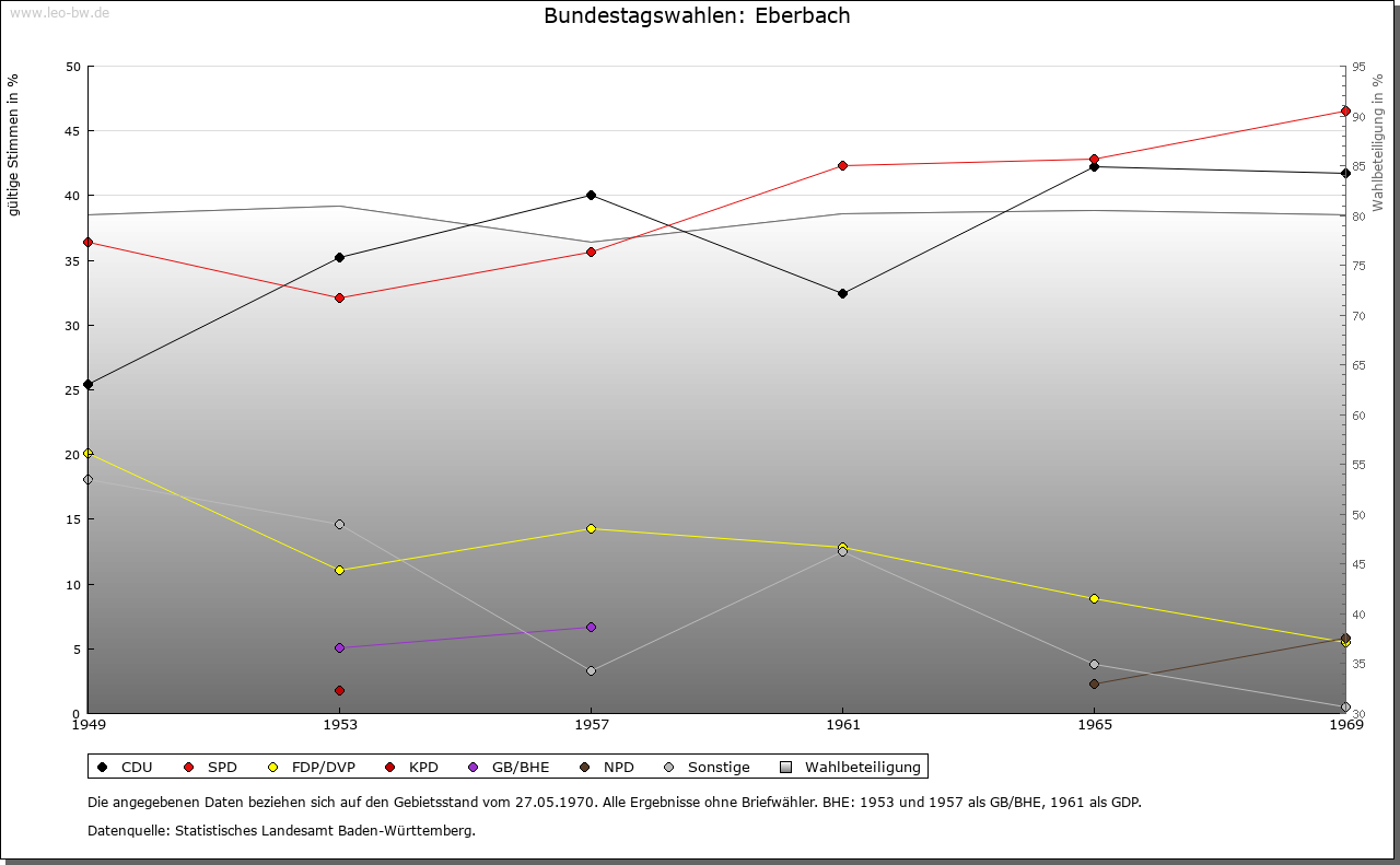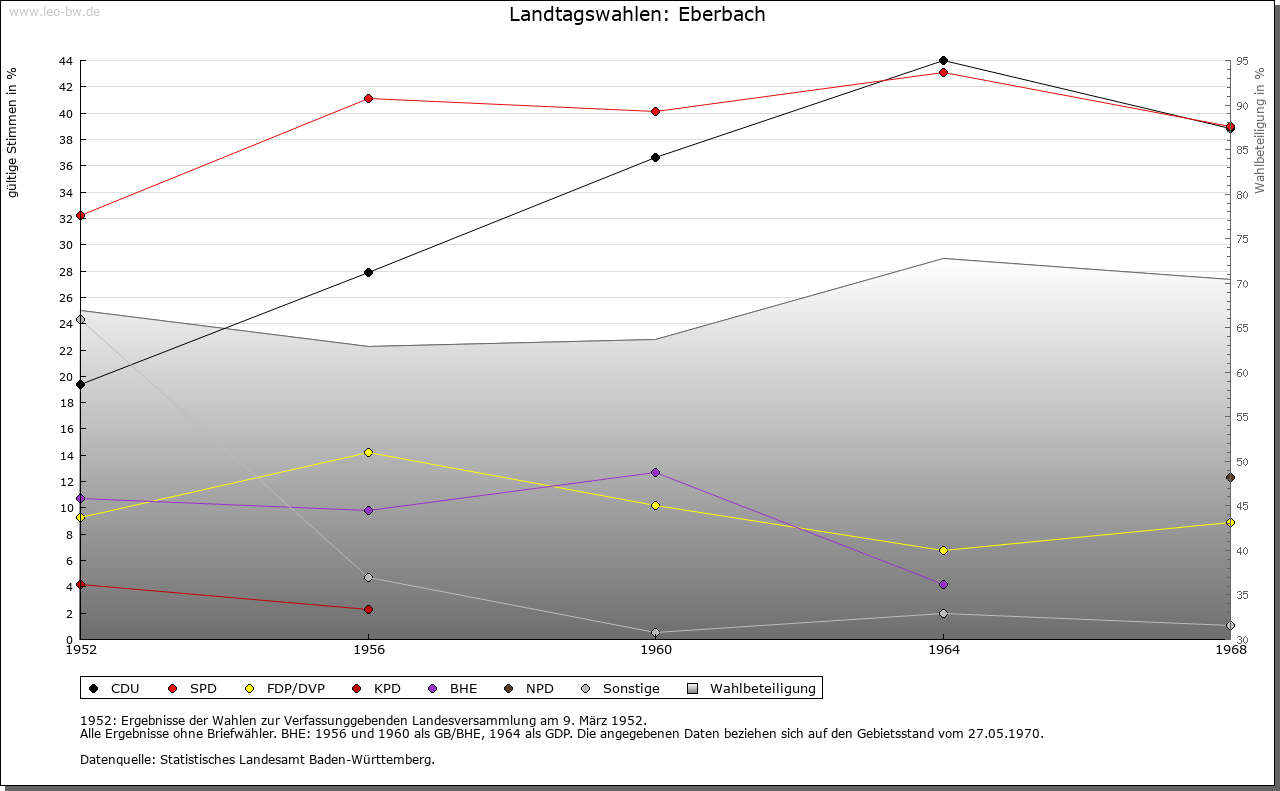 | Geschichte: | 1196 Eberbach. Ausbausiedlung wohl vor 1000 angelegt in Waldgebiet, das durch verschiedene Schenkungen des Königs ganz in die Hand des Wormser Bischofs geriet. Ursprünglich Weiler bei der heutigen katholischen Pfarrkirche. 1227 an König Heinrich (VII.) zu Lehen gegeben, spätestens 1241 Reichsstadt. Diese auf einem Rechteckgrundriss mit exzentrischen Hauptachsen unmittelbar am Neckar. Die Pfarrkirche verblieb im alten Weiler. Die Stadt nach Brand um 1340 gänzlich neugebaut, Neckartor und Oberes Tor im Norden, Unteres Tor im Westen, Ausgang nach Osten nur zeitweilig. Erhalten noch Teile der Mauer und der vier Ecktürme. Auf hohem Sandsteinsporn nordöstlich der Stadt die 3 Eberbacher Burgen unmittelbar hintereinander; 1908/09, 1927/28 und 1959/63 ausgegraben und z. T. restauriert. Die Vorderburg innerhalb schwacher unregelmäßiger Ringmauer noch aus der bischöflichen Zeit (frühes 12. Jh.); die Mittelburg mit mächtigem Bergfried ohne Buckelquadern und mit Palas steht in den architektonischen Zierformen im Zusammenhang mit der Wimpfener Pfalz; die langgestreckte Hinterburg, auffallenderweise mit Südturm, wohl auch im wesentlichen noch aus der Zeit König Heinrichs (VII.). Die Burgen wahrscheinlich Sitz eines spärlich bezeugten Eberbacher Ministerialenadels (1200-1228) und des Grafen Konrad von Eberbach (1196), vermutlich aus dem Hause Lauffen. Auf dem Ohrsberg Reste einer weiteren, nicht datierten Burganlage. Die Reichsstadt Eberbach wurde 1297 an die Grafen von Katzenelnbogen, danach an die Herren von Weinsberg verpfändet. 1330 gestattete König Ludwig der Bayer dem Pfalzgrafen die Auslösung. Während einer Weiterversetzung an die von Hirschhorn befahl König Ruprecht als Pfalzgraf 1403, die Burgen zu schleifen. 1410-1499 gehörte Eberbach zu Pfalz-Mosbach, danach die Stadt, wie die seit 1366 bezeugte Eberbacher Zent, zum pfälzischen Oberamt Mosbach. 1803 an Leiningen gekommen, erhielt Eberbach ein eigenes Amt, das 1806 badischer Souveränität unterstellt wurde; bis 1813 und 1840-1848 war die Standesherrschaft an der Verwaltung beteiligt. 1924 wurde die Stadt Eberbach dem Bezirksamt Heidelberg zugewiesen. Am 25.3.1945 leichterer Brandbombenangriff auf die Altstadt. Die Stadt besaß Wimpfener Recht; die vier Weiler auf der Gemarkung (vgl. Neckarwimmersbach) gehörten bis 1751 ganz zu Eberbach. Anstelle des Rathauses von 1480/82 entstand 1823 das heutige alte Rathaus im Weinbrennerstil. |