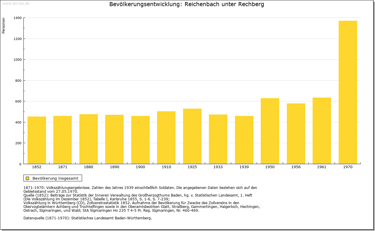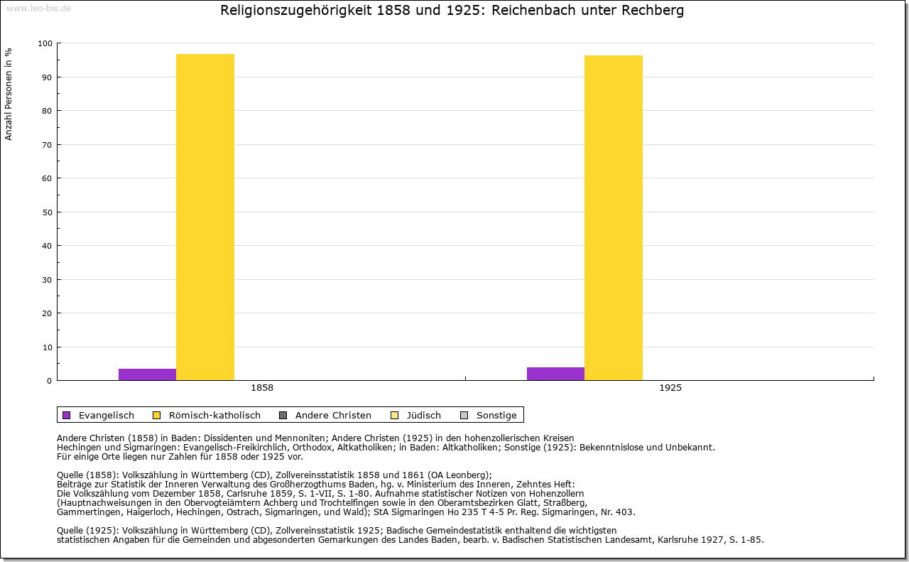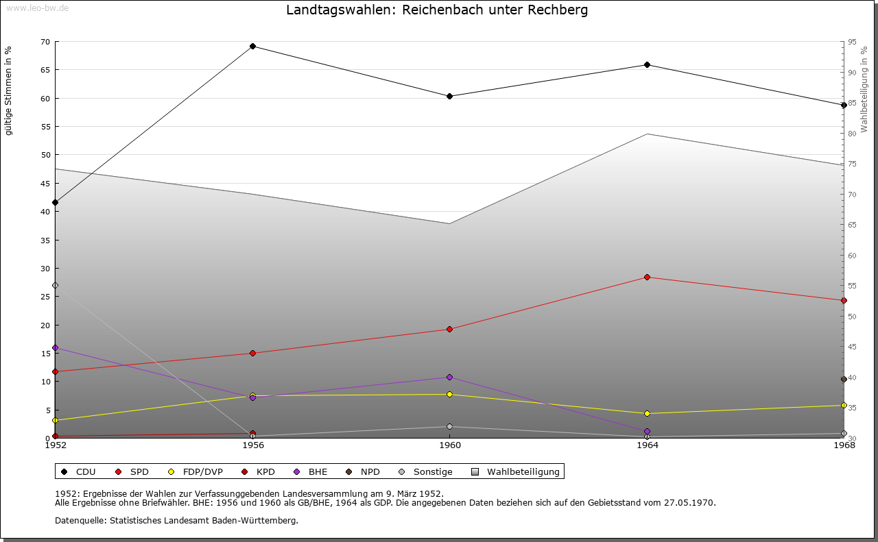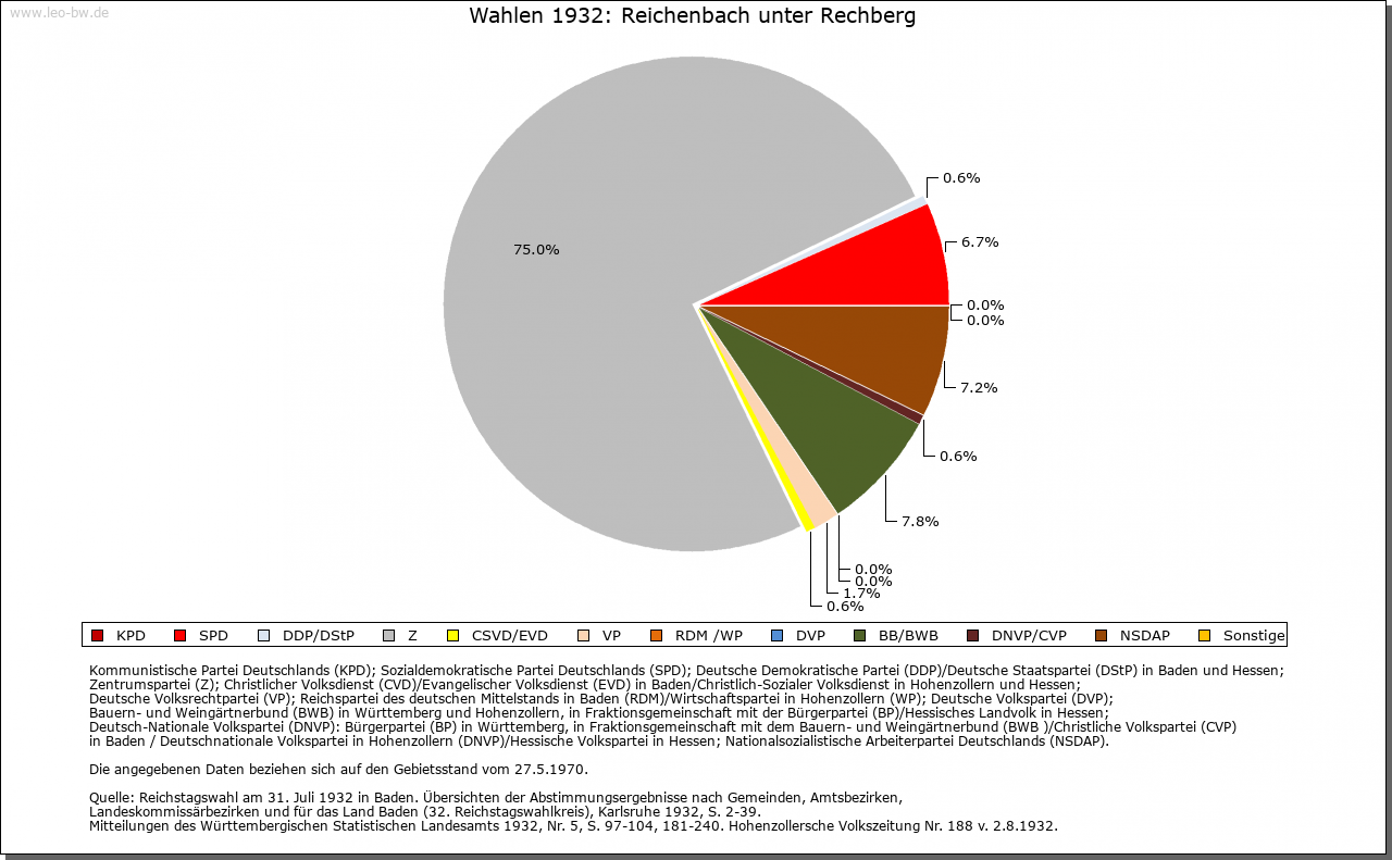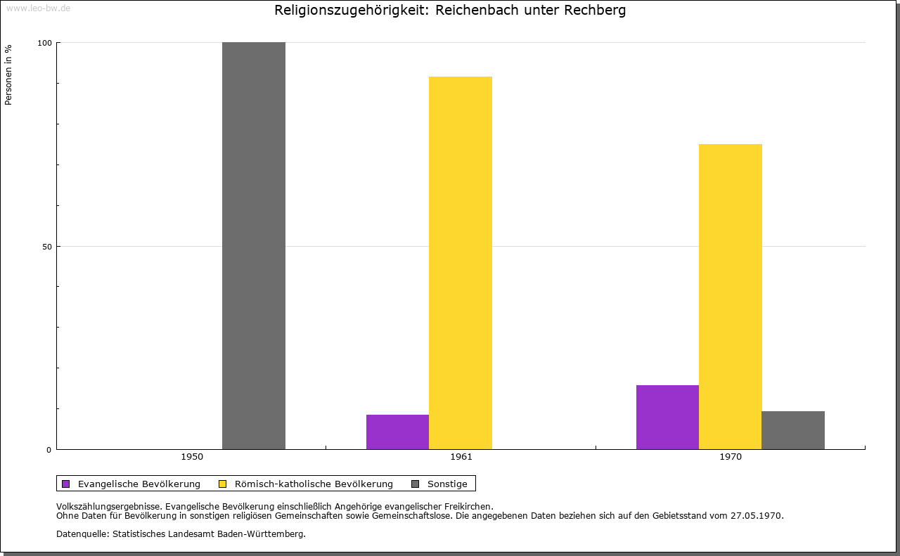 | Geschichte: | 1275 Richenbach (= wasserreicher Bach), wohl in der jüngeren Ausbauzeit des 9.-13. Jahrhunderts entstanden. War im 13. Jahrhundert vielleicht Zubehör der Burg Ramsberg, die 1328 oder früher an die Herren von Rechberg kam; diese erwarben 1446 von den von Schwendi helfensteinischen Lehensbesitz. Später gehörte Reichenbach zur rechbergischen Herrschaft Scharfenberg-Donzdorf und teilte deren Schicksal (vgl. Donzdorf). Fiel 1806 an Bayern, 1810 an Württemberg und gehörte bis 1938 zum Oberamt Schwäbisch Gmünd. War 1940-1950 nach Donzdorf eingemeindet. |