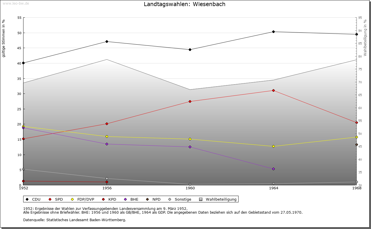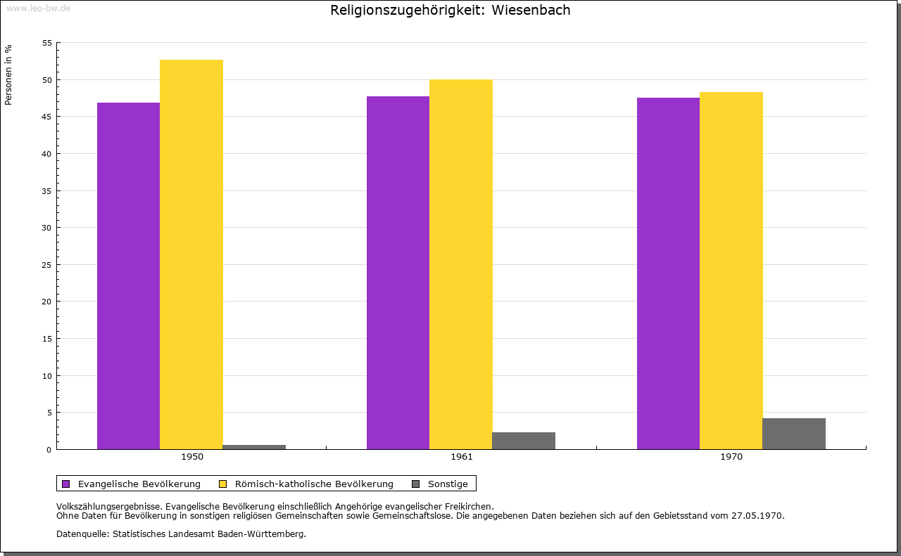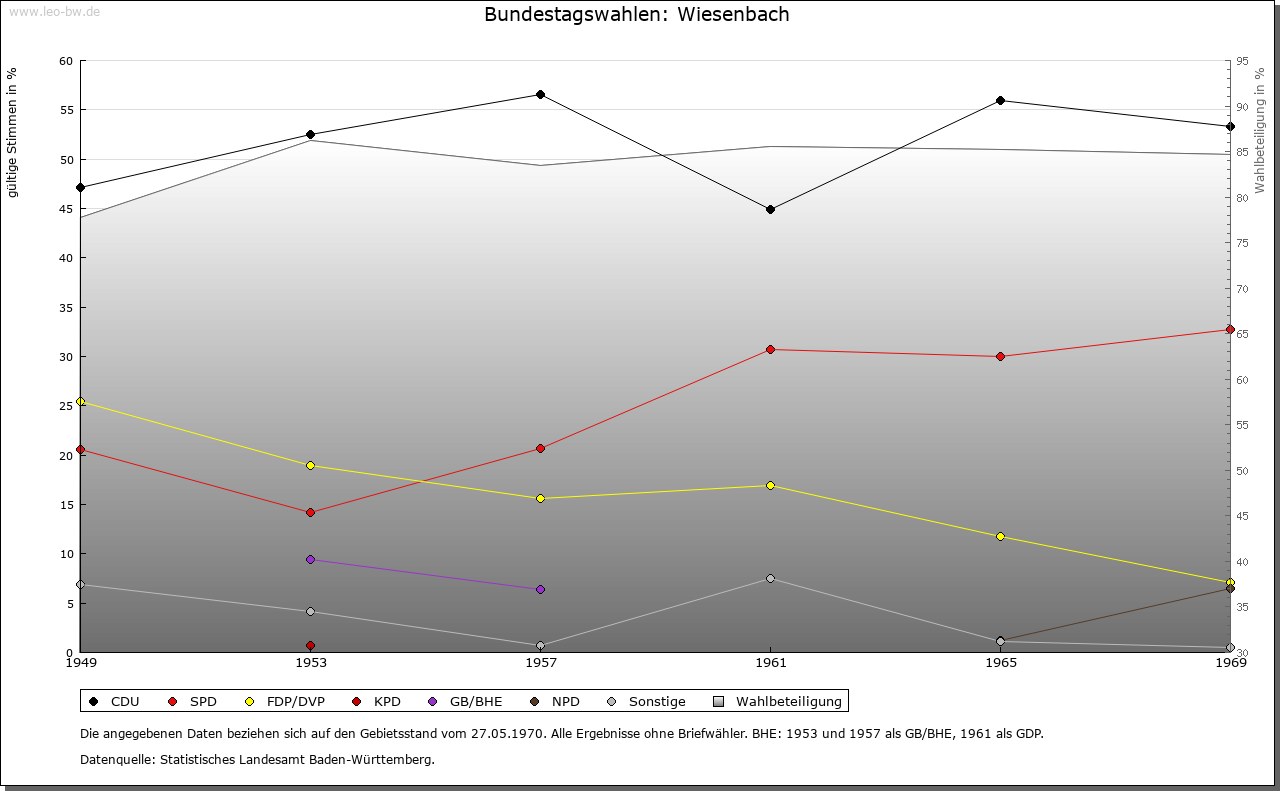 | Geschichte: | 764 Wisinbach (Fälschung 12. Jahrhundert), 1229 Wisenpach, von Wiese (?). Ausbauort der Karolingerzeit. Abgegangene Burg südöstlich des Orts Vorgänger des Dilsbergs, im Besitz der Grafen von Lauffen, wohl von diesen im 12. Jahrhundert mit Grundbesitz an Kloster Ellwangen geschenkt, das die bisherige Propstei Schriesheim, eine reine Güterverwaltung, dorthin verlegte. Die Ortsherrschaft mit dem Dilsberg, die Oberhoheit mit der Meckesheimer Zent um 1330 an die Pfalz. 1803 badisch, Amt Neckargemünd, 1857-1863 Amt Eberbach, dann Heidelberg. |