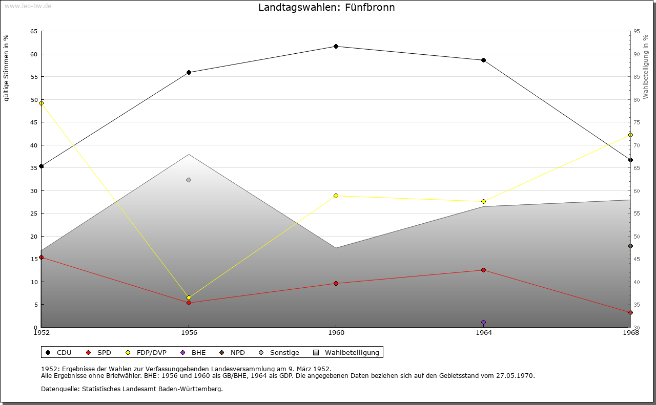 | Geschichte: | 1284 (verschrieben) Taufbrunnen, 1303 Viunfbrunnen. Rodungsweiler im Altensteiger Kirchspiel. 1284 durch Schenkung Wolframs von Altensteig an Kloster Allerheiligen, daneben noch andere Grundbesitzer mit Herrschaftsansprüchen, wie die Müller von Mandelberg, die von Berneck und die Markgrafen von Baden. Nach einer 1478 gegebenen Kundschaft haben sich die Ortseinwohner auf eigene Kosten von ihrem Herrn, wohl dem Kloster, losgekauft und unter württembergischen Schirm begeben, der bereits 1464 nachweisbar ist und durch das Amt Neuenbürg ausgeübt wurde. 1806 vom Oberamt Neuenbürg zu Calw, 1812 zu Nagold, 1938 zum Landkreis Freudenstadt. |