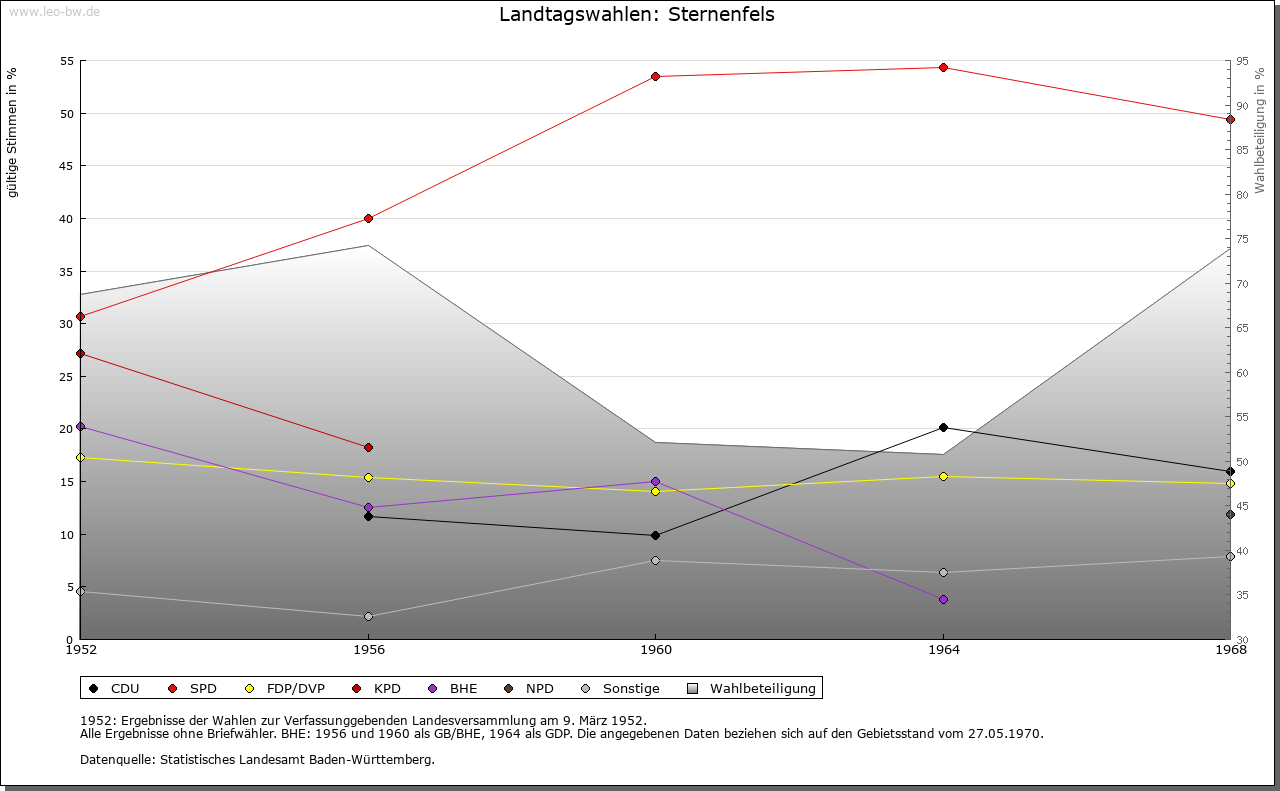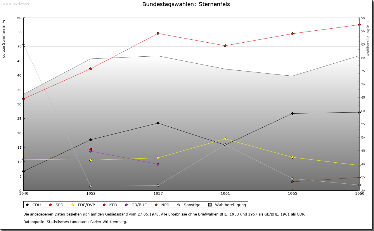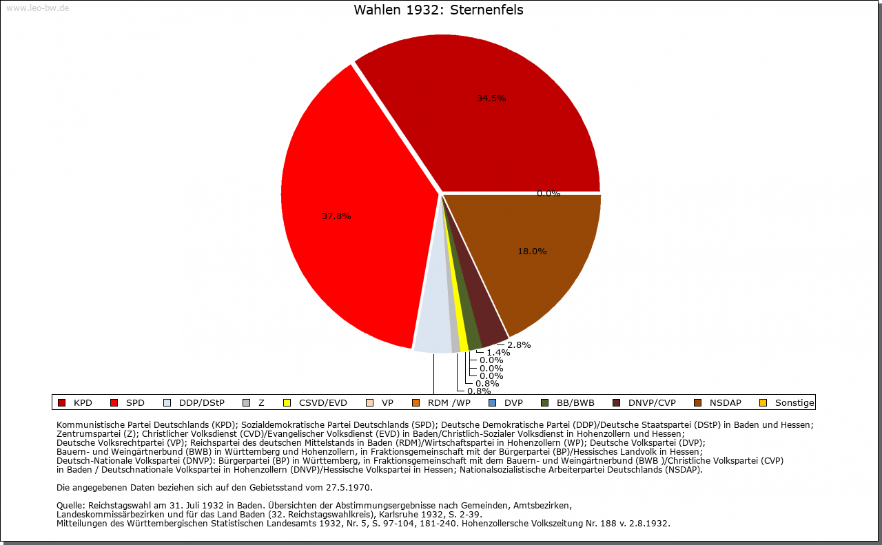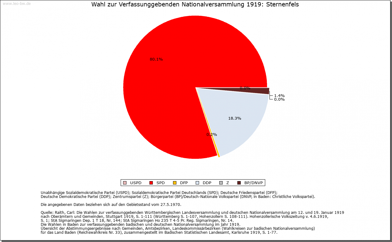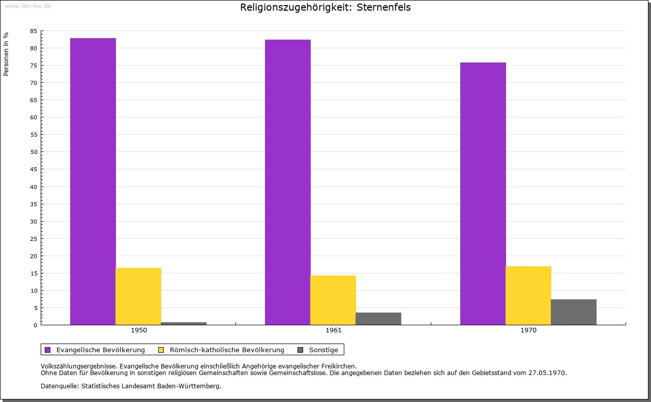 | Geschichte: | 1232 Sterrenvils. Hochmittelalterliche Burgsiedlung, von Kürnbach her angelegt. Burg der Edelfreien von Kürnbach, die sich ab 1232 nach ihrem neuen Sitz nannten, im frühen 14. Jahrhundert im niederen Adel aufgingen, aber durch den Beinamen »Frei« teilweise noch die alte Herkunft betonten. 1320 die Hälfte des Orts durch Engelhard von Liebenstein, einen Verwandten der von Sternenfels, mit Zustimmung der Grafen von Vaihingen als Lehnsherren an Württemberg verkauft. Vor 1381 wurde der ganze Ort württembergisch, 1401 wieder an von Sternenfels und von Wider ausgegeben. 1484 an von Flehingen und darauf an verschiedene andere Adelige, 1524 erneut an die von Sternenfels. Ludwig Bernhard von Sternenfels verkaufte 1749 seine Lehen und sein Eigen, darunter auch Sternenfels, an Württemberg. Die Burg 1778 abgetragen. An ihrer Stelle entstand 1866 ein Aussichtsturm. Im späten 18. Jahrhundert der ganze Ort zum Oberamt Güglingen, seit 1809 Oberamt Maulbronn, 1938 Landkreis Vaihingen. |