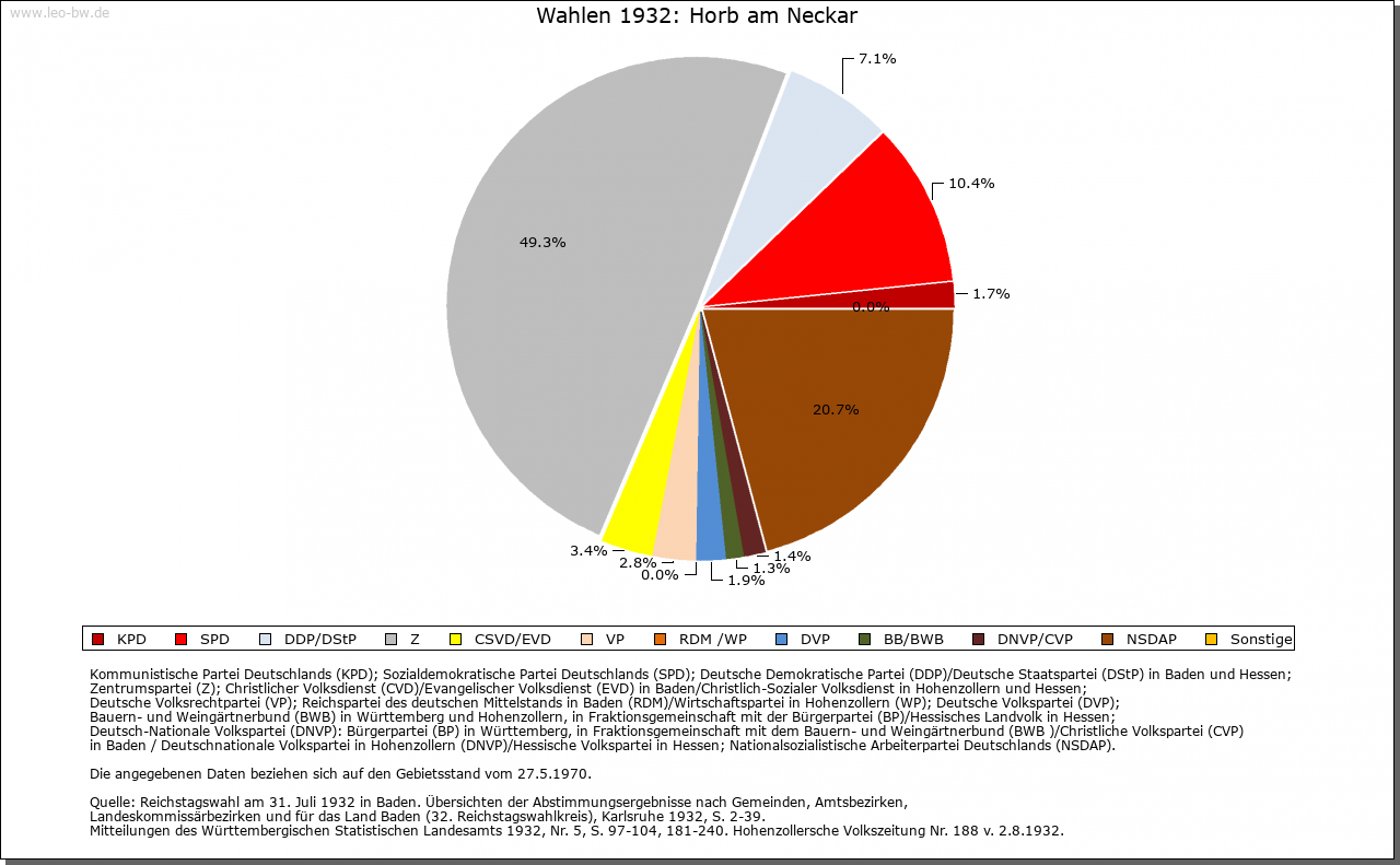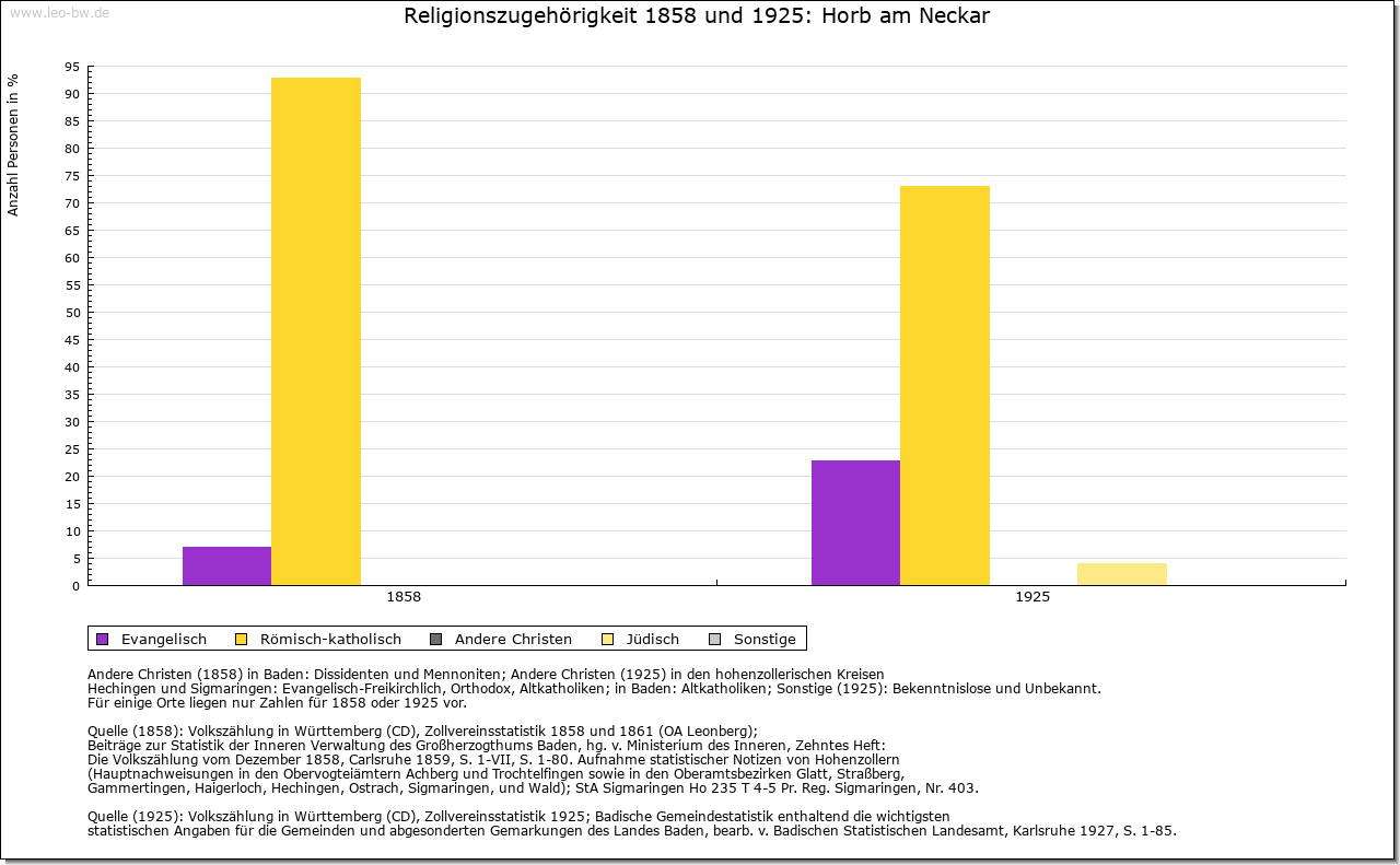 | Jüdische Gemeinde: | Seit Verfolgung von 1348 erst wieder Mitte des 19. Jahrhunderts Juden in Horb. 1903 Gemeindegründung und Friedhof. Gottesdienste in gemietetem Saal, dieser 1938 demoliert, 1939 Gemeinde aufgelöst. |