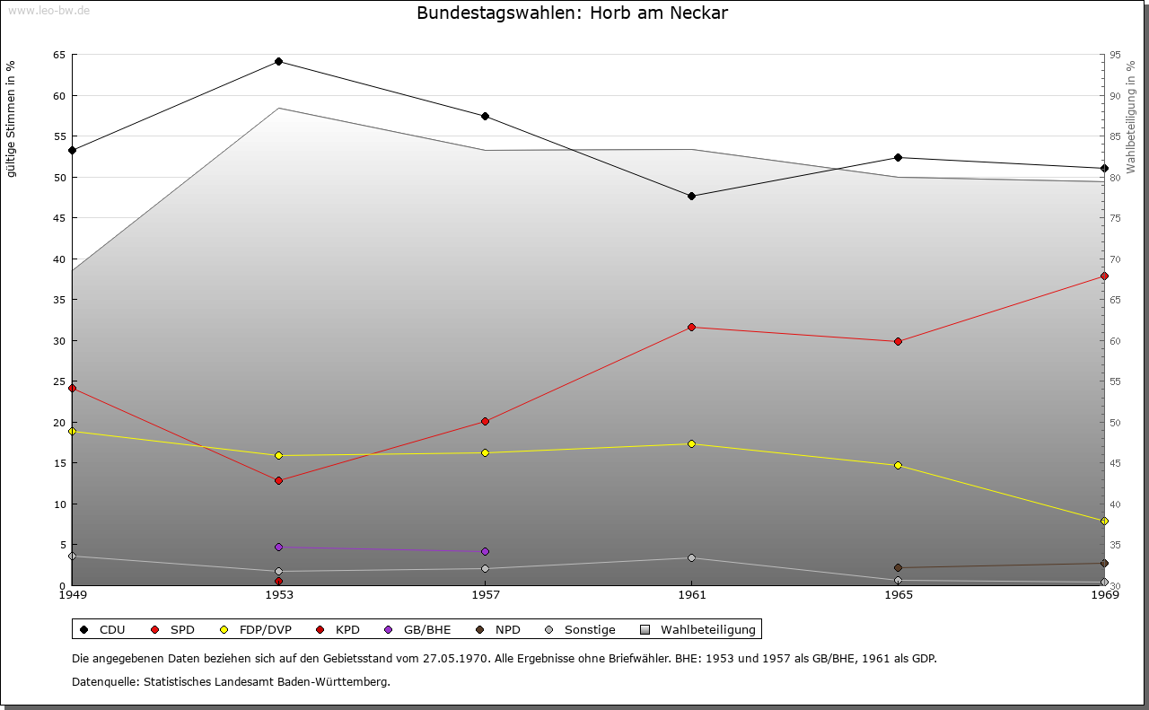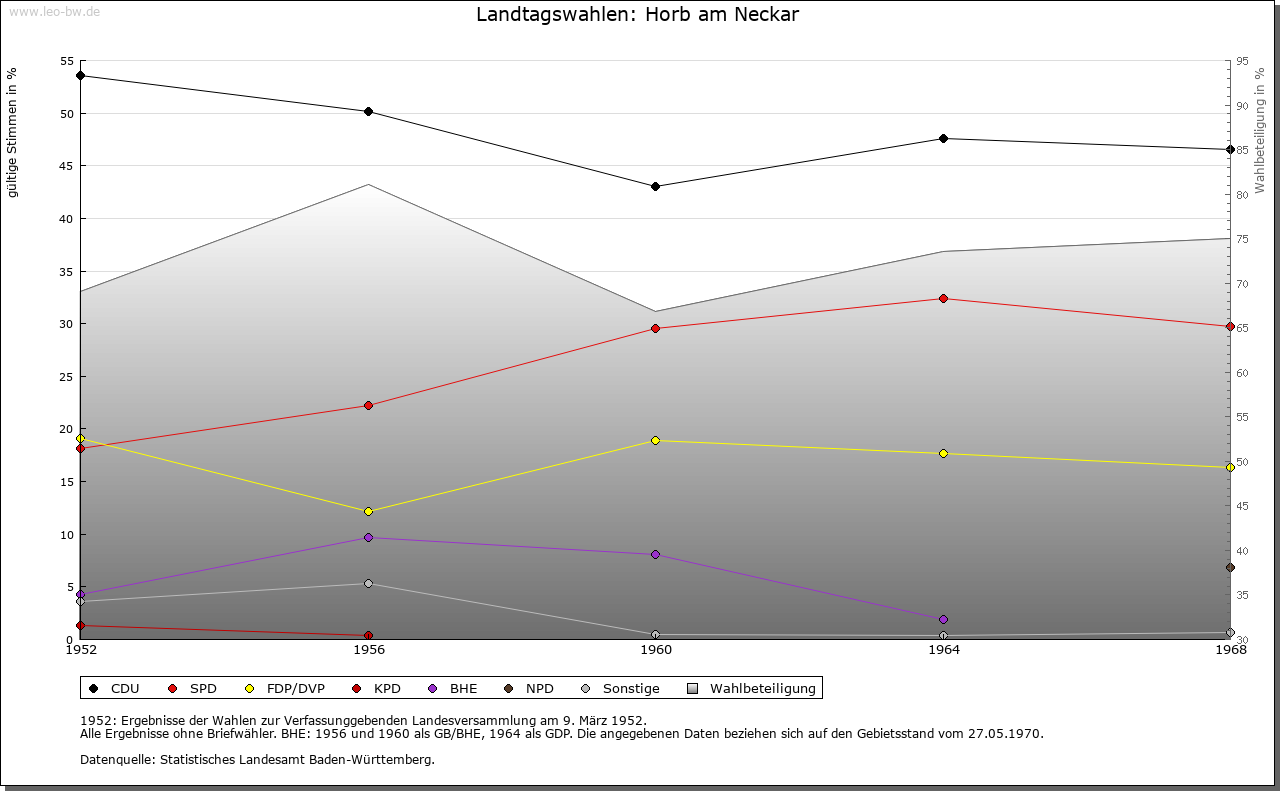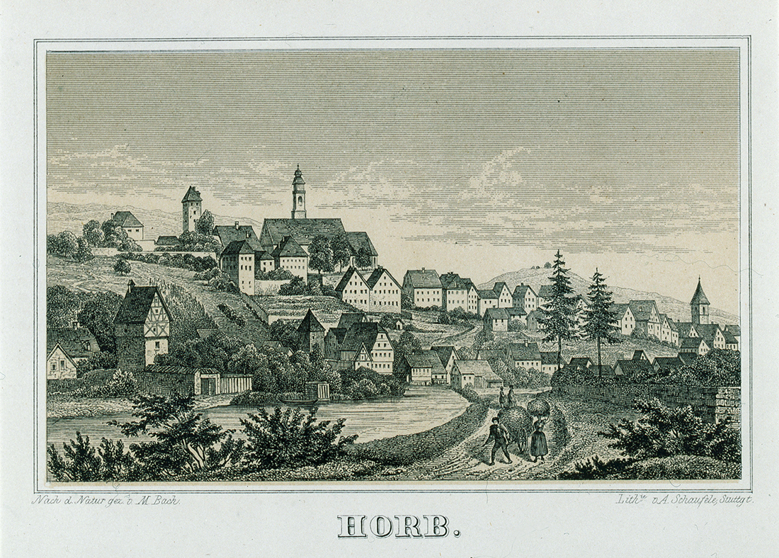 | Geschichte: | Um 1100 Horv, Horwa, Sumpf. Hochmittelalterliche Siedlung im Zusammenhang mit einer Burg, von Ihlingen her und vermutlich auf einst Ihlinger Gemarkung angelegt. Im 12. Jahrhundert Edelfreie von Horb in Beziehungen zu Hirsau und Klosterreichenbach. Seit 1244 ist die Herrschaft der Pfalzgrafen von Tübingen sicher belegt. Grundlage ihrer Herrschaft war nach späteren Lehensbriefen Bamberger Kirchengut. Die Pfalzgrafen, mit einer eigenen Linie in Horb residierend, machten es zur Stadt. 1228 ein Schultheiß, 1265 cives, 1282 Siegel genannt. Die Stadtanlage geht von der unteren, nach 1300 aufgegebenen Burg in der Spitze des Sporns zwischen Neckar und Grabenbach aus. Erhalten blieb von diesem Komplex nur das sogenannte Steinhaus des 14. Jahrhunderts. An die Burg schloß sich der durch die Herren von Ihlingen und die Pfalzgrafen von Tübingen gestiftete Hof von Klosterreichenbach und die Liebfrauenkapelle an. Der obere Teil der Stadt mit zwei Häuserzeilen längs der Mauern zum Steilabfall hin und einem rechteckigen Marktplatz dazwischen ist regelmäßiger gebaut. Er wird abgeschlossen durch die von hoher Mauer umgebene Heiligkreuzkirche und den Schurkenturm, Rest der oberen Burg, die erst um 1300 entstanden sein dürfte. Oberhalb lag vor der Stadt auf der Anhöhe beim Schütteturm eine weitere Befestigung, Außenbefestigung jenseits des Neckars und Ministerialensitz war die Burg Hornau. Im 14. Jahrhundert wurde die Talvorstadt beiderseits des Grabenbachs mit Mauern, die bis auf die halbe Höhe der im Norden anschließenden Hänge reichten, umschlossen. Die Vorstadt am Neckar erhielt spätestens im 15. Jahrhundert ihre im 16. Jahrhundert erweiterte Befestigung. Die Gesamtstadt Ende des Mittelalters nochmals mit einem stärkeren Mauerbering eingefaßt. Von den 9 Toren blieben unter anderem das Ihlinger, das obere Wassertor und das Wassertor am Neckar erhalten. Nach dem Erlöschen der Horber Linie der Pfalzgrafen 1293 traten über eine Erbtochter die Grafen von Hohenberg die Nachfolge an. Graf Rudolf verkaufte 1381 Stadt und Grafschaft an Herzog Leopold III. von Österreich, behielt aber die Nutzung bis zu seinem Tode (1387). Auf dem Wege der Pfandschaft gelangte Horb von 1410 bis 1454 an den Schwäbischen Städtebund und war danach bis 1482 Witwengut der Erzherzogin Mechthild. Darauf wurde es bis 1525 an die Zollern verpfändet. 1606-1618 war Horb wie ganz Hohenberg als Lehen an Markgraf Karl von Burgau ausgetan und 1702 bis etwa 1718 nochmals an Ludwig Johannes Constantin Baron von Ulm versetzt. Horb war Obervogteiamt der Niederen Grafschaft Hohenberg. 1805 von Österreich an Württemberg abgetreten. Dieses bildete 1807 das Oberamt Horb. 1938 Landkreis Horb. - Die Stadt 1556 und 1725 durch Brände fast ganz zerstört. Das Rathaus am Marktplatz 1765 errichtet. Beim Ihlinger Tor der Adelshof der Herren von Ow und das Schlößchen derer von Stuben. Das Spital, 1352 begründet und 1387 durch die Herrschaft dotiert, erwarb einige Dörfer im Umkreis und wurde 1791 ins Franziskanerkloster verlegt. |