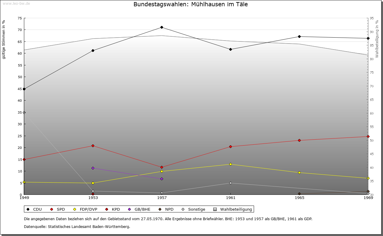 | Ortslage und Siedlung (bis 1970): | Umgeben von bewaldeten Steilhängen im tief in den Albkörper eingesenkten obersten Filstal hat sich der Ort in seinen Randgebieten im Osten (»Brühl« 1955), Südosten (»Kohlhau« 1957, »Anwanden« 1967) und Nordwesten (»Sommerberg« 1963) durch Ein- und Mehrfamilienhäuser nach dem Zweiten Weltkrieg baulich vergrößert. Nahe der Eisenbahn siedelte sich im Nordosten und Norden (Gewann »Breitwiesen«) 1955 bzw. 1970 Industrie an. |