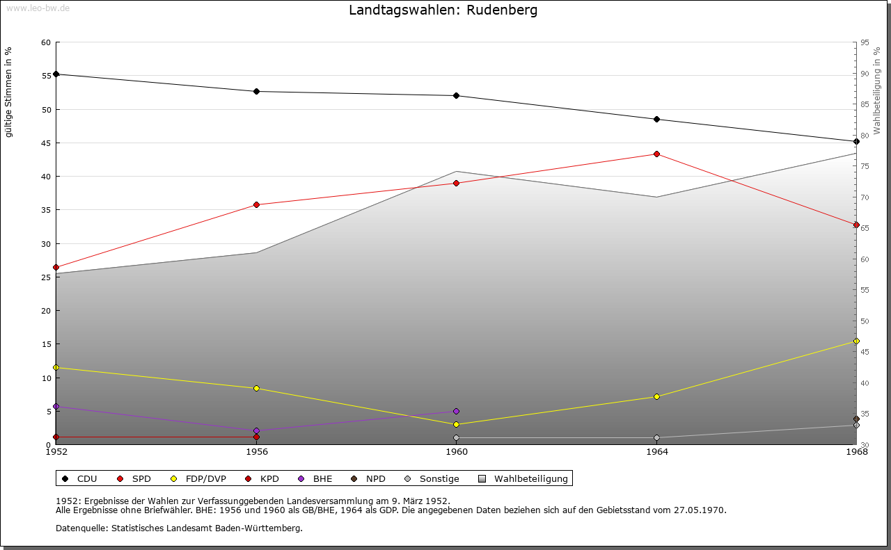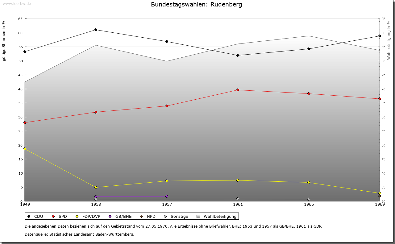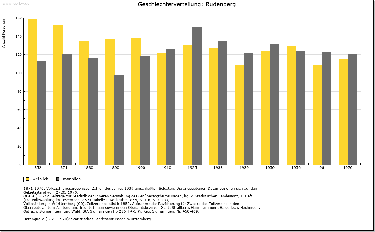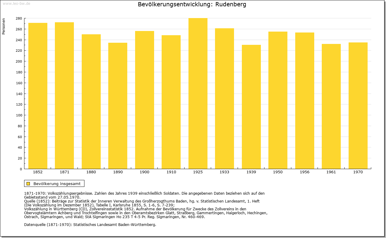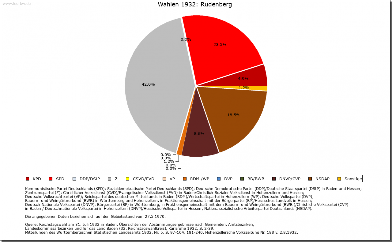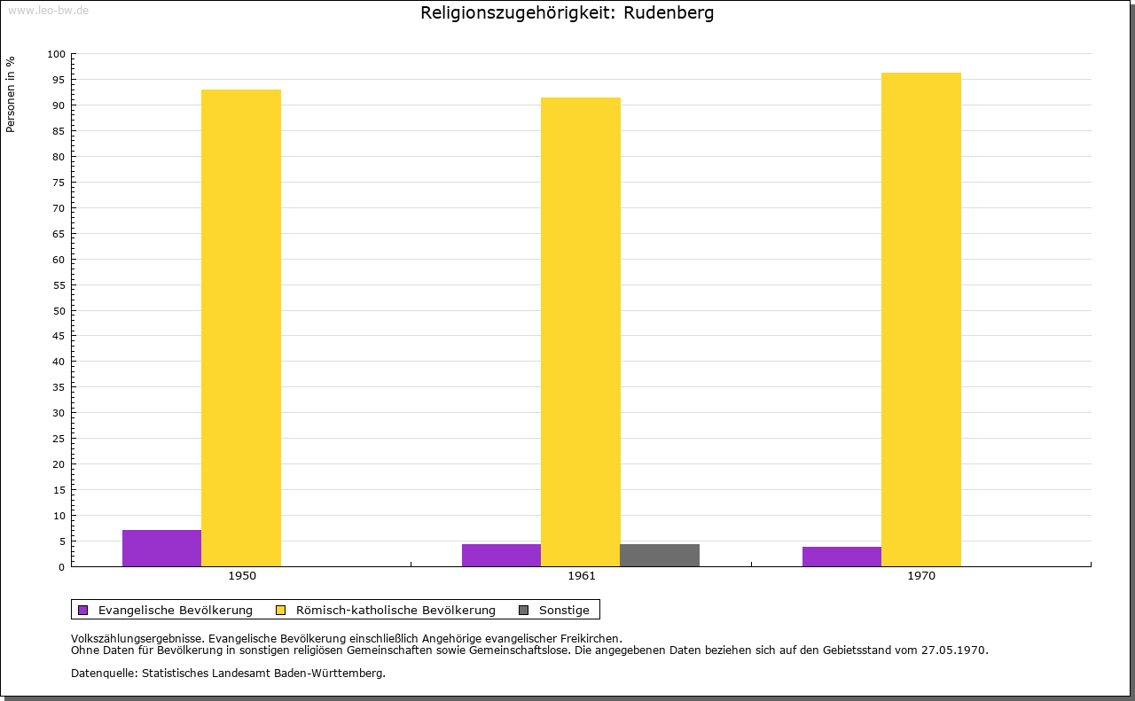 | Geschichte: | 1316 (Корialüberlieferung 17. Jahrhundert) Rudenberge. Ausbauort des Klosters Friedenweiler. 1409 saß ein fürstenbergischer Lehensmann als Meier in Rudenberg. Zum engeren Klostergebiet von Friedenweiler gehörig, blieb der Ort bis 1806 unter fürstenbergischer Oberhoheit, Amt Vöhrenbach, gelangte dann an Baden. 1807 Amt/Landkreis Neustadt. |