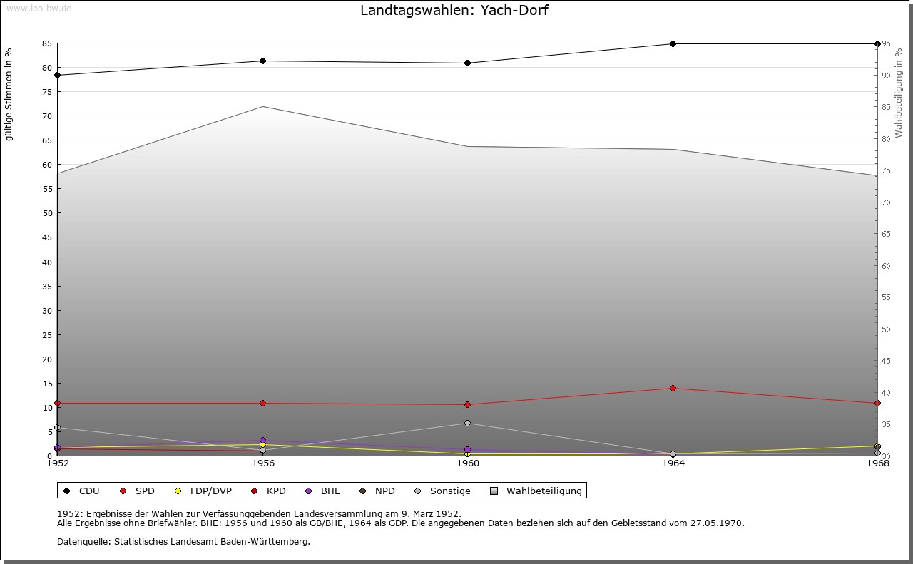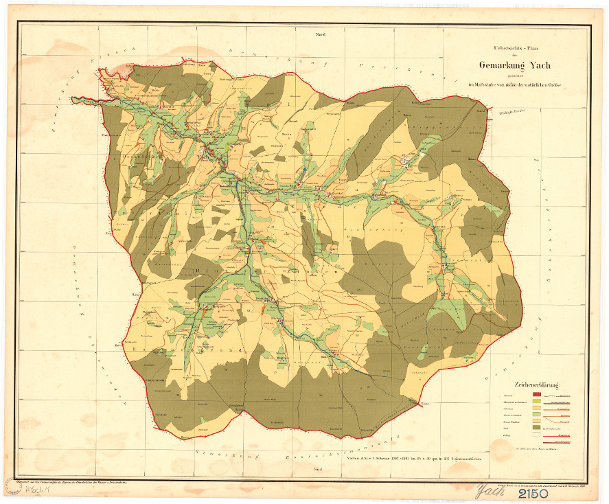 | Ortslage und Siedlung (bis 1970): | Streusiedlung in den Tälern des Yachbachs und seiner Quellbäche. Die Einzelhöfe liegen meist am Hangfuß, oft an der Einmündung kleiner Seitenbäche auf deren Schwemmkegel. Im mittleren Yachbachtal ist die Siedlung etwas dichter (Dorf). |